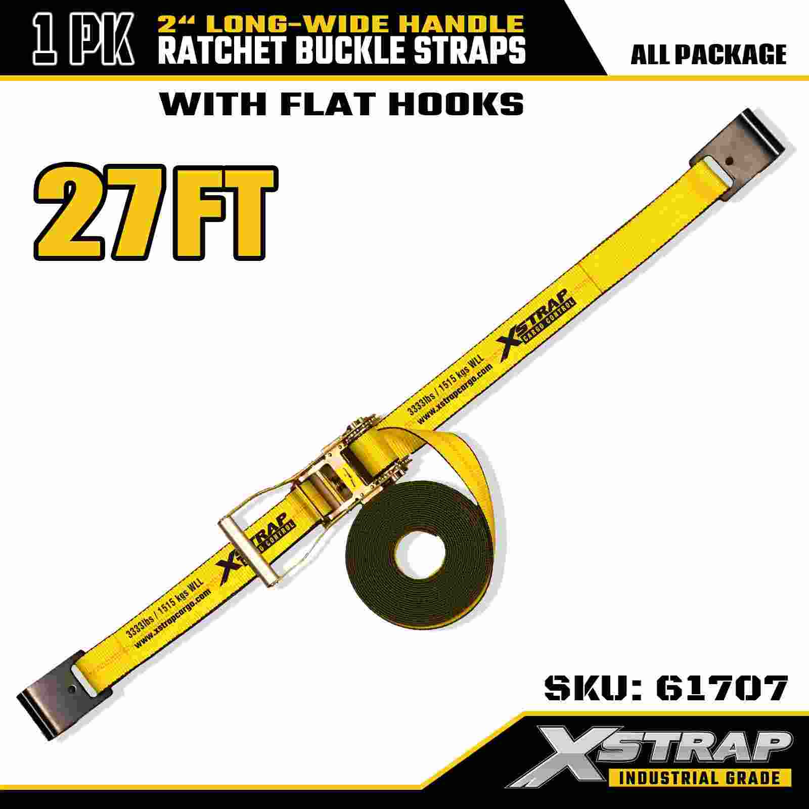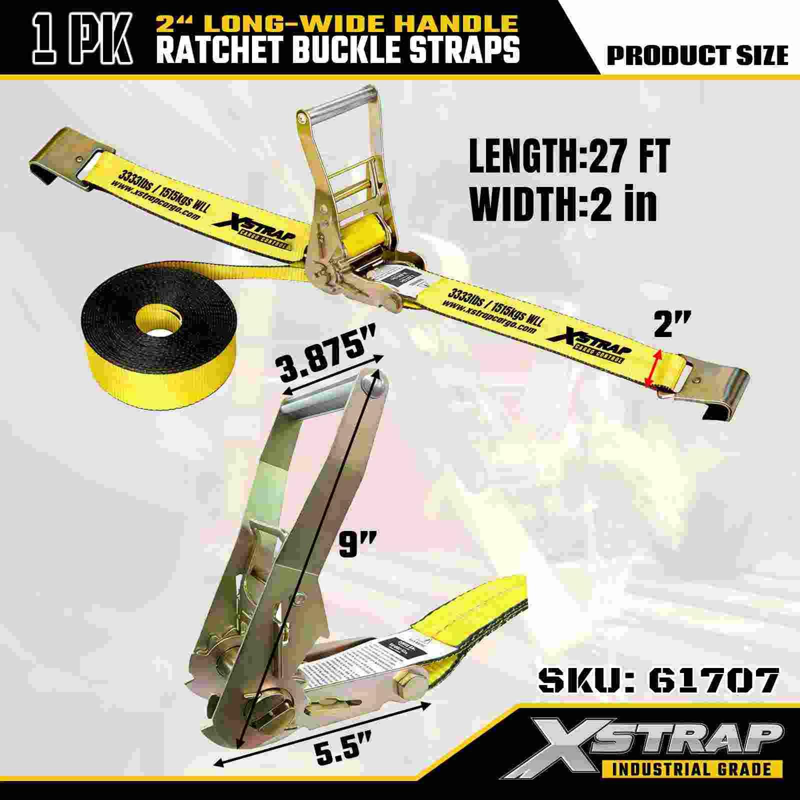 Xstrap 61707 Ráčnové popruhy s dlouhou širokou rukojetí 2" x 27 stop (1-balení) - Ploché háky, pevnost v přetržení 10 000 lb, poutací popruh pro vysoké zatížení pro bezpečnou přepravu