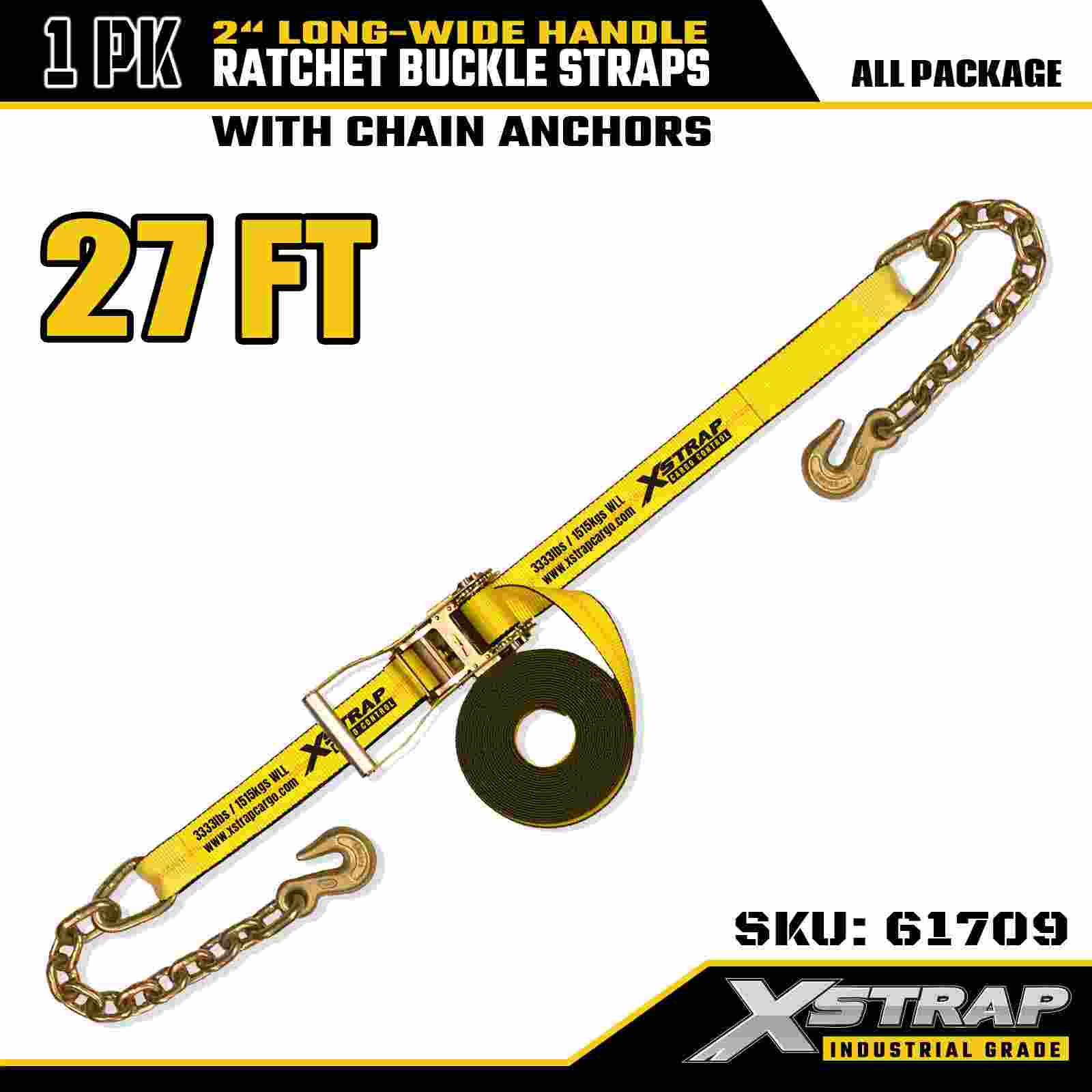 Xstrap 61709 Popruhy s ráčnovou přezkou s dlouhou širokou rukojetí 2" x 27 stop (1 balení) s Řetězové háky, pevnost v přetržení 10 000 liber, poutací popruh pro vysoké zatížení pro bezpečnou přepravu