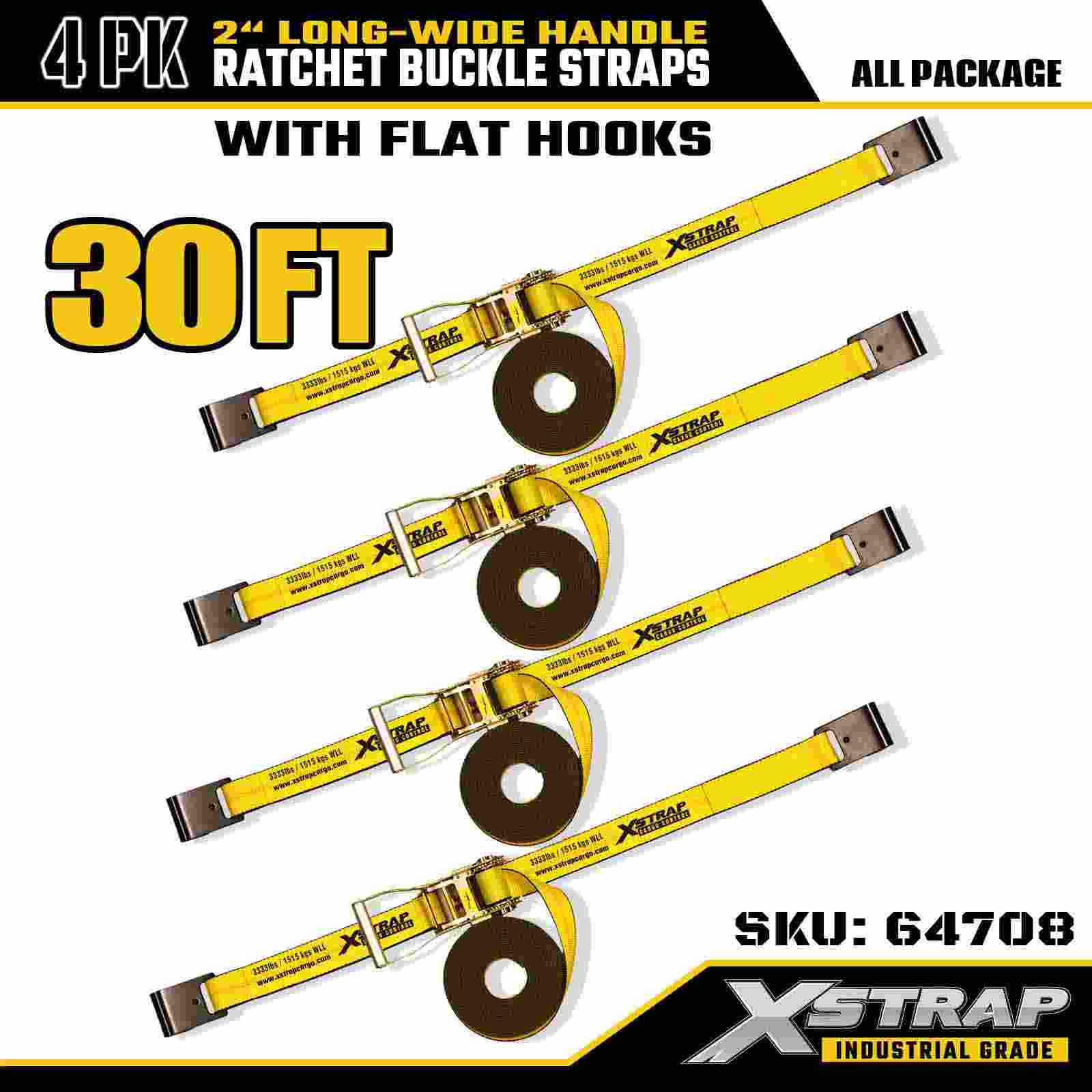 Xstrap 64708 2" x 30 stop popruhy s ráčnovou přezkou s prodlouženou rukojetí (4-balení) – ploché háky, jmenovitá pevnost 10 000 lb, průmyslové řešení kontroly nákladu
