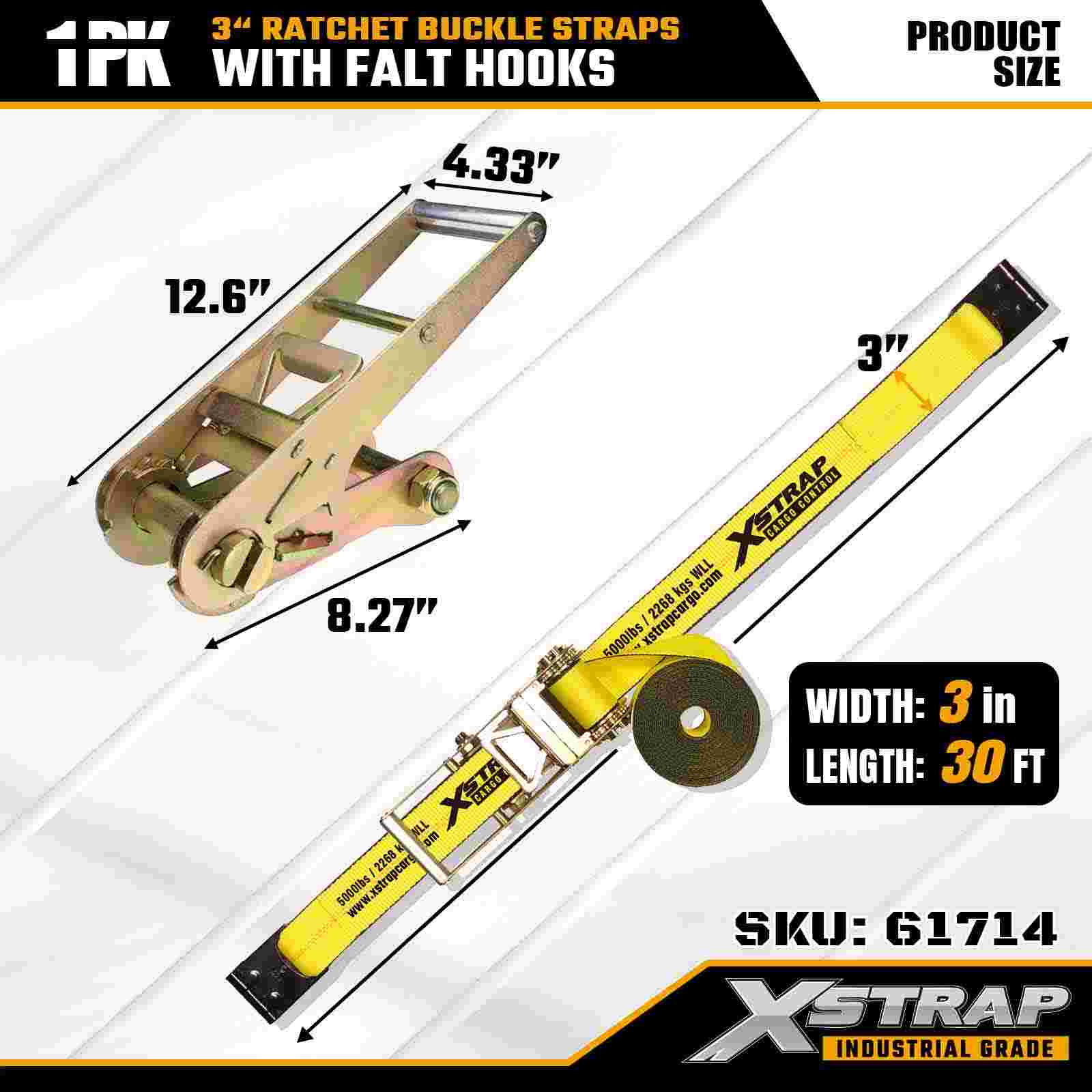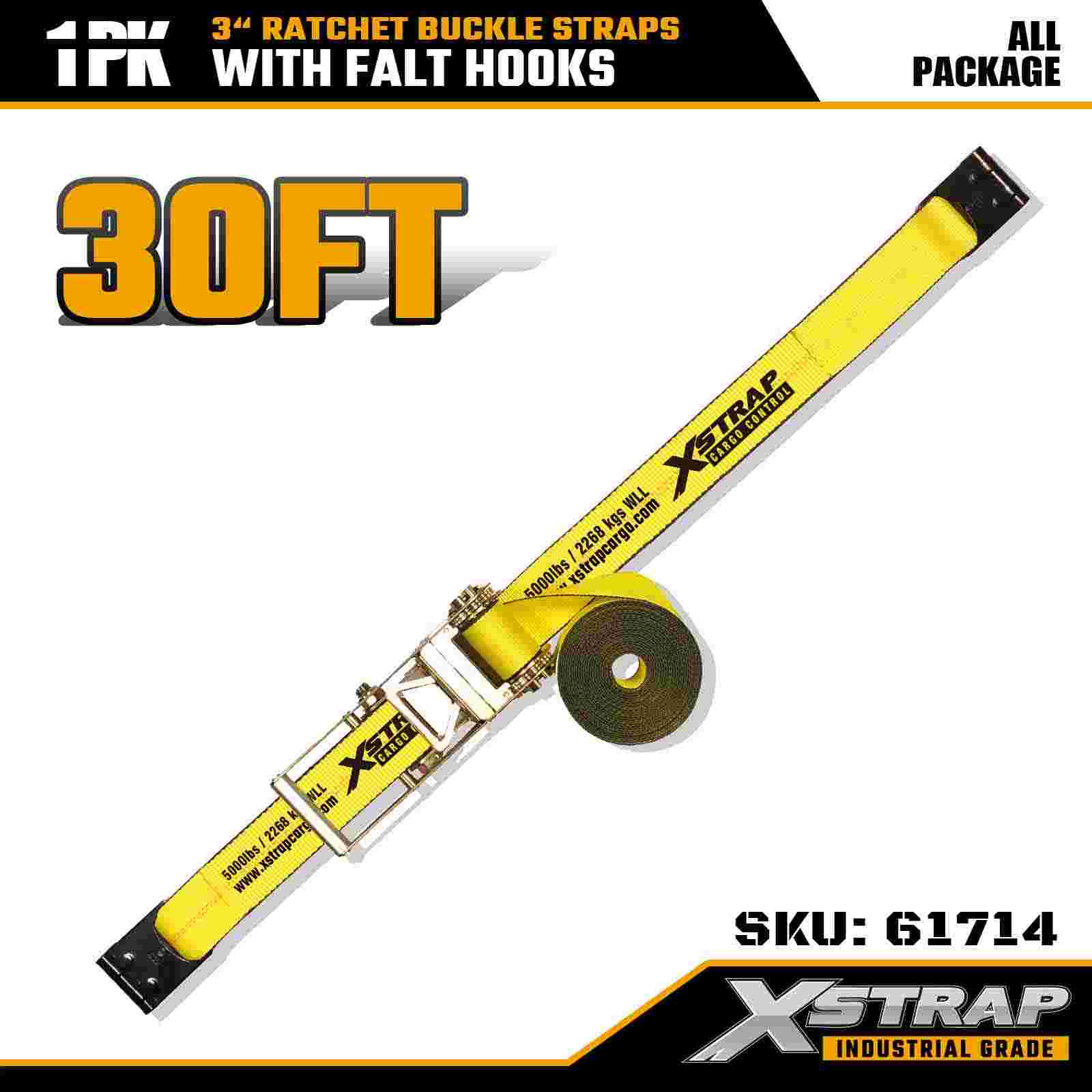Xstrap 61714 3" x 30 stop popruhy s ráčnovou přezkou (1 balení) – ploché háky, nosnost 5 000 lb, pevnost v přetržení 15 000 lb, uchycení pro velké zatížení pro nákladní automobily, přívěsy a průmyslovou nákladní dopravu.