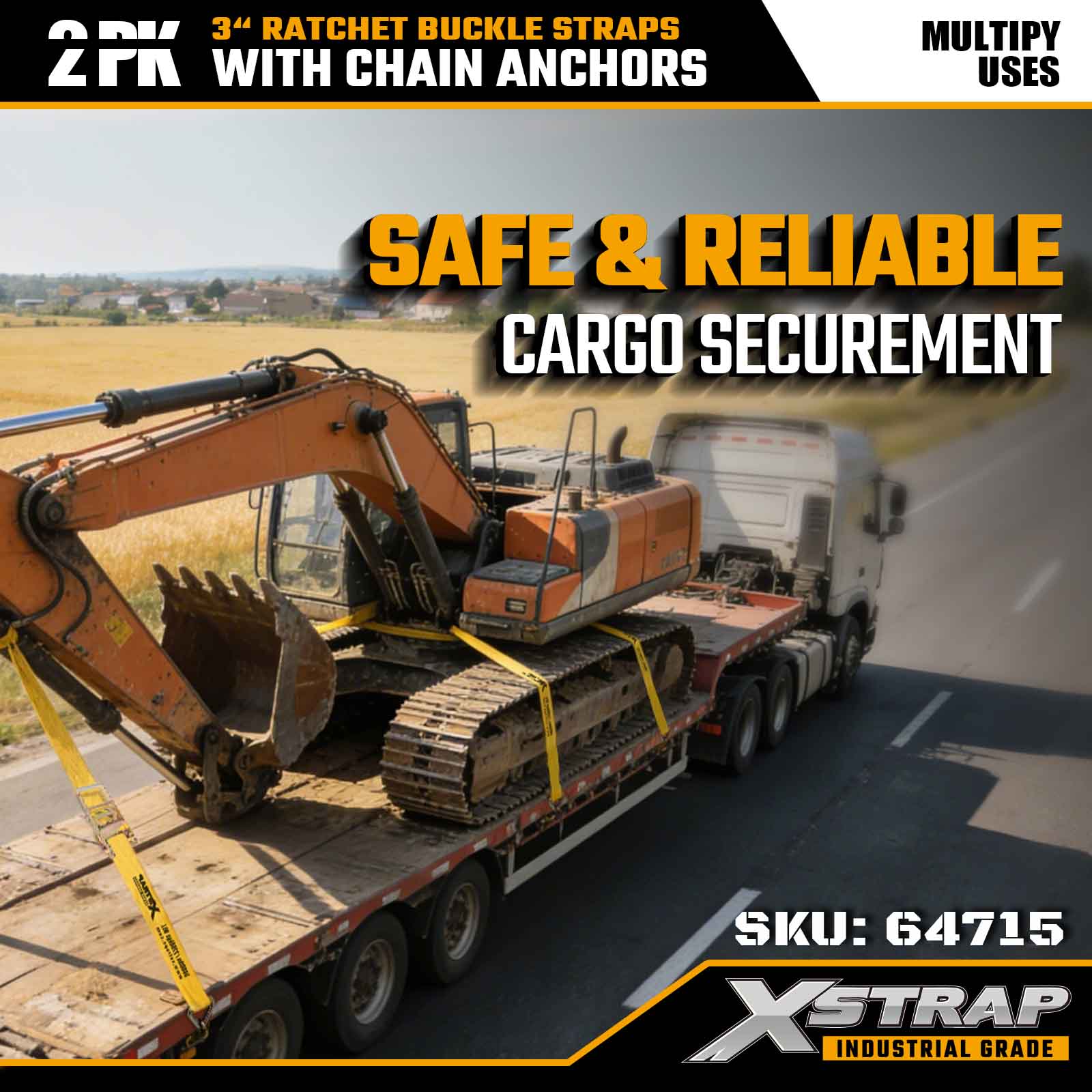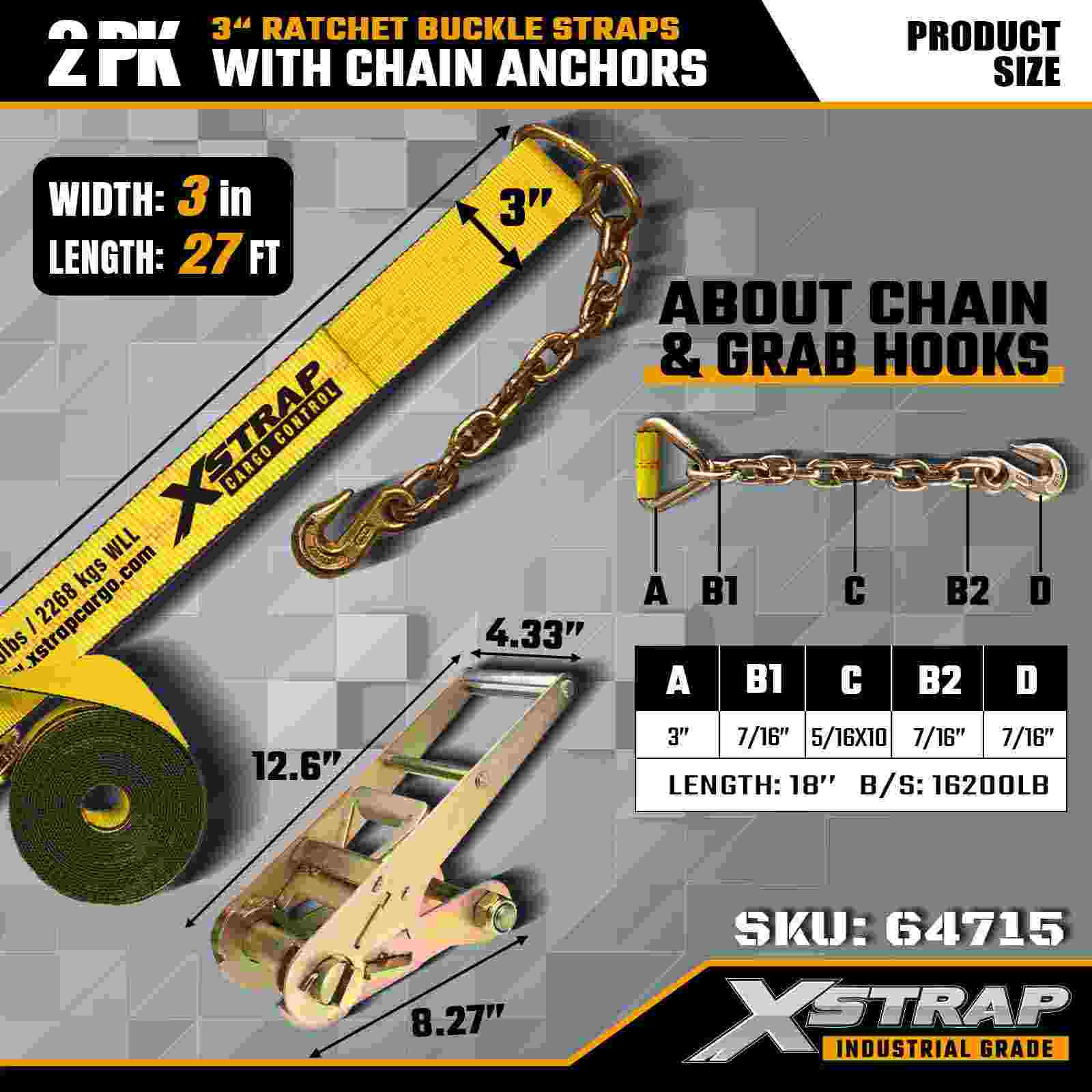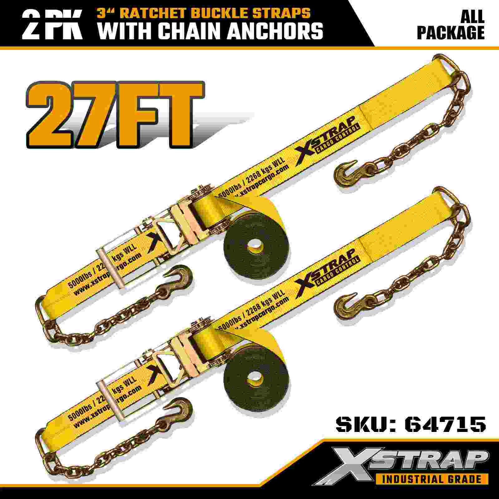 Xstrap 64715 3" × 27 stop ráčnové přezkové popruhy (2-balení) – vybavené odolnými řetězovými kotvami, navrženými pro náročná nákladní prostředí. S maximální pracovní zátěží 5 000 lb a pevností při protržení 15 000 lb poskytují tyto popruhy bezpečný, stabilní a stabilní průmyslový transportní stroj.