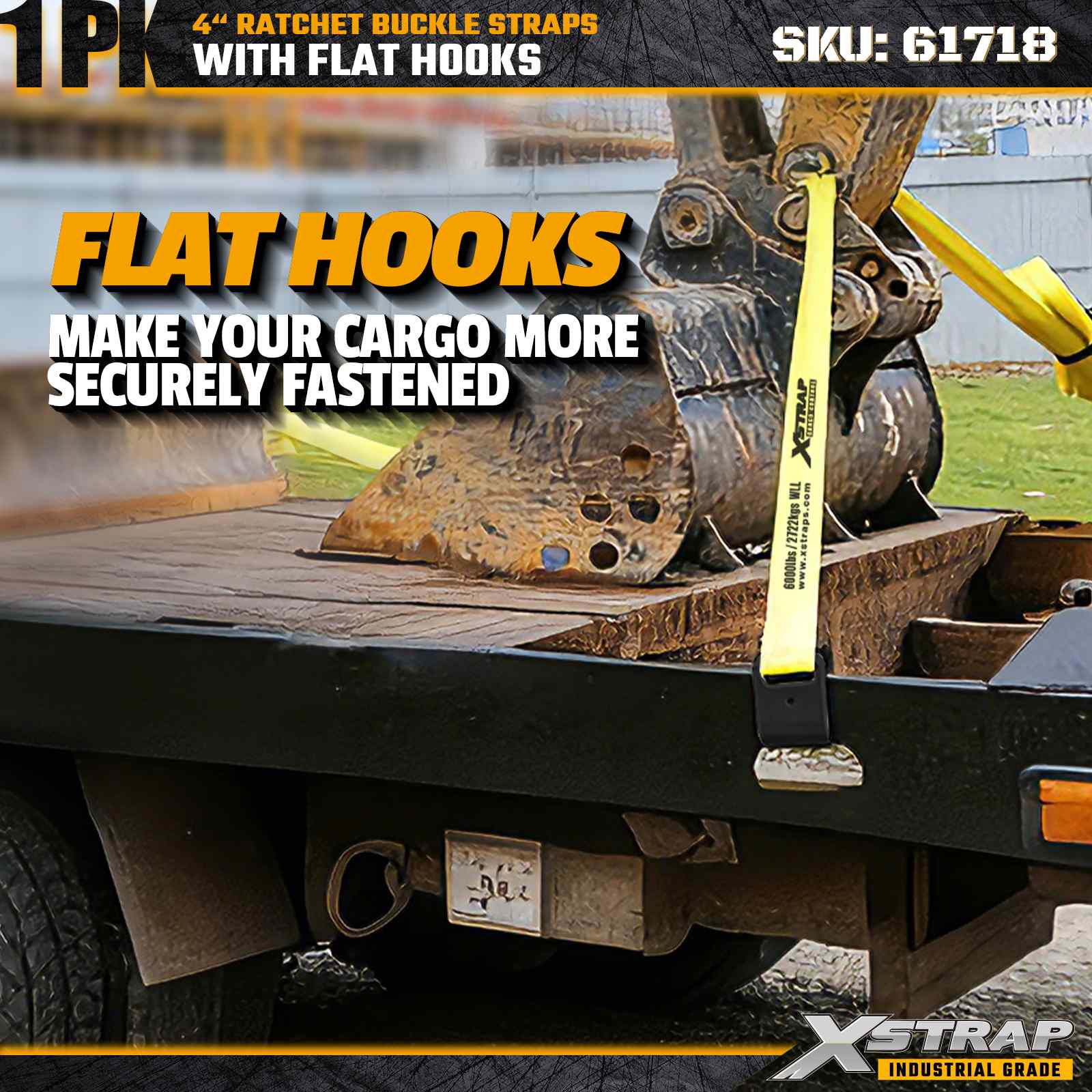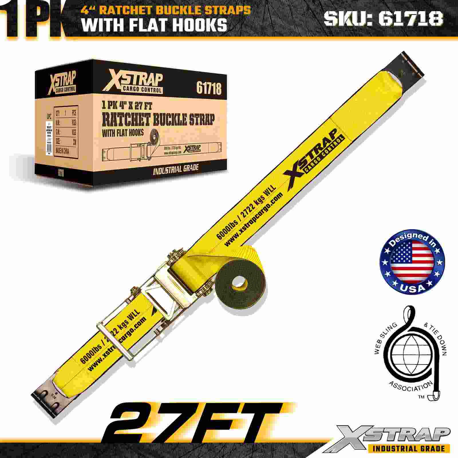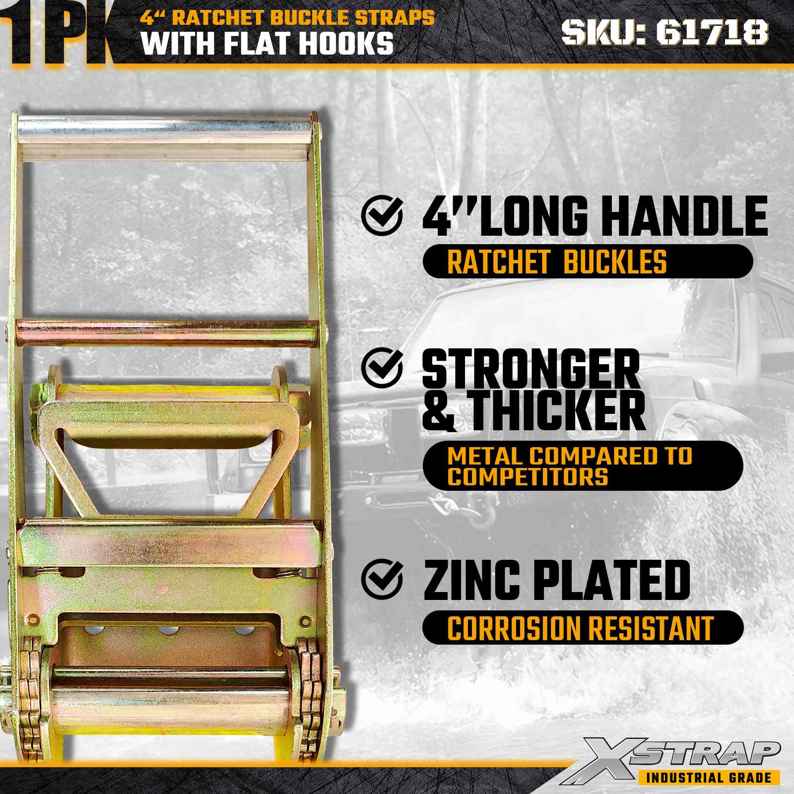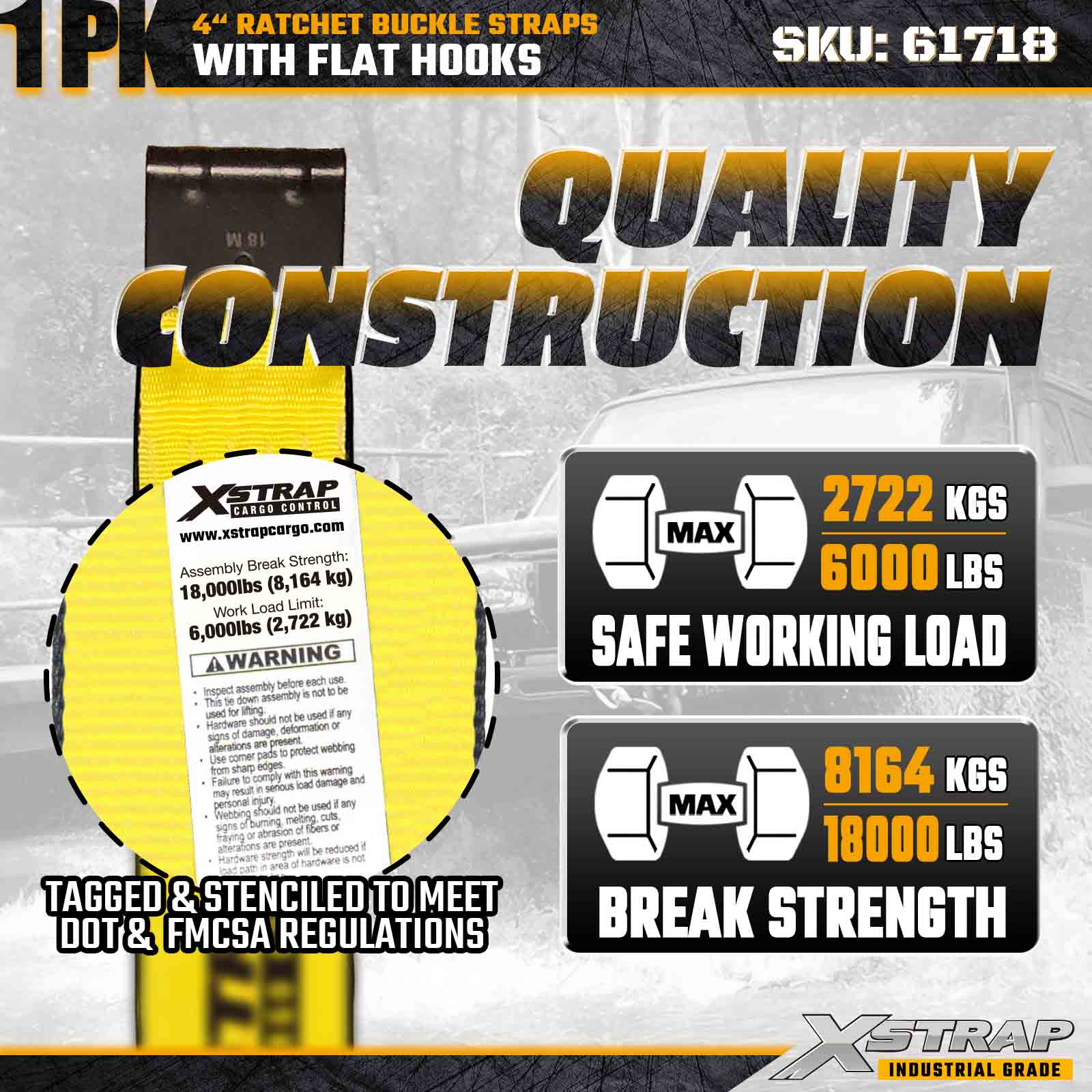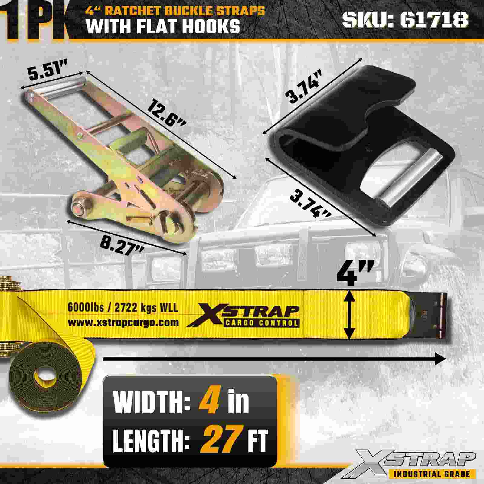 Xstrap 61718 4" × 27 stop ráčnový přezkový popruh (1-balení) je vyroben pro extrémní zabezpečení nákladu, obsahuje zesílené ploché háky a odolný ráčnový mechanismus. S maximální pracovní zátěží 6 000 lb a pevností 18 000 lb, pevností v přetržení pro profesionální přepravní stroje a průmyslovými konstrukčními materiály. logistika, kde je nezbytná maximální síla a spolehlivost.