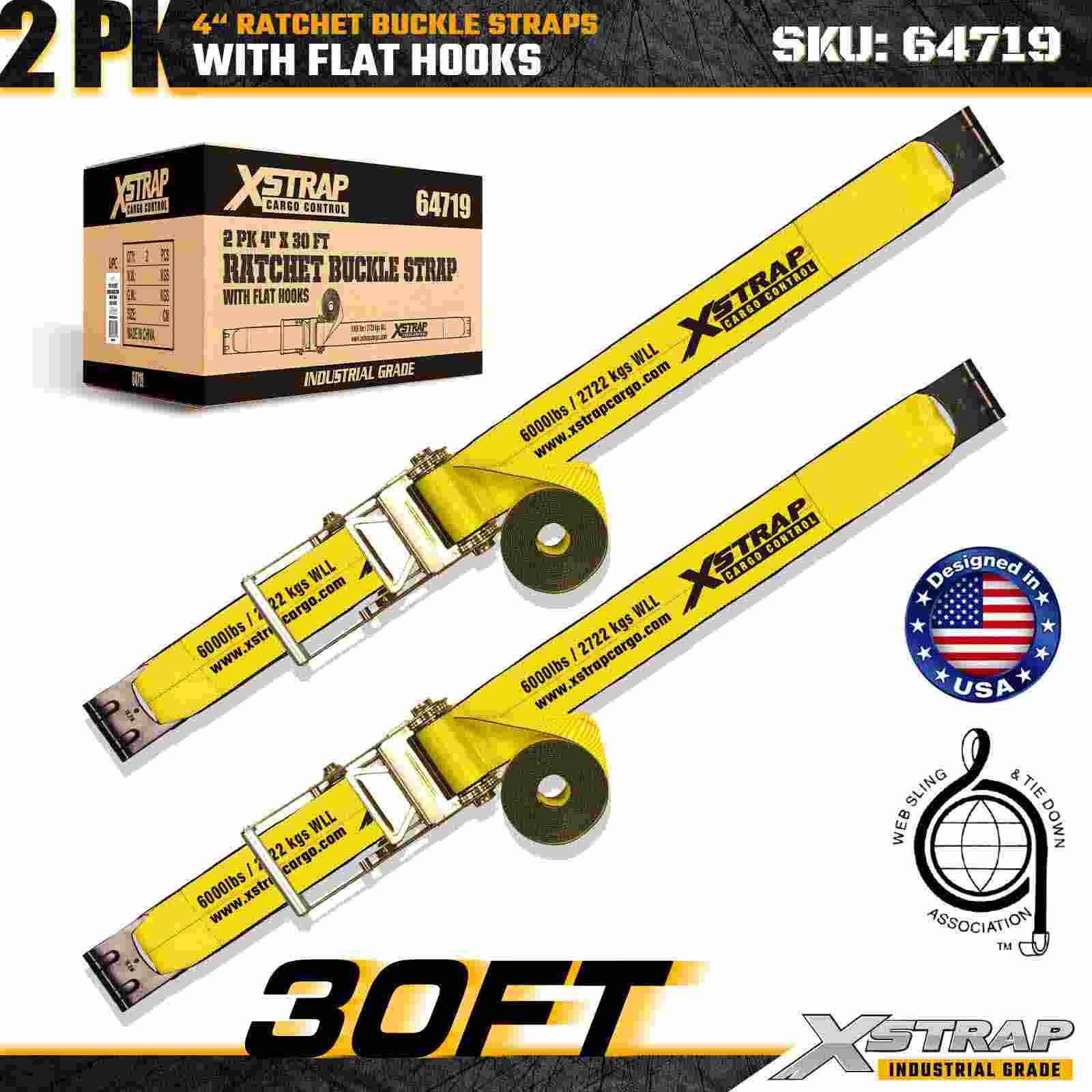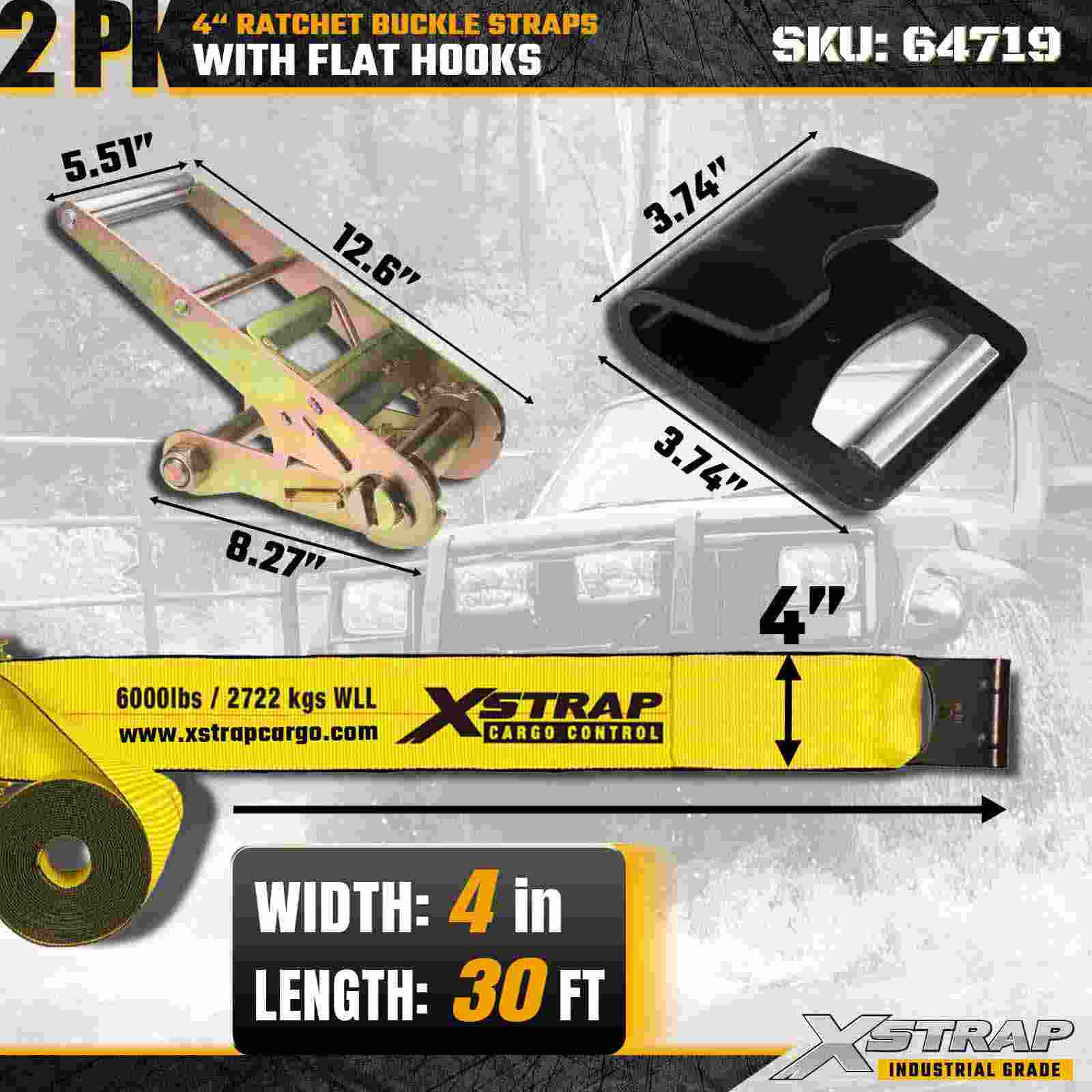 Xstrap 64719 4" × 30 stop ráčnové přezkové popruhy (2-balení) poskytují odolné zajištění nákladu se zesílenými plochými háky a odolným ráčnovým mechanismem. Jmenovité na 6 000 lb WLL a 18 000 lb na pevnost v přetržení, jsou ideální pro použití při přepravě strojů, nákladních automobilů a průmyslových aplikací.