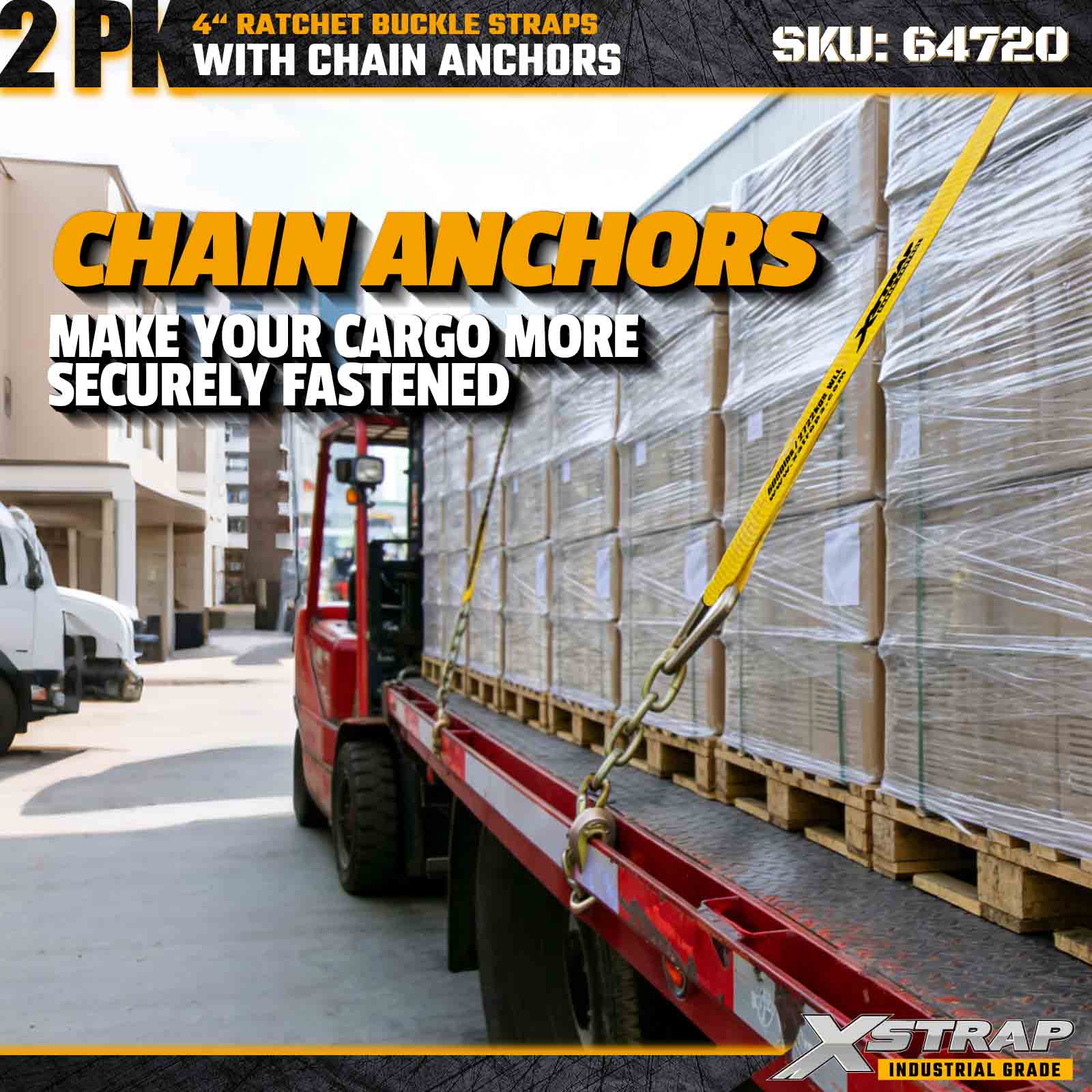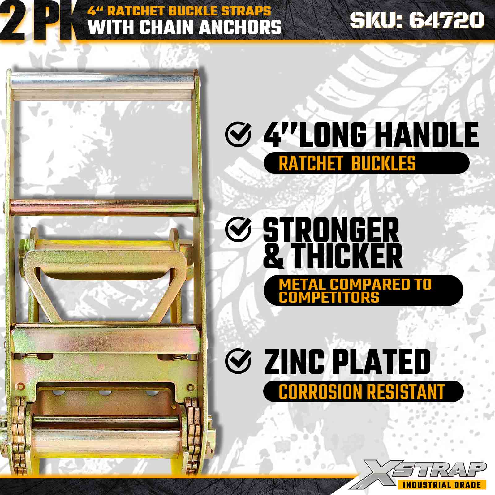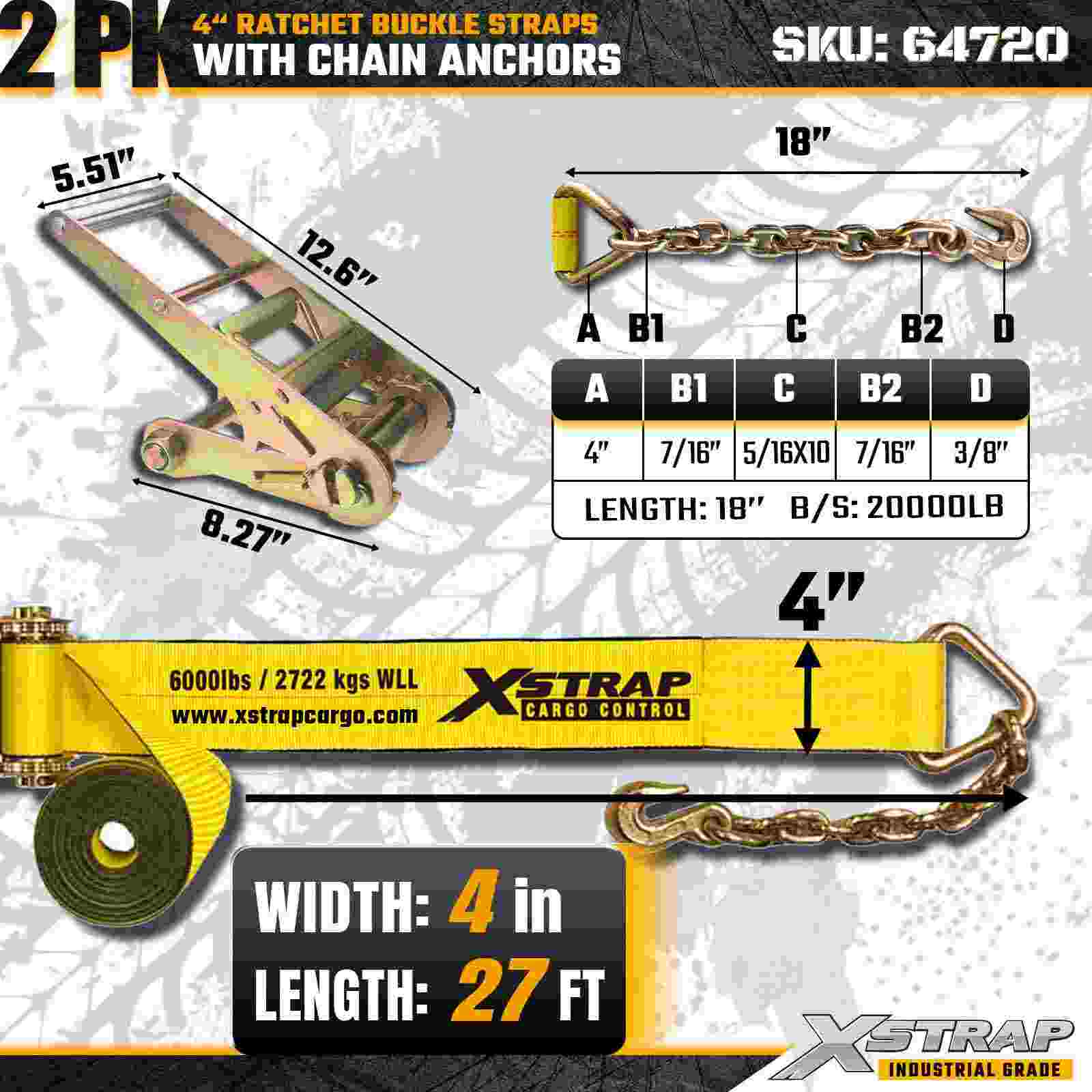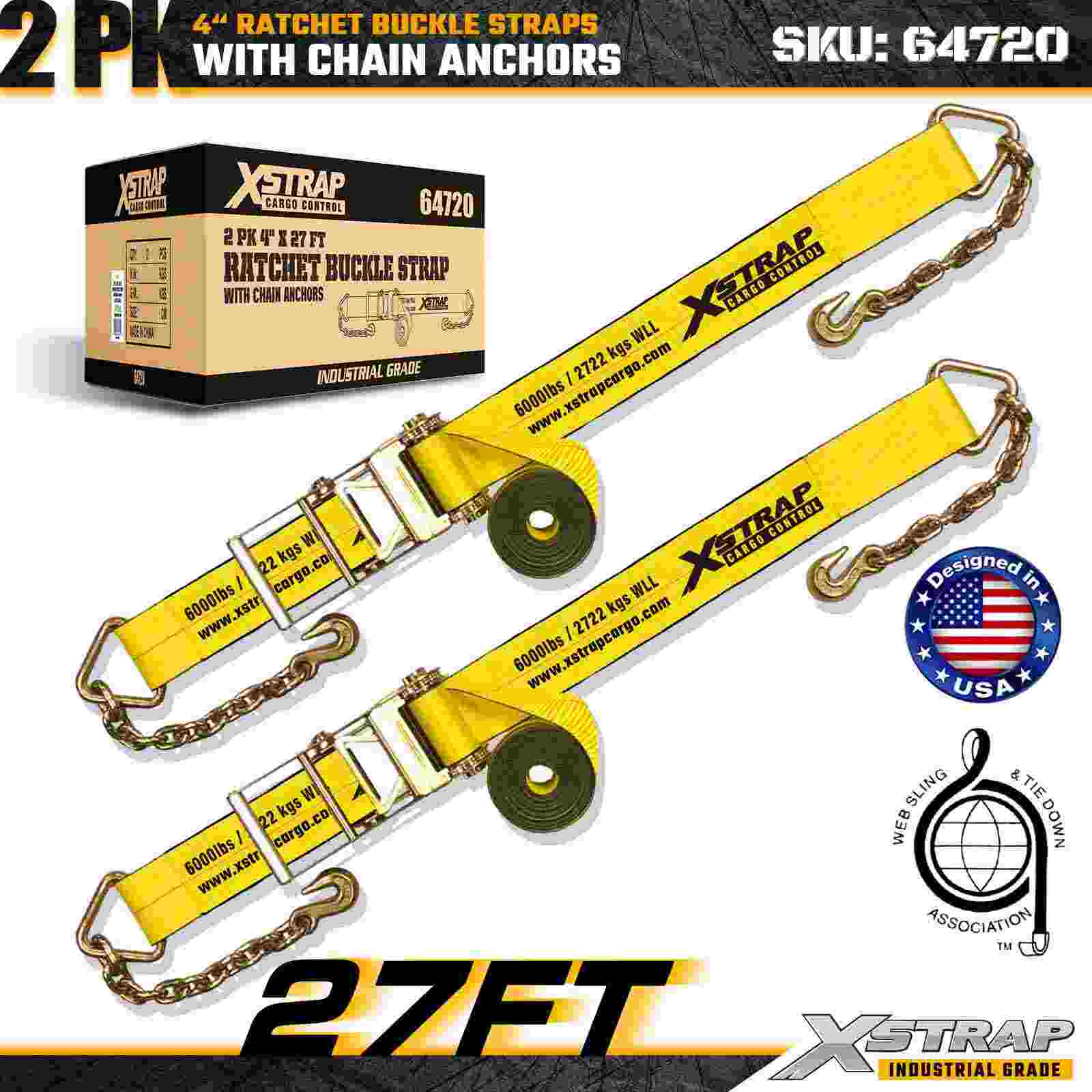 Xstrap 64720 4" × 27 stop ráčnové přezkové popruhy (2-balení) jsou navrženy pro zajištění těžkého nákladu, obsahují robustní řetězové kotvy a zesílený ráčnový mechanismus. S maximální pracovní zátěží 6 000 lb a 18 000 lb jsou ideální ocelové popruhy s pevností v přetržení a pro ploché přepravní stroje. nákladní aplikace vyžadující maximální pevnost a spolehlivost.