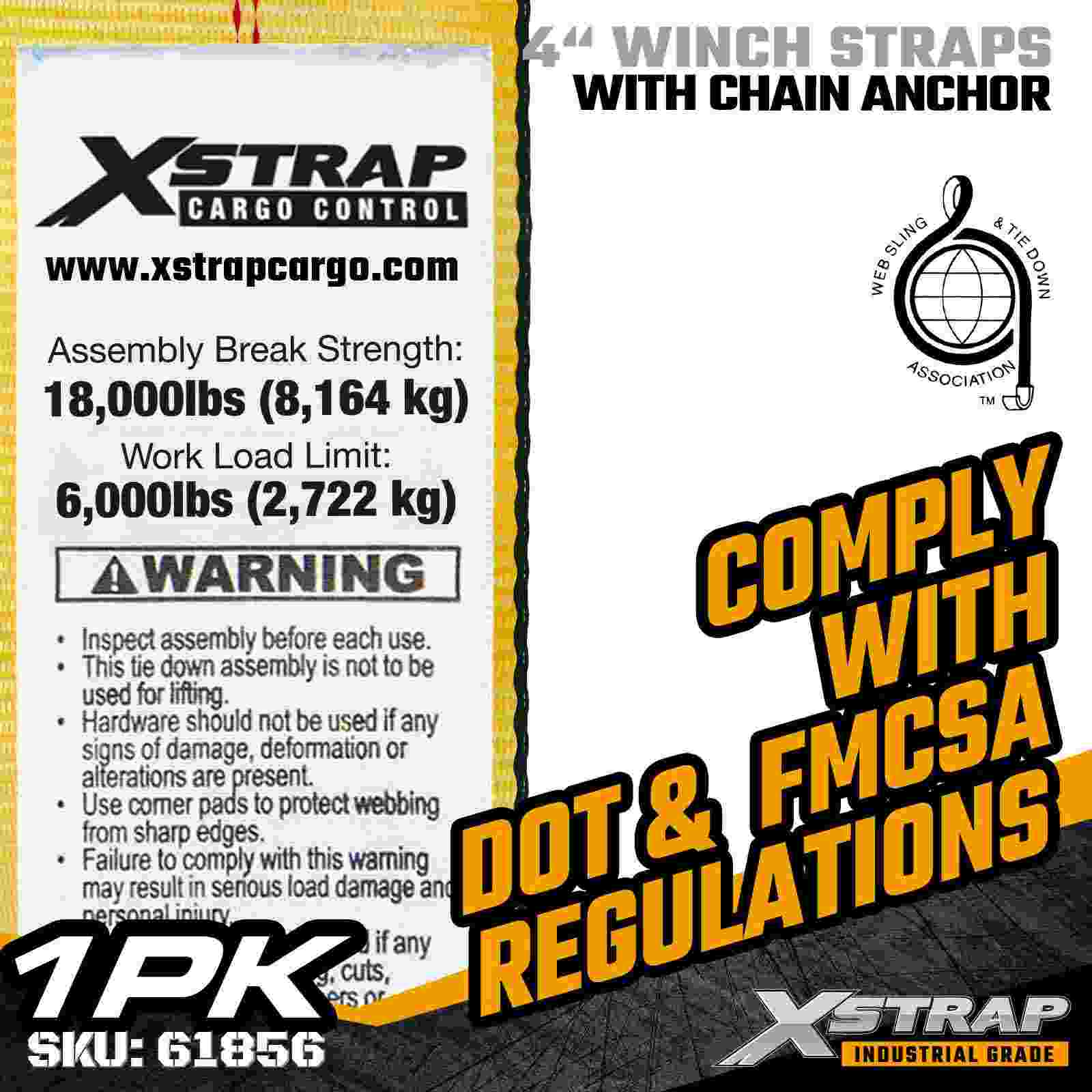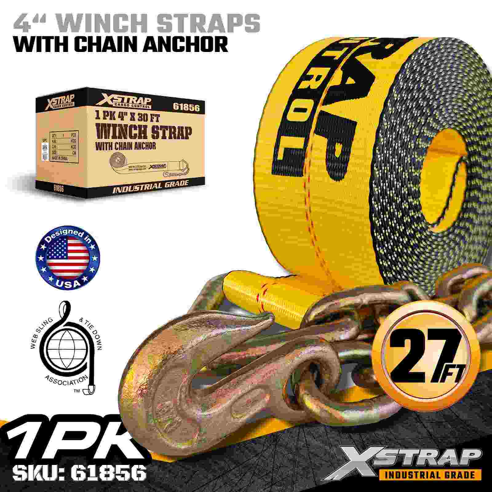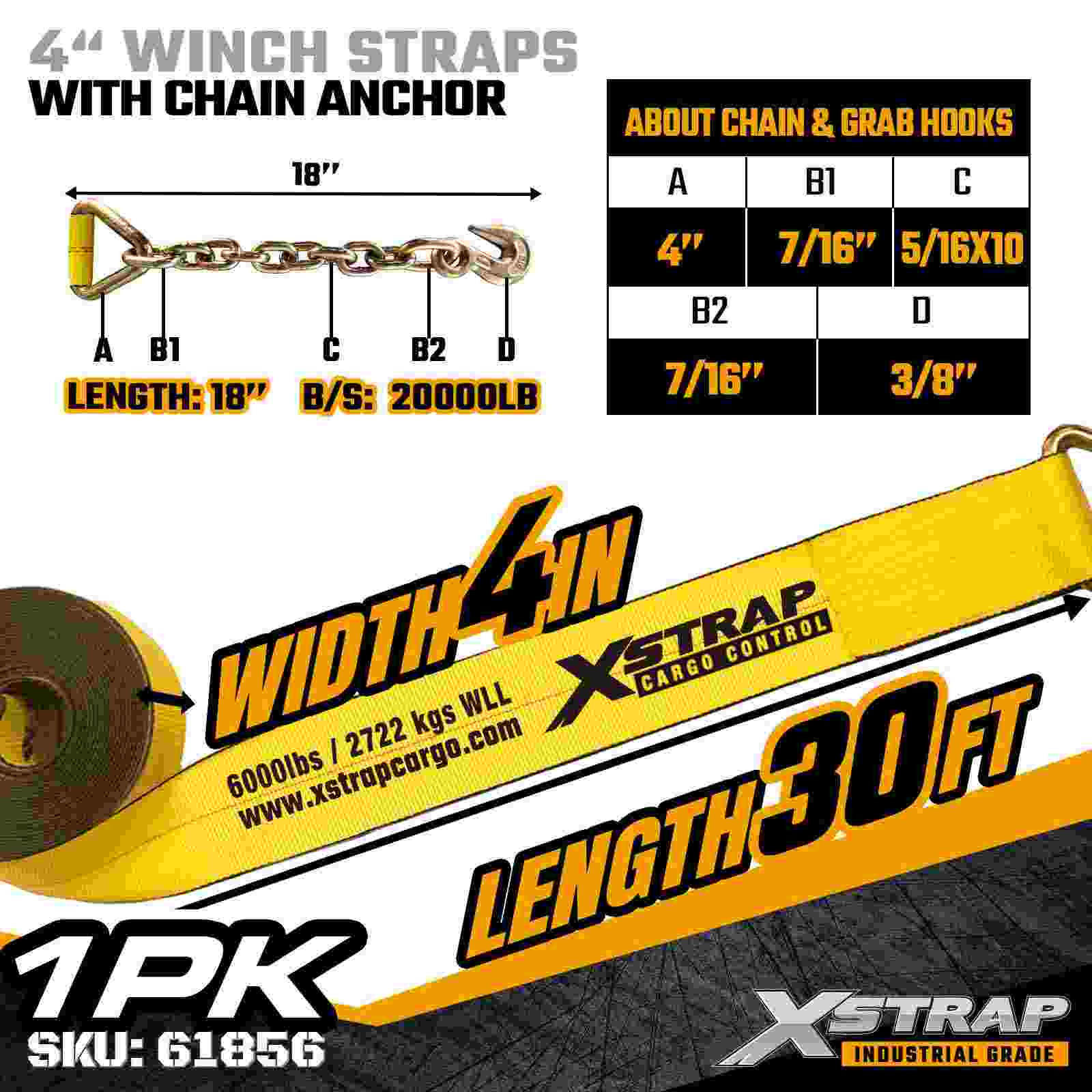 Standardní naviják Xstrap 61856 4" × 30 stop je vysokokapacitní popruh pro zajištění nákladu s prodlouženým dosahem navržený pro valníkové přívěsy a nadrozměrnou průmyslovou přepravu. Tento 4palcový popruh na naviják s kovanou kotvou řetězu a ultra širokým 4palcovým polyesterovým popruhem poskytuje zátěž 600 lbs, 800 lb, pracovní zatížení 80 Pevnost Prodloužená délka 30 stop poskytuje další dosah pro zajištění širokých, vysokých nebo nepravidelně tvarovaných nákladů, které vyžadují maximální pevnost a stabilitu.