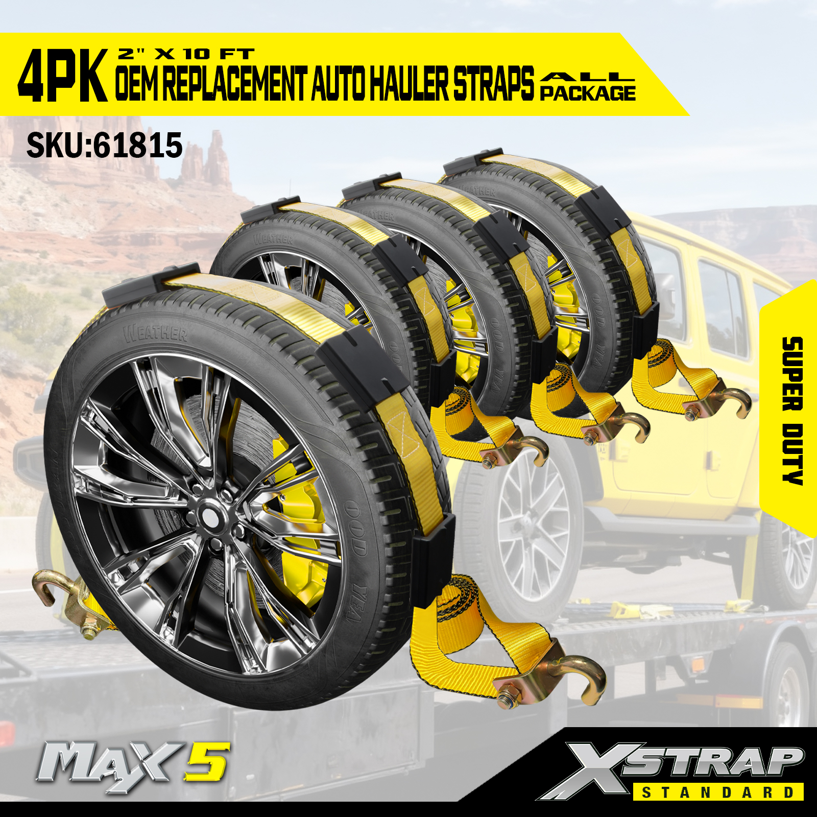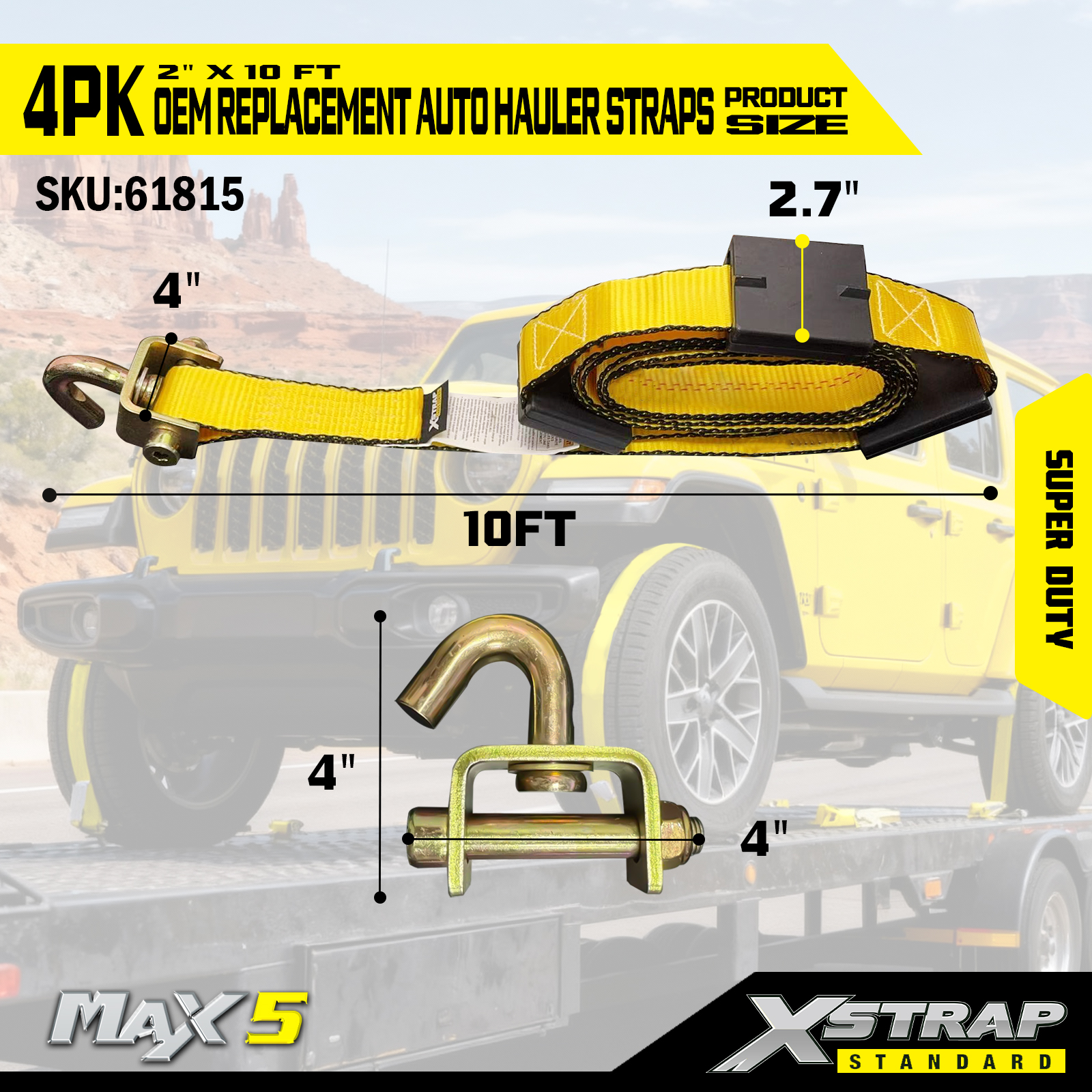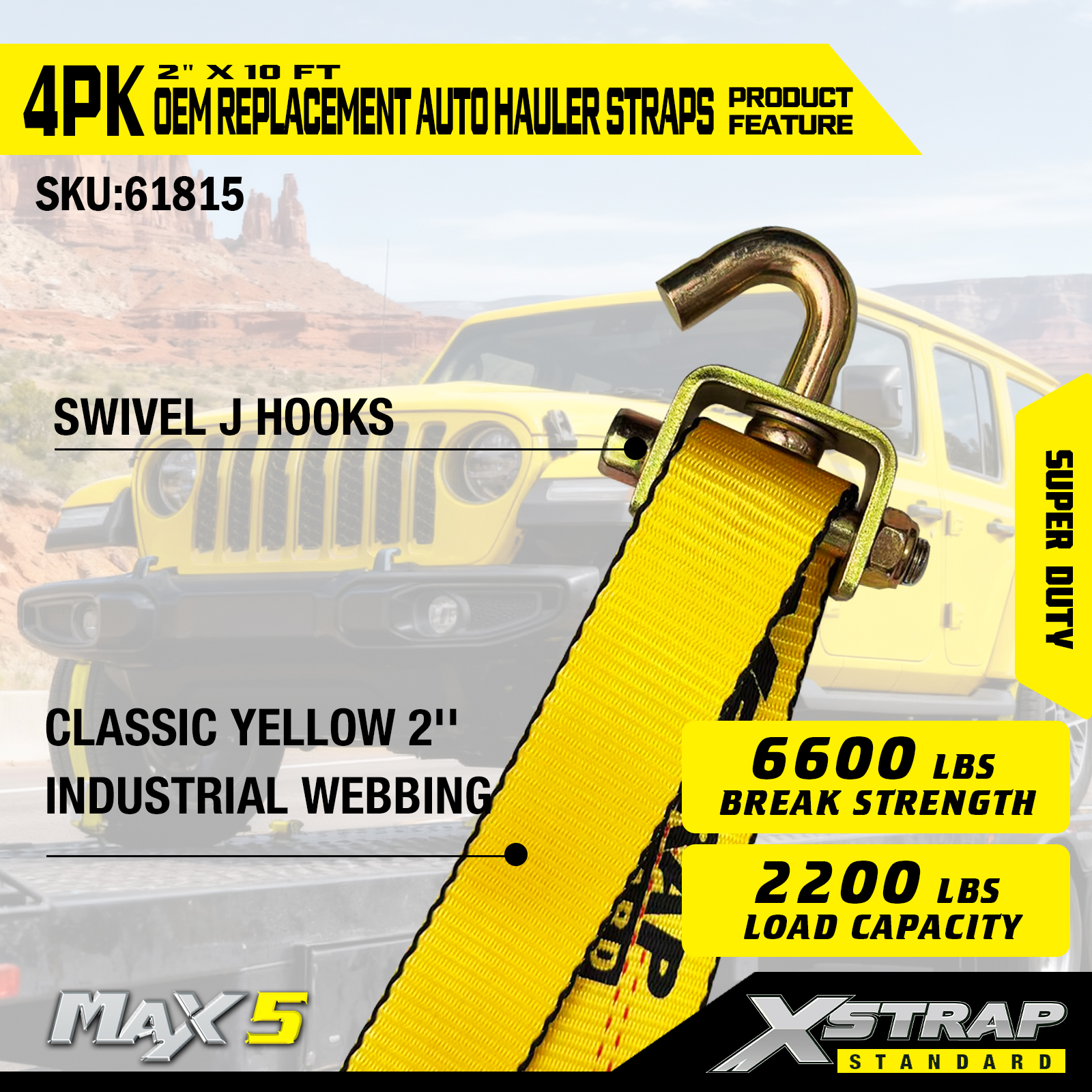 - Popruh průmyslové kvality: 2” široký klasický žlutý popruh je odolný proti proříznutí, UV záření a je vyroben tak, aby vydržel velké napětí – odpovídá standardům odolnosti OEM.