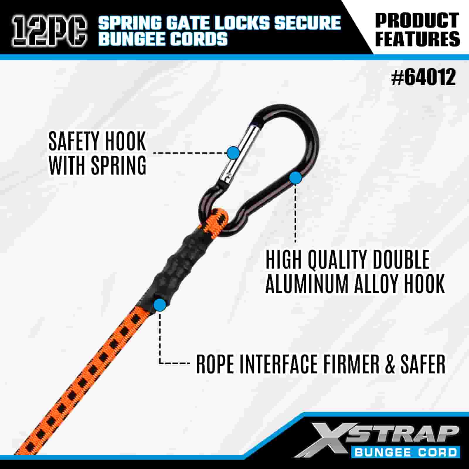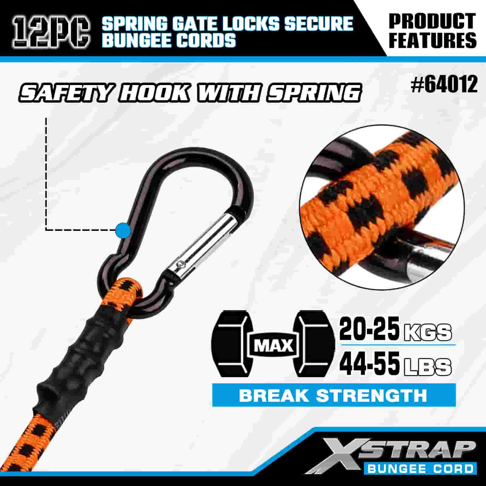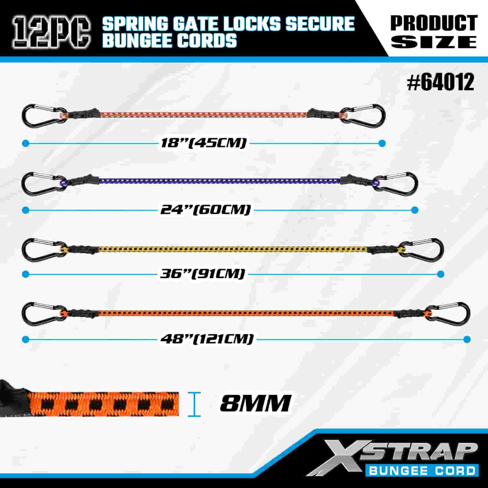 Xstrap 12PK Zámky pružinové brány Bezpečné bungee šňůry 8mm x 18”/24” /36”/ 48”, 88-110 lbs pevnost proti přetržení s karabinovými háky s zabezpečeným zámkem pružinové brány.