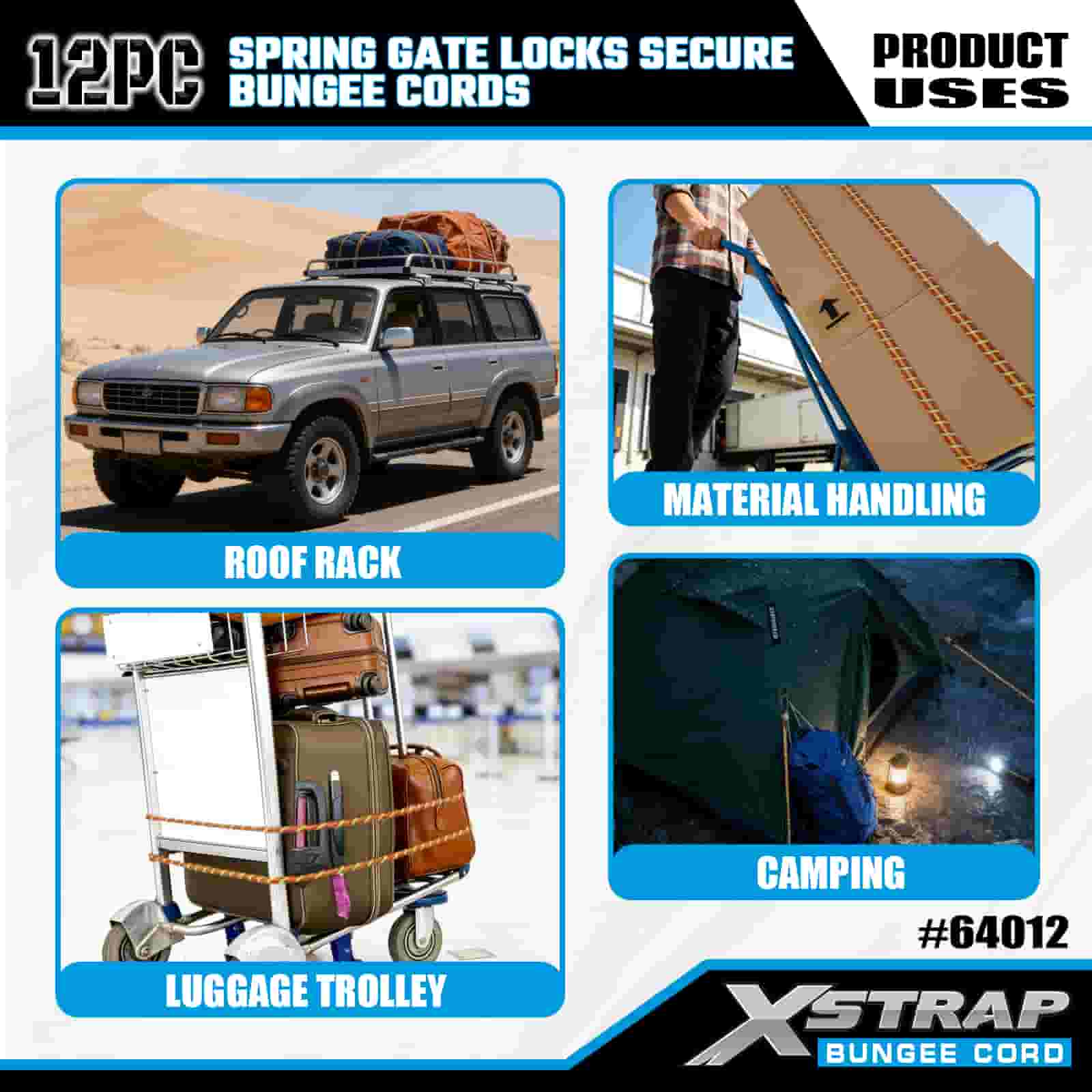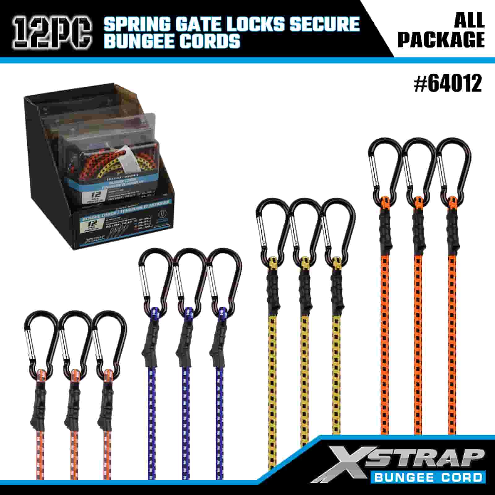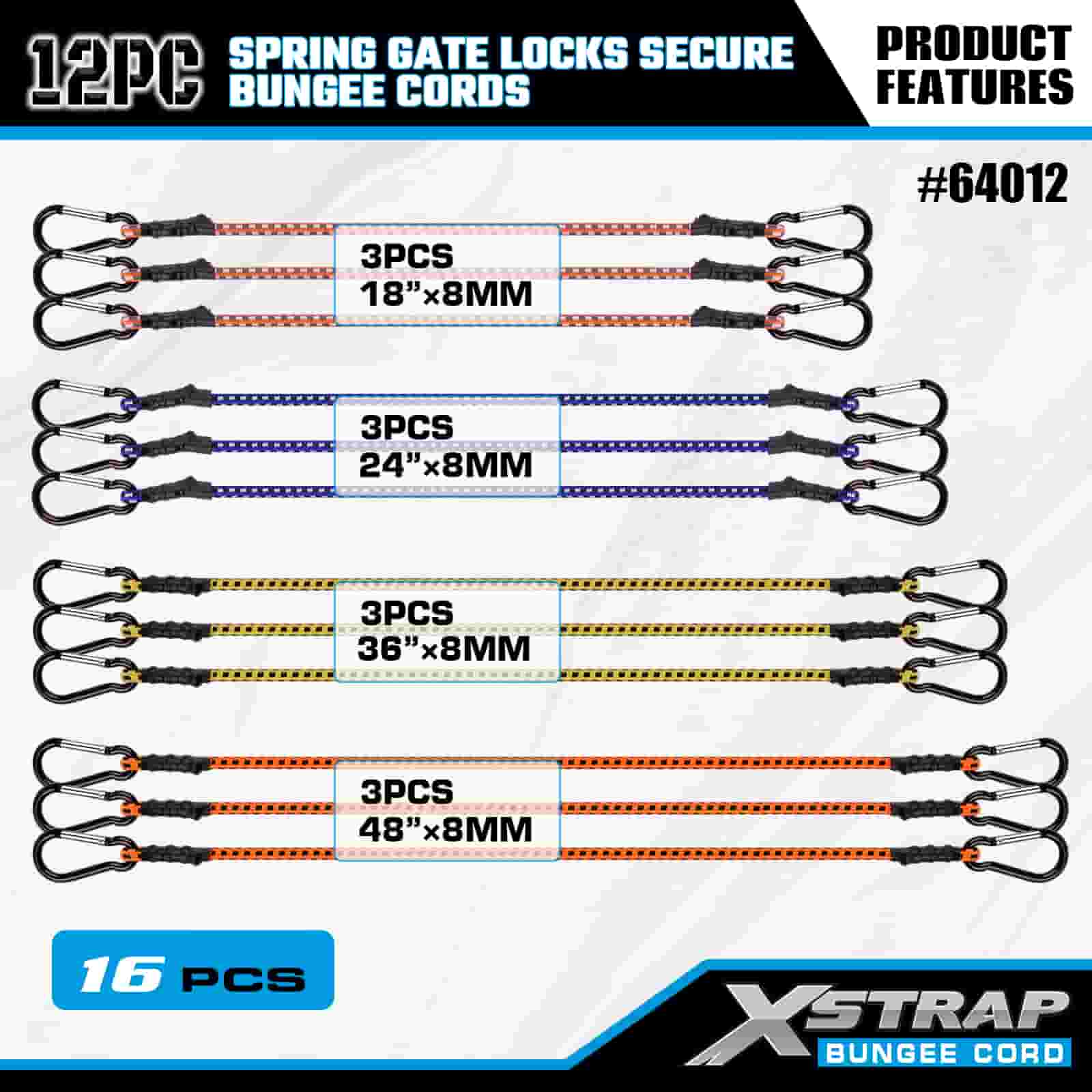 Xstrap 12PK Zámky pružinové brány Bezpečné bungee šňůry 8mm x 18”/24” /36”/ 48”, 88-110 lbs pevnost proti přetržení s karabinovými háky s zabezpečeným zámkem pružinové brány.