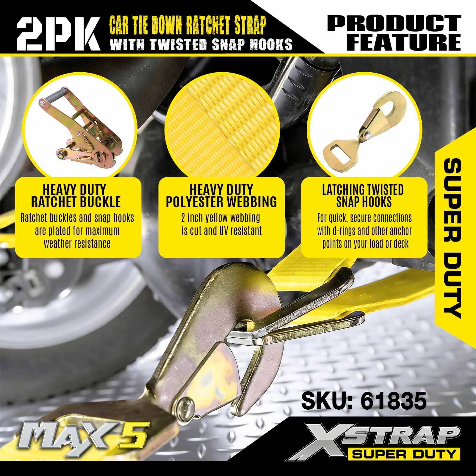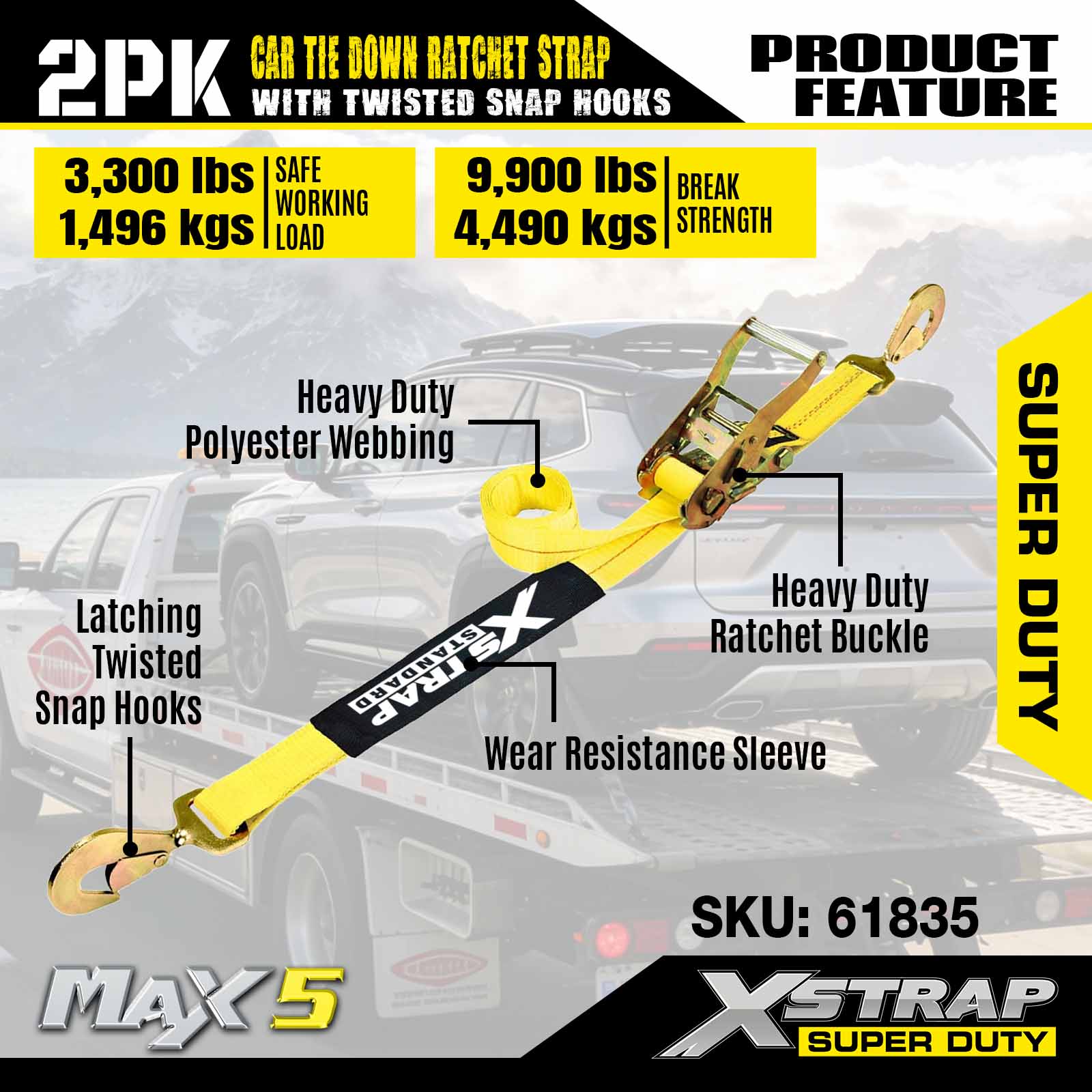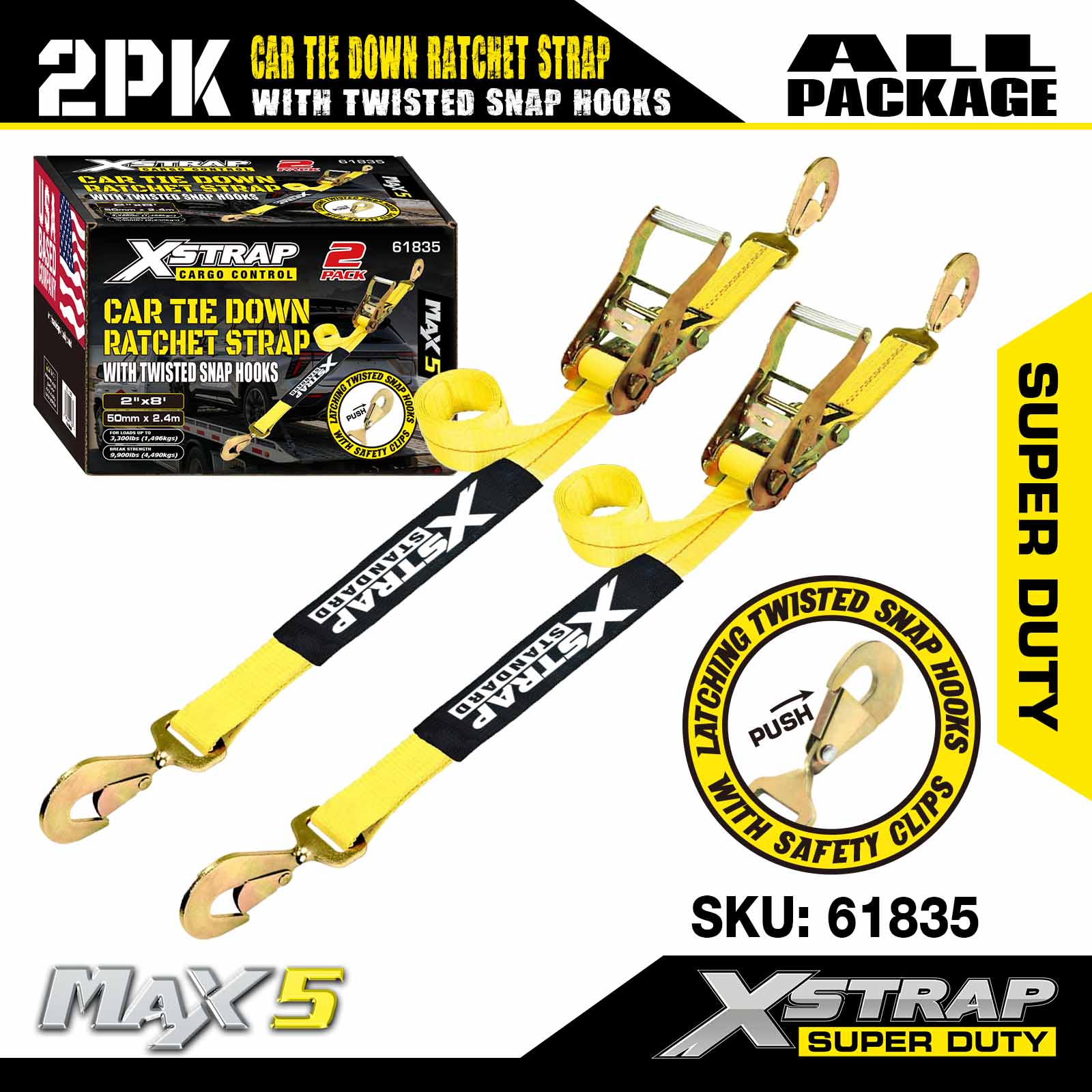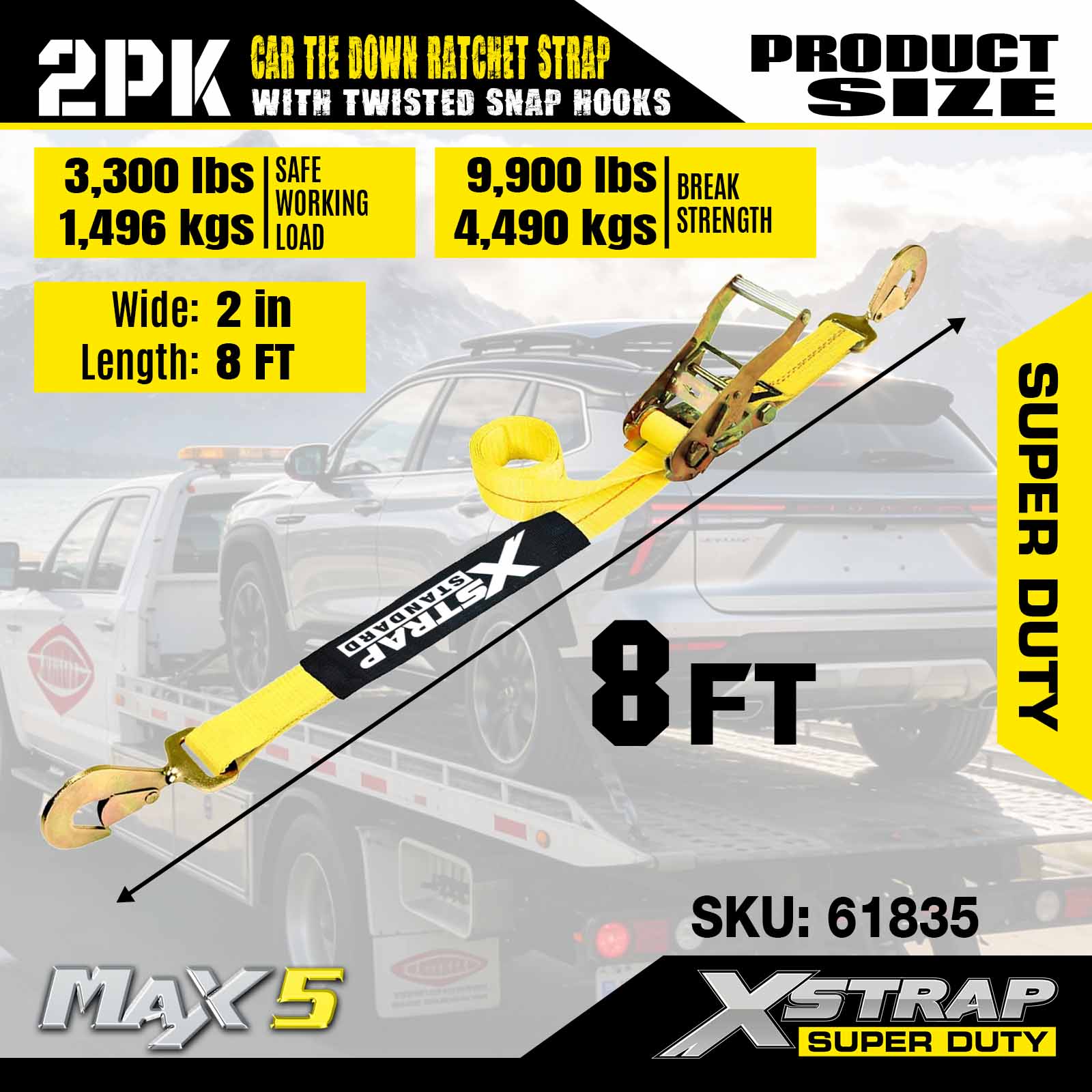 Xstrap Car upínací popruhy pro přívěsy, 2" x 8" Heavy Duty Car Hauler ráčnové popruhy, 2PK, pevnost v přetržení 10 000 liber