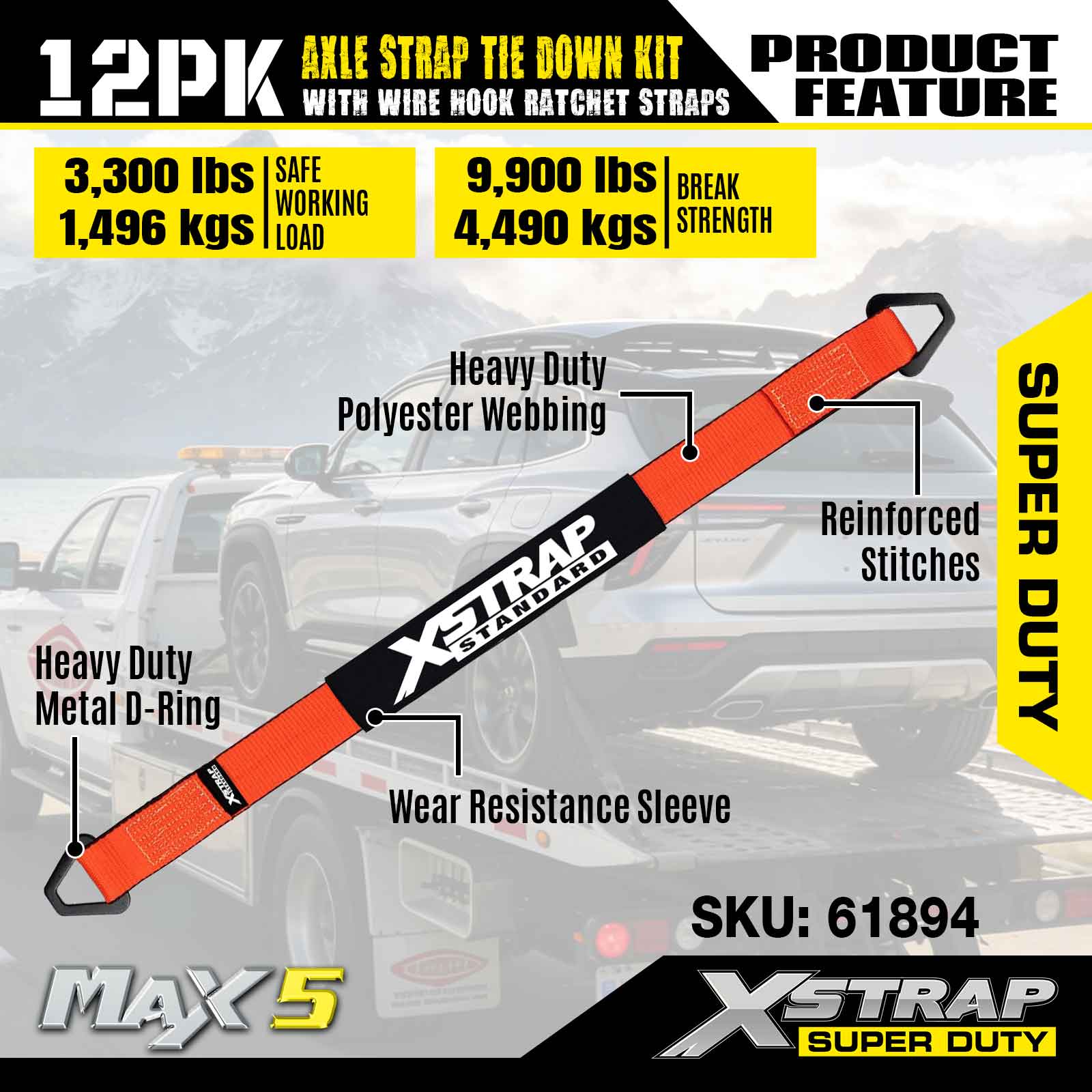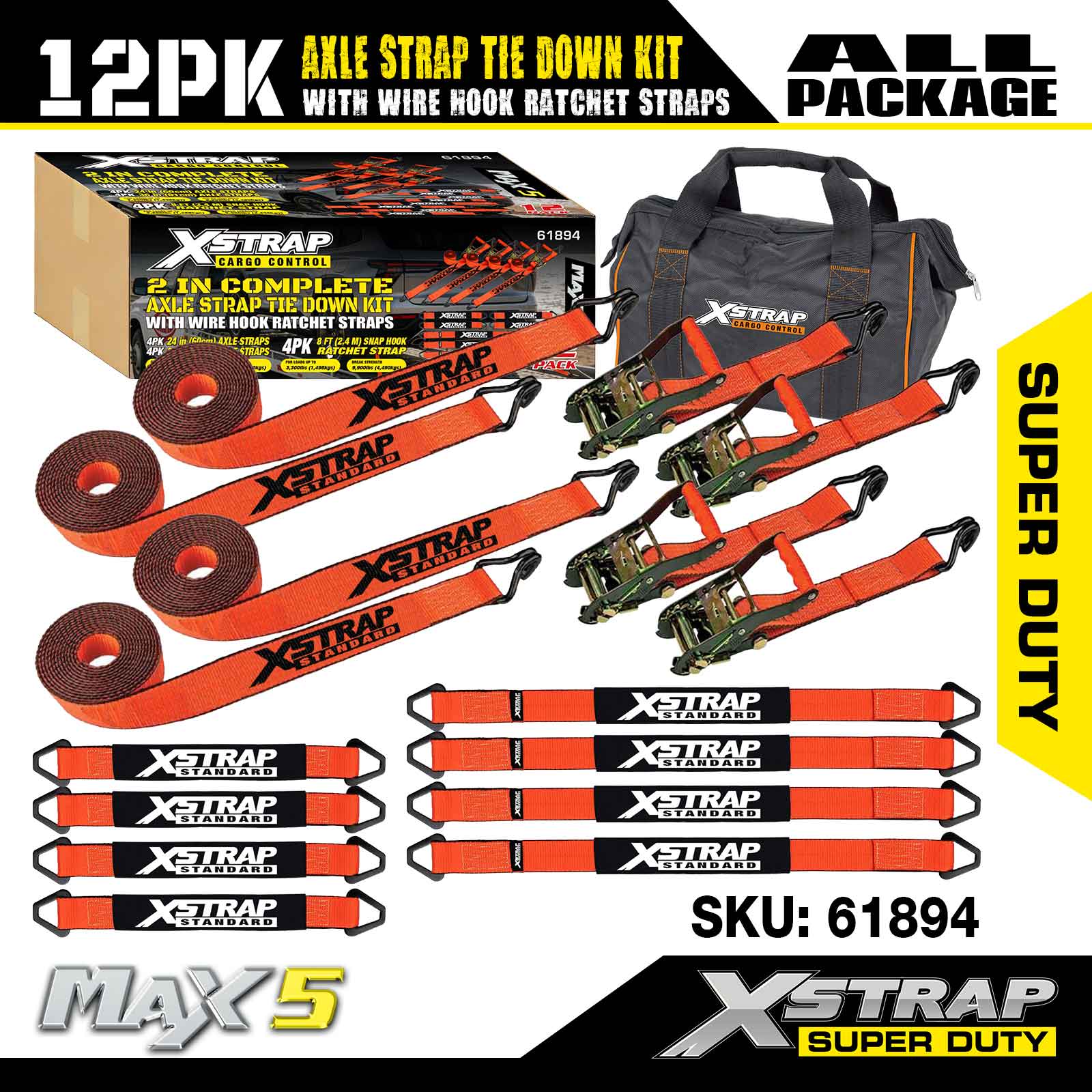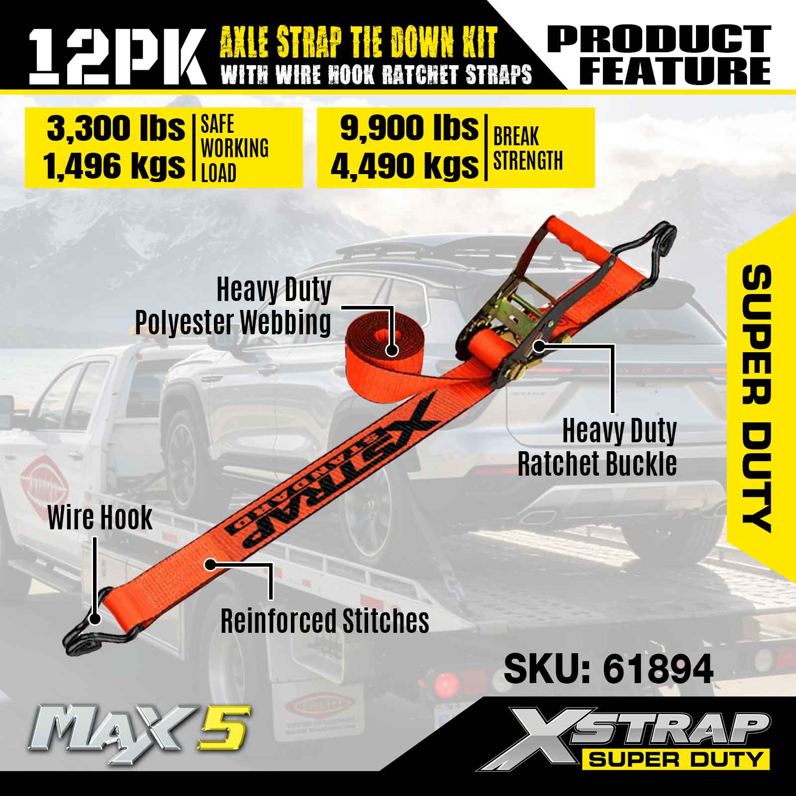 Xstrap 12PK Sada upínacích popruhů nápravy (s drátěnými ráčnovými popruhy) – Super Duty. Má bezpečné pracovní zatížení 3 300 LBS (1 496 kg) a mez pevnosti 9 900 LBS (4 490 kg).
