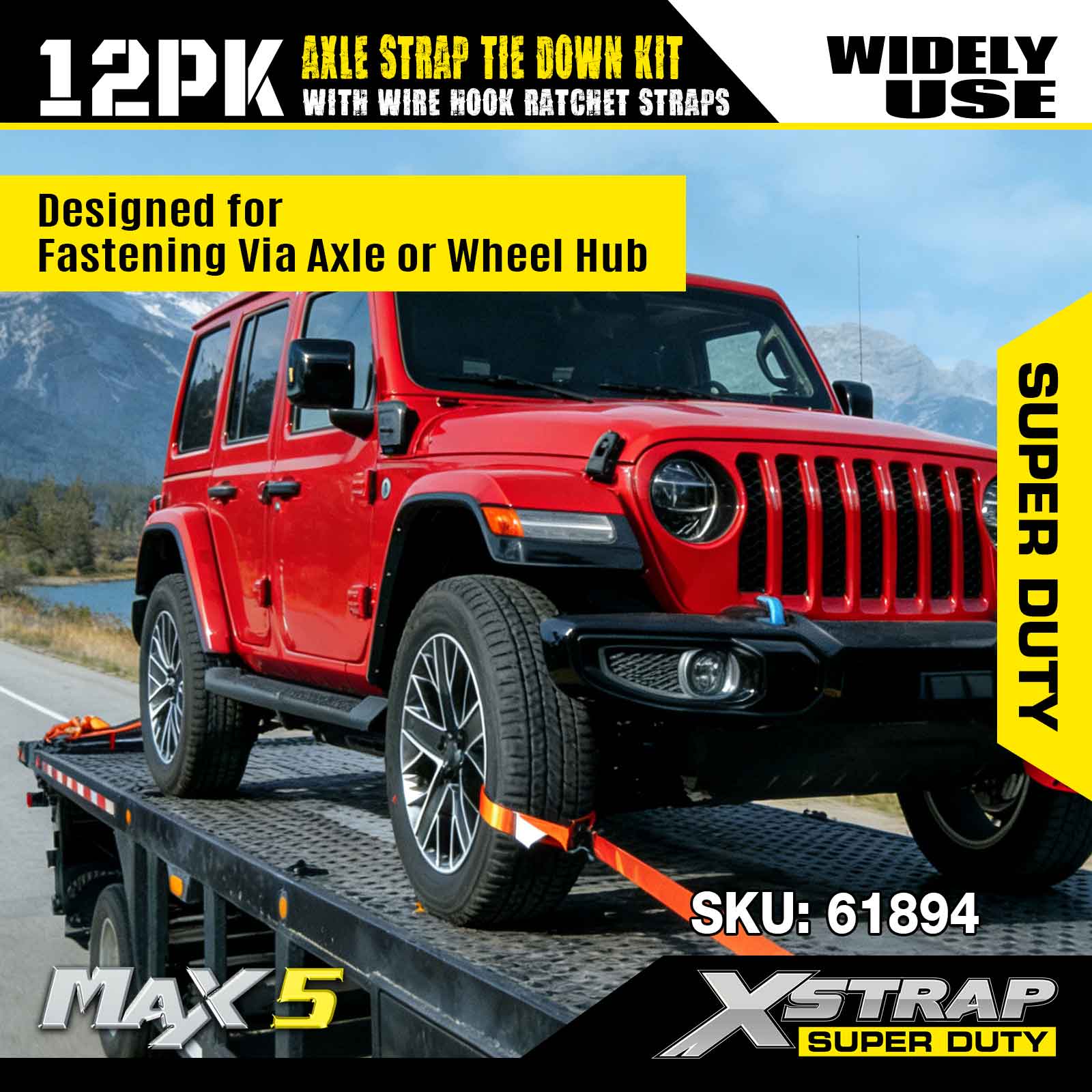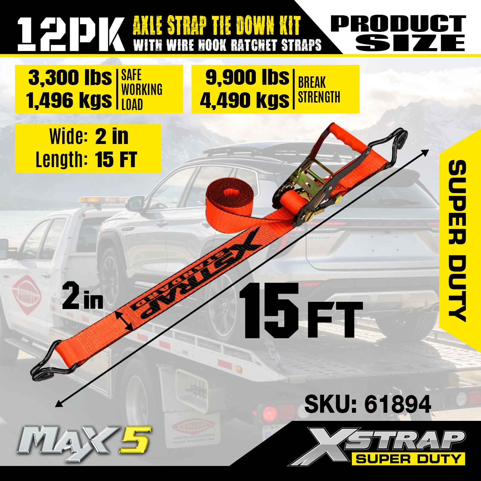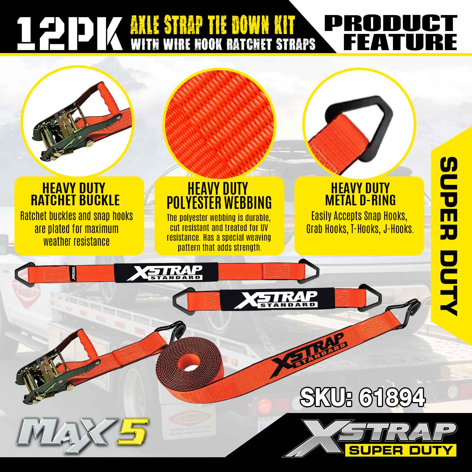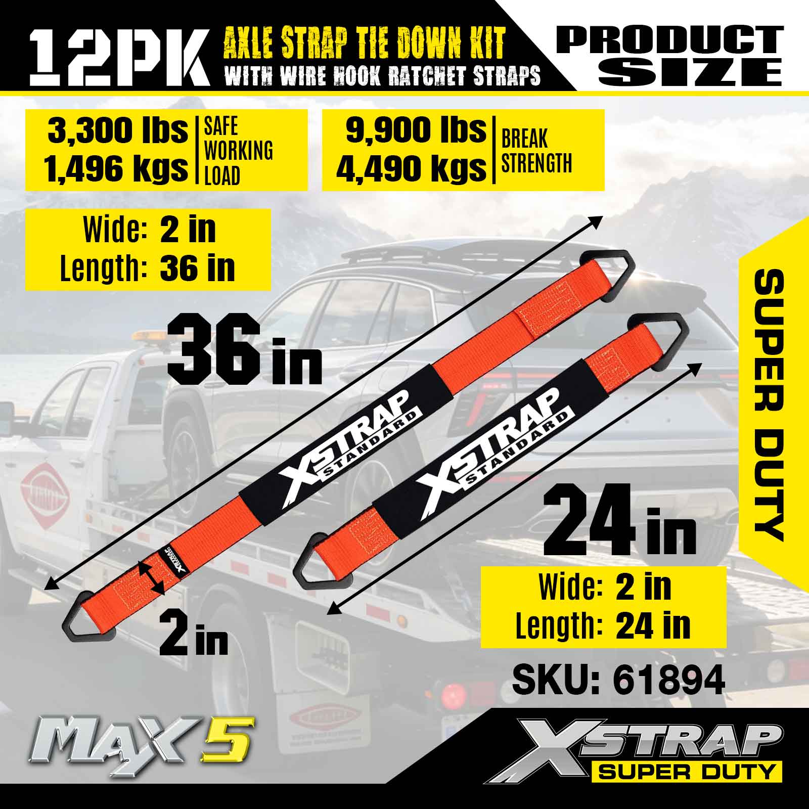 Xstrap 12PK Sada upínacích popruhů nápravy (s drátěnými ráčnovými popruhy) – Super Duty. Má bezpečné pracovní zatížení 3 300 LBS (1 496 kg) a mez pevnosti 9 900 LBS (4 490 kg).