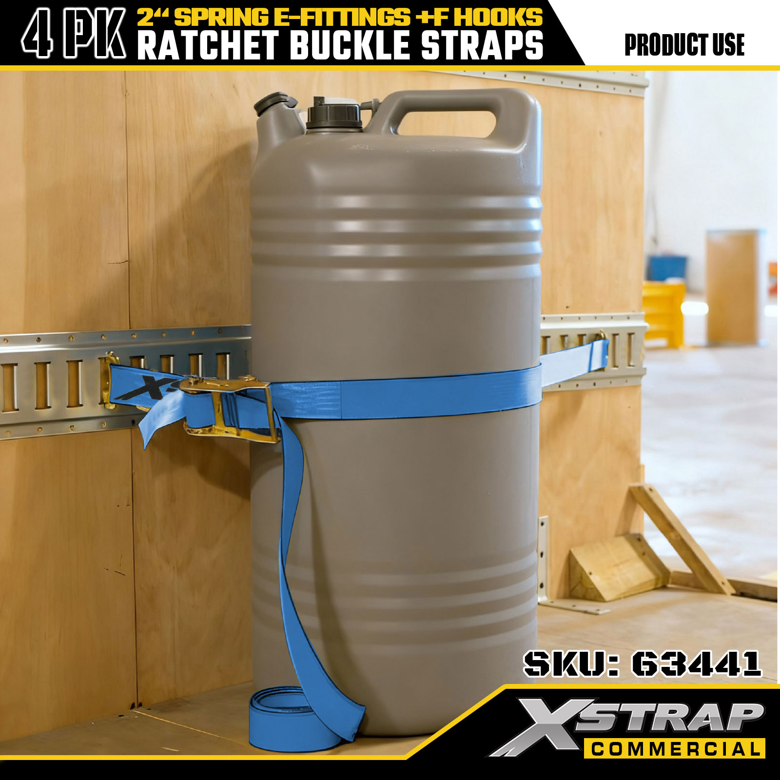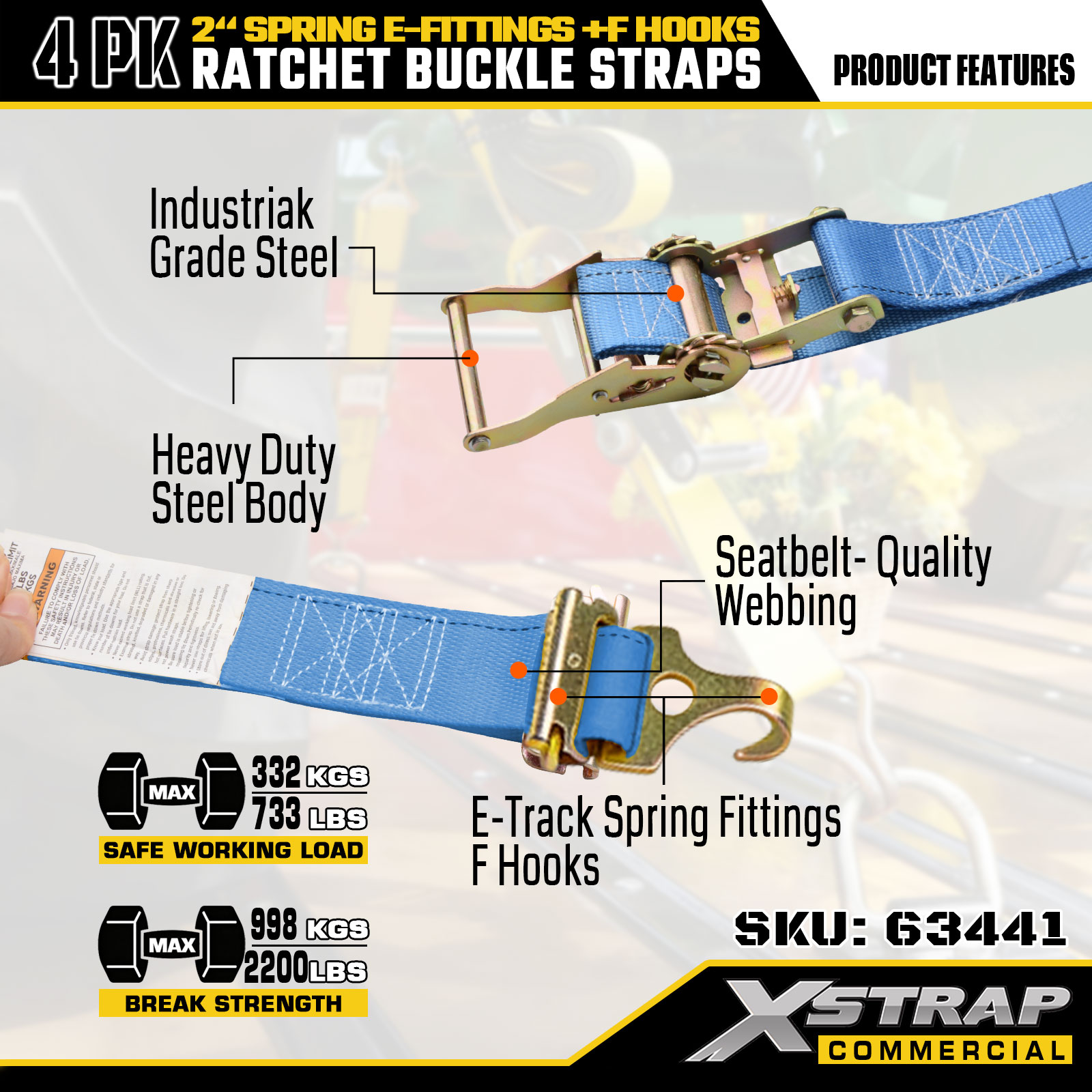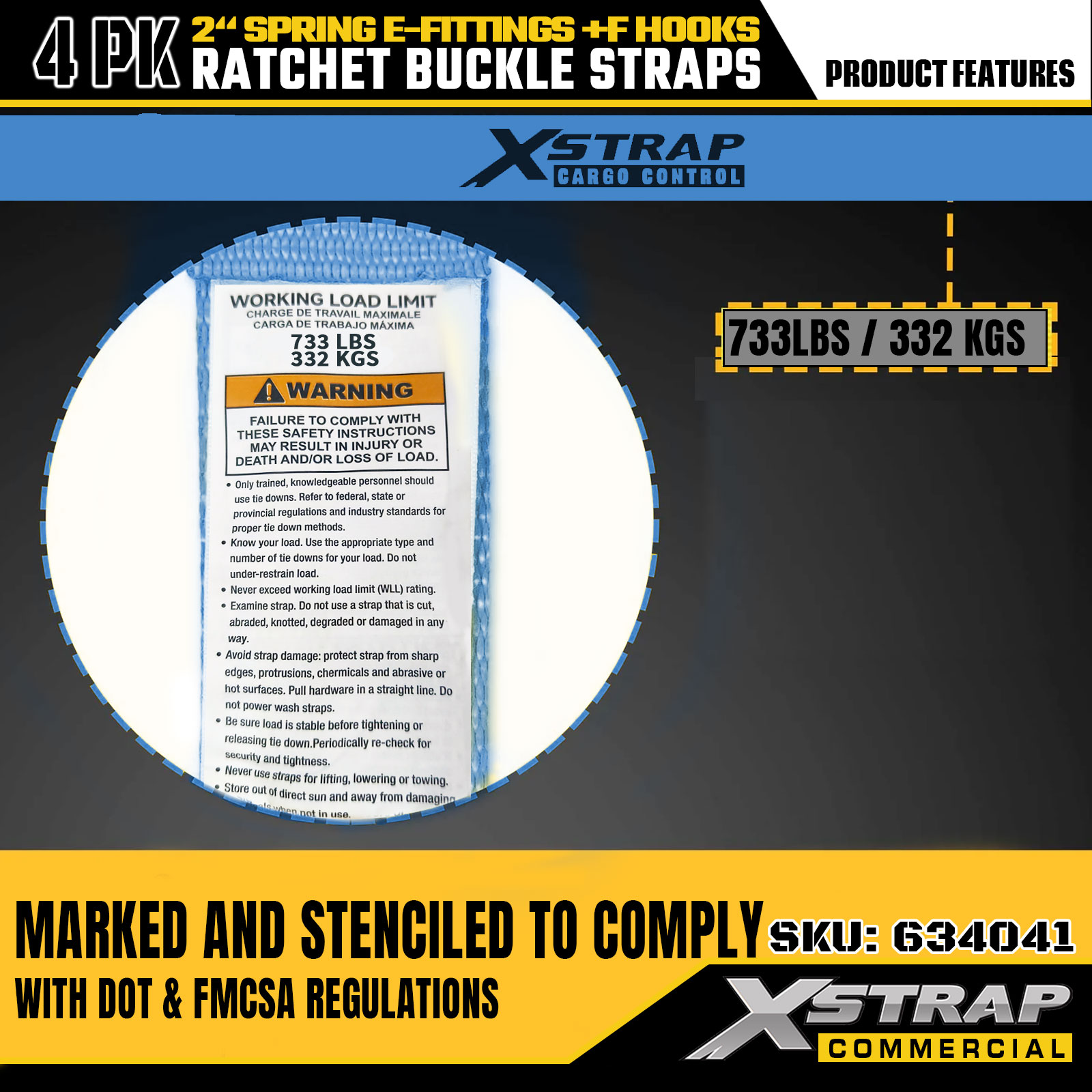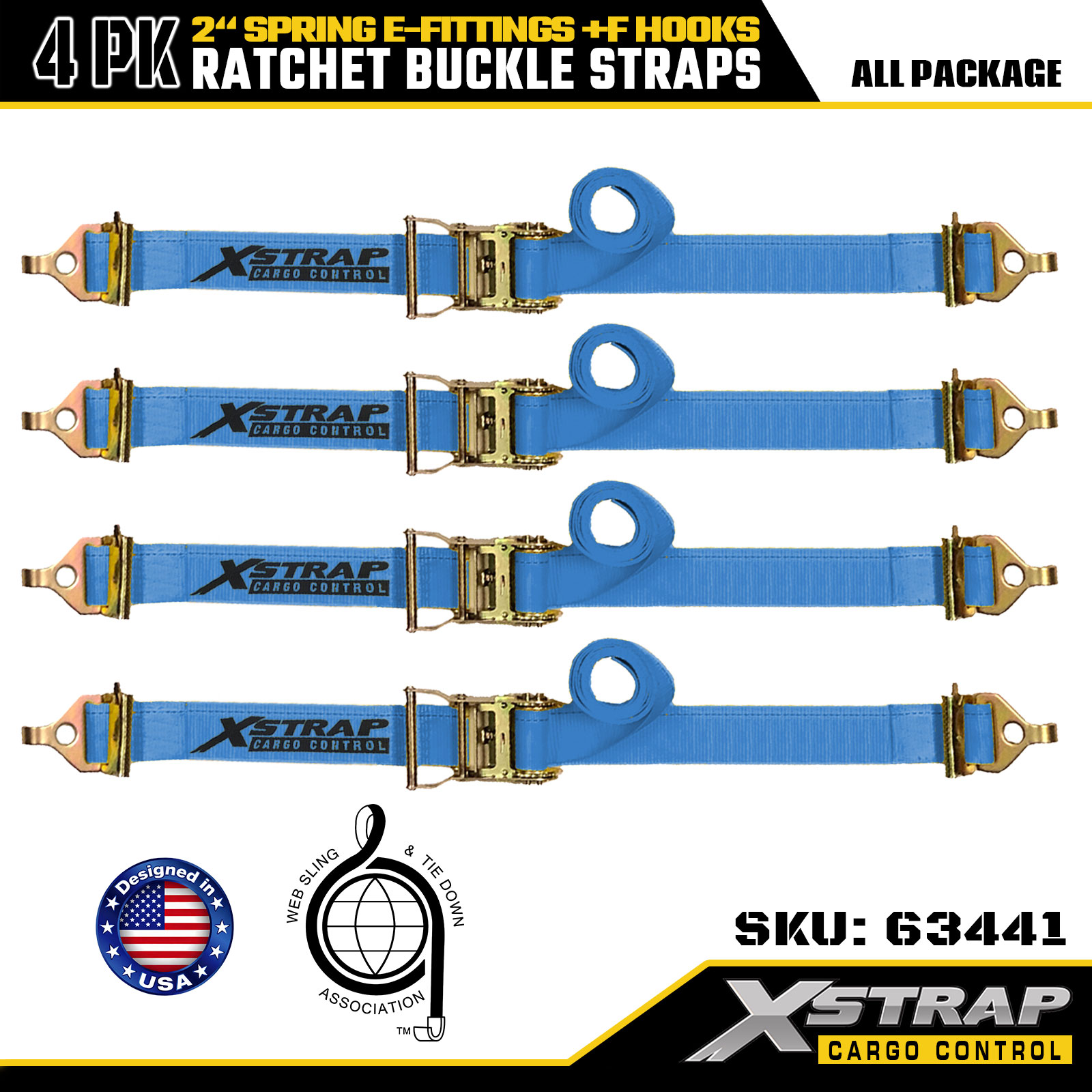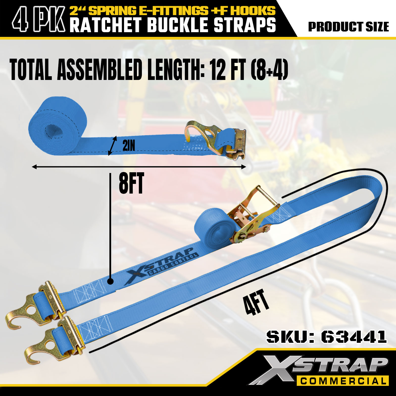 Xstrap 4 balení ráčnových upínacích popruhů 2" x 12" Polyester s pružinovými E-fitingy a F háčky, 733 lb SWL & 332 lb Pevnost při přetržení pro kamion, stěhování a běžnou nákladní dopravu