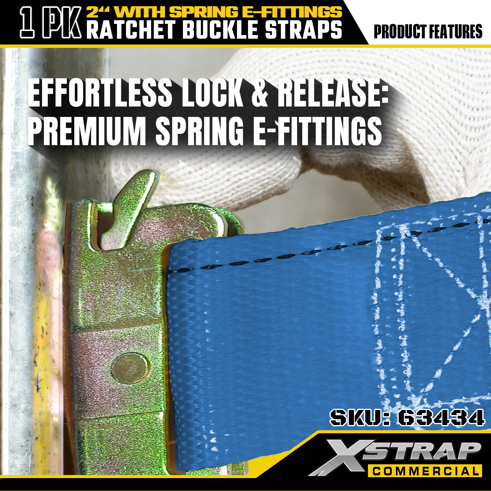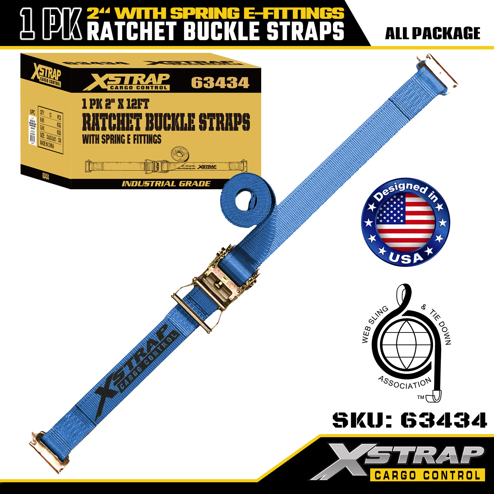 Xstrap 1 balení ráčnových upínacích popruhů, 2" x 20" polyesterové popruhy pro zajištění nákladu, 1467 lb Bezpečné pracovní zatížení a 4401 lb pevnost v přetržení, s pružinovými E-fitinky pro nákladní automobily, sekačky, ATV