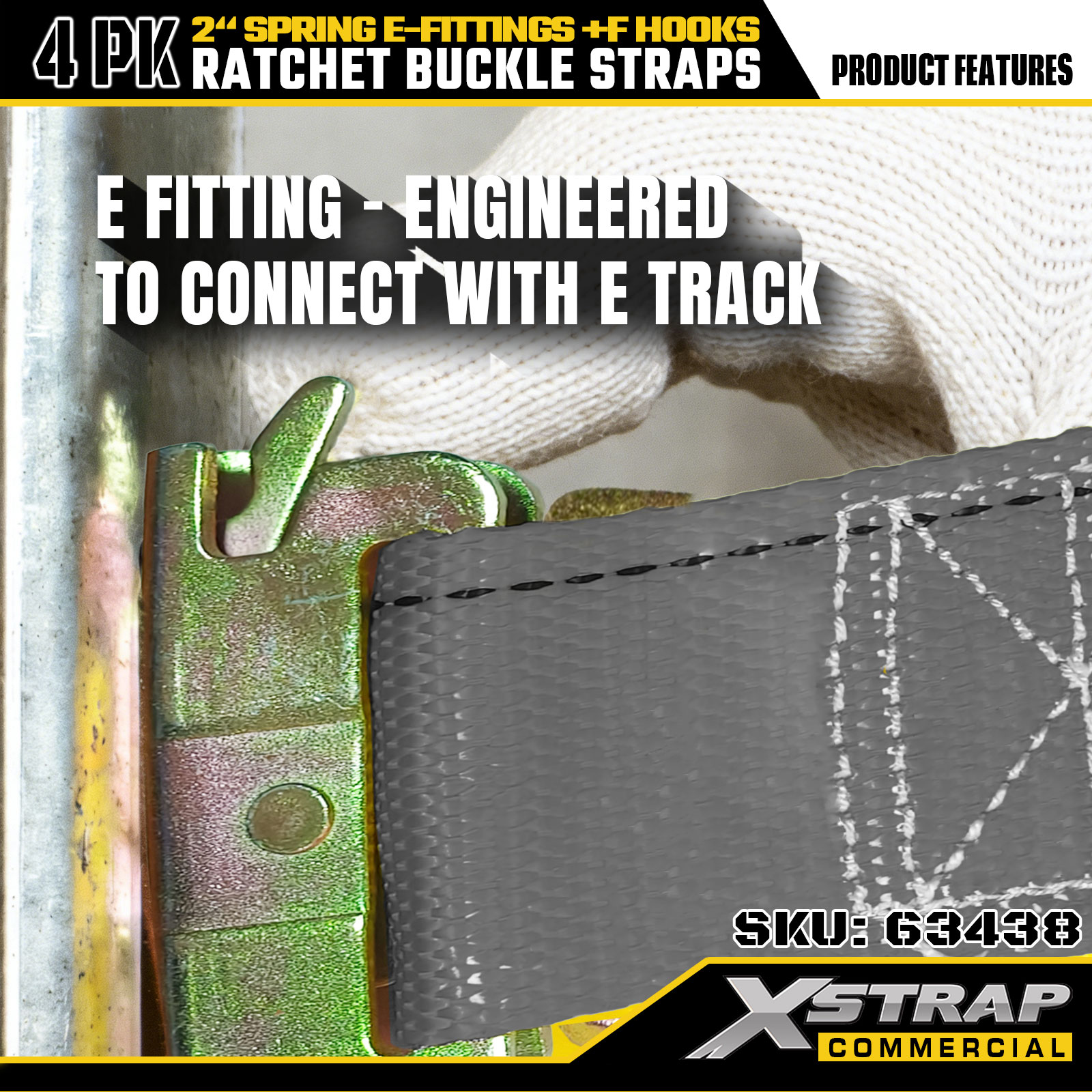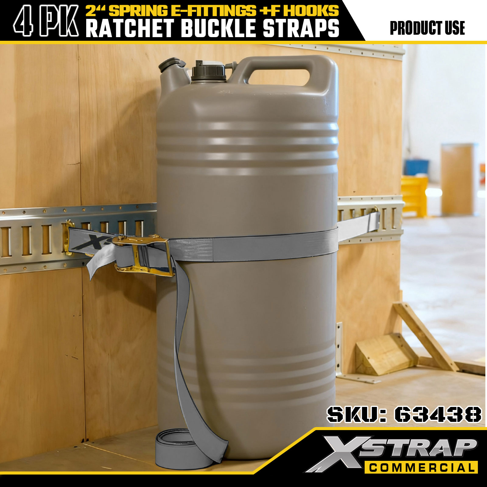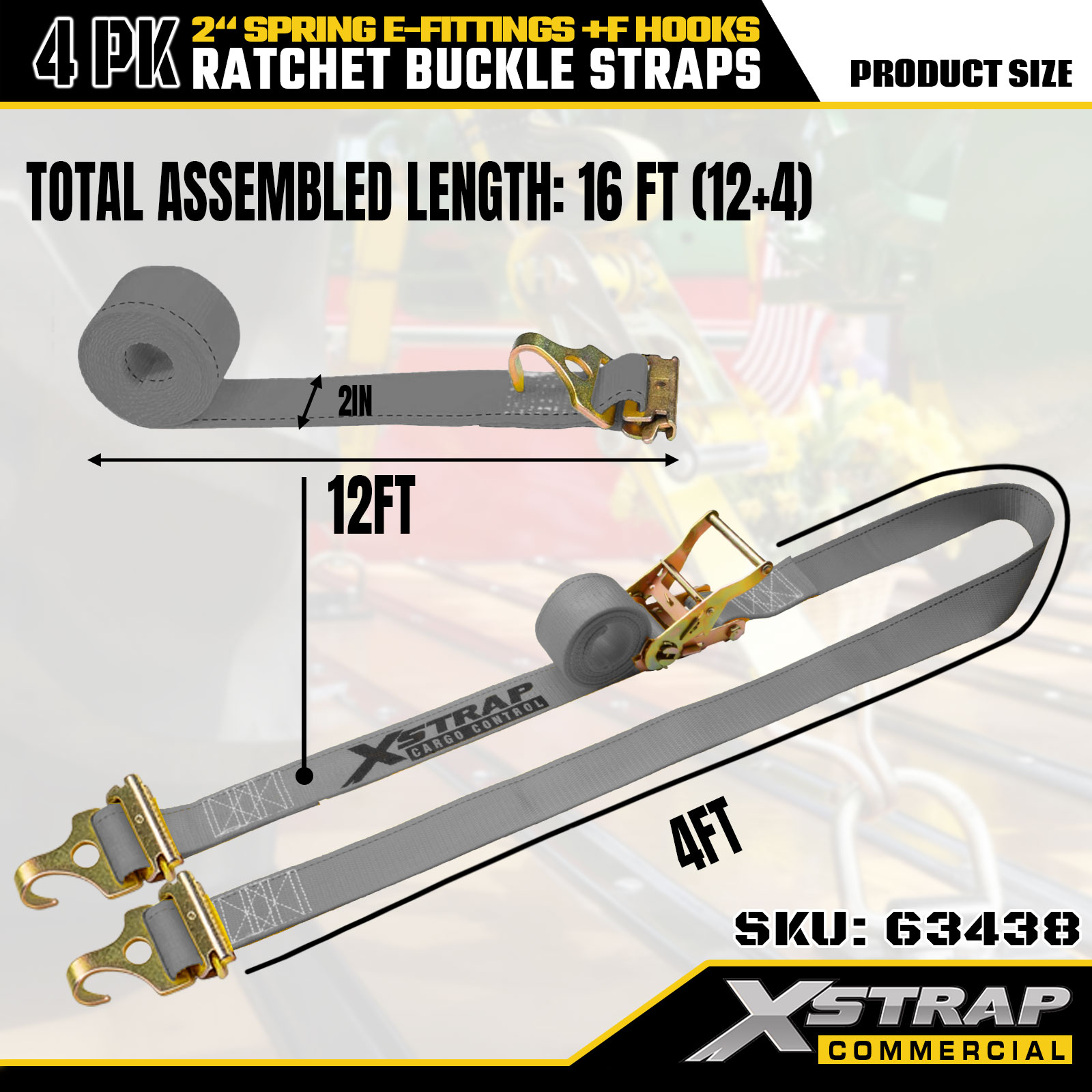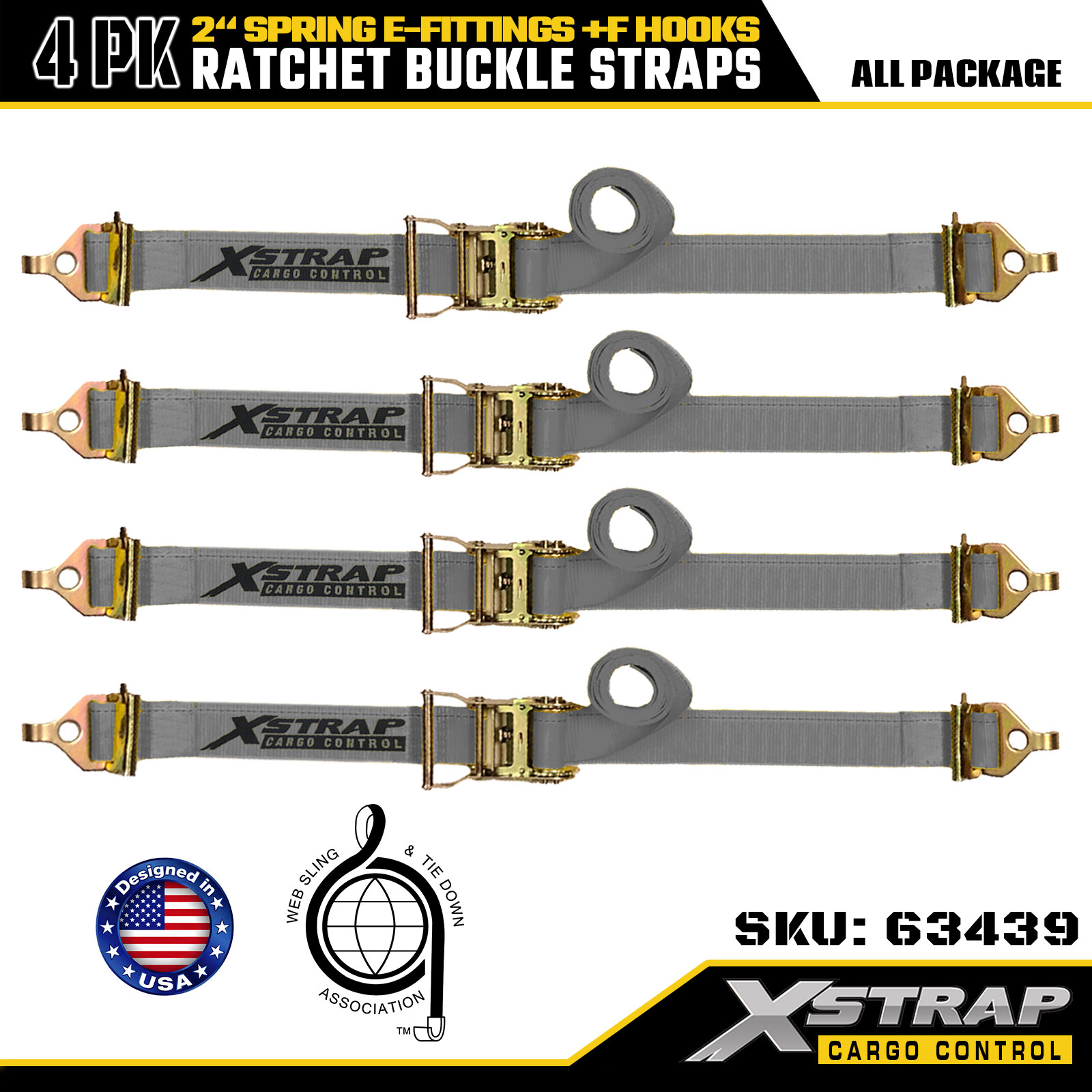 Xstrap 4 Pack 2" x 16' ráčnové upínací popruhy - šedý polyester s pružinovými E-fitinky a F háčky, 733 lb SWL pro stěhování, kamionovou a běžnou nákladní dopravu