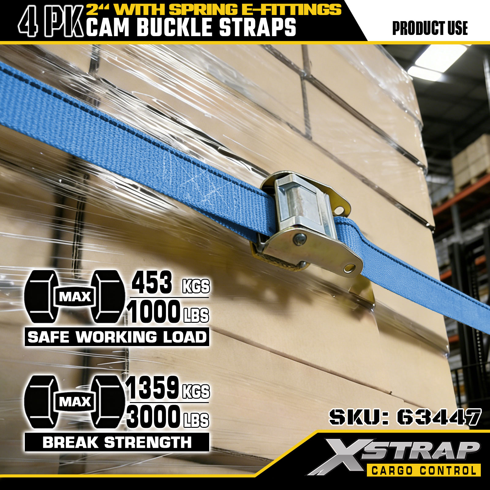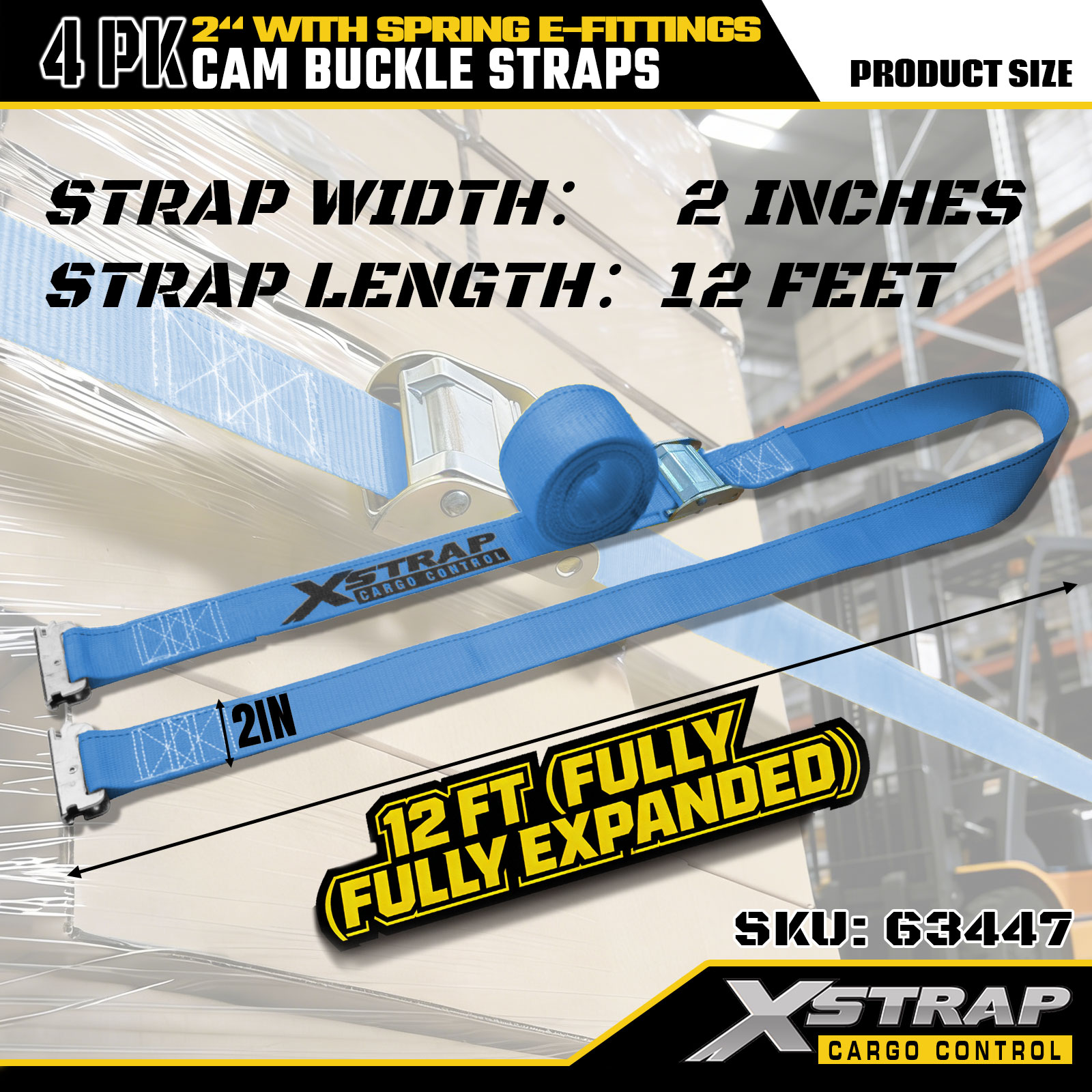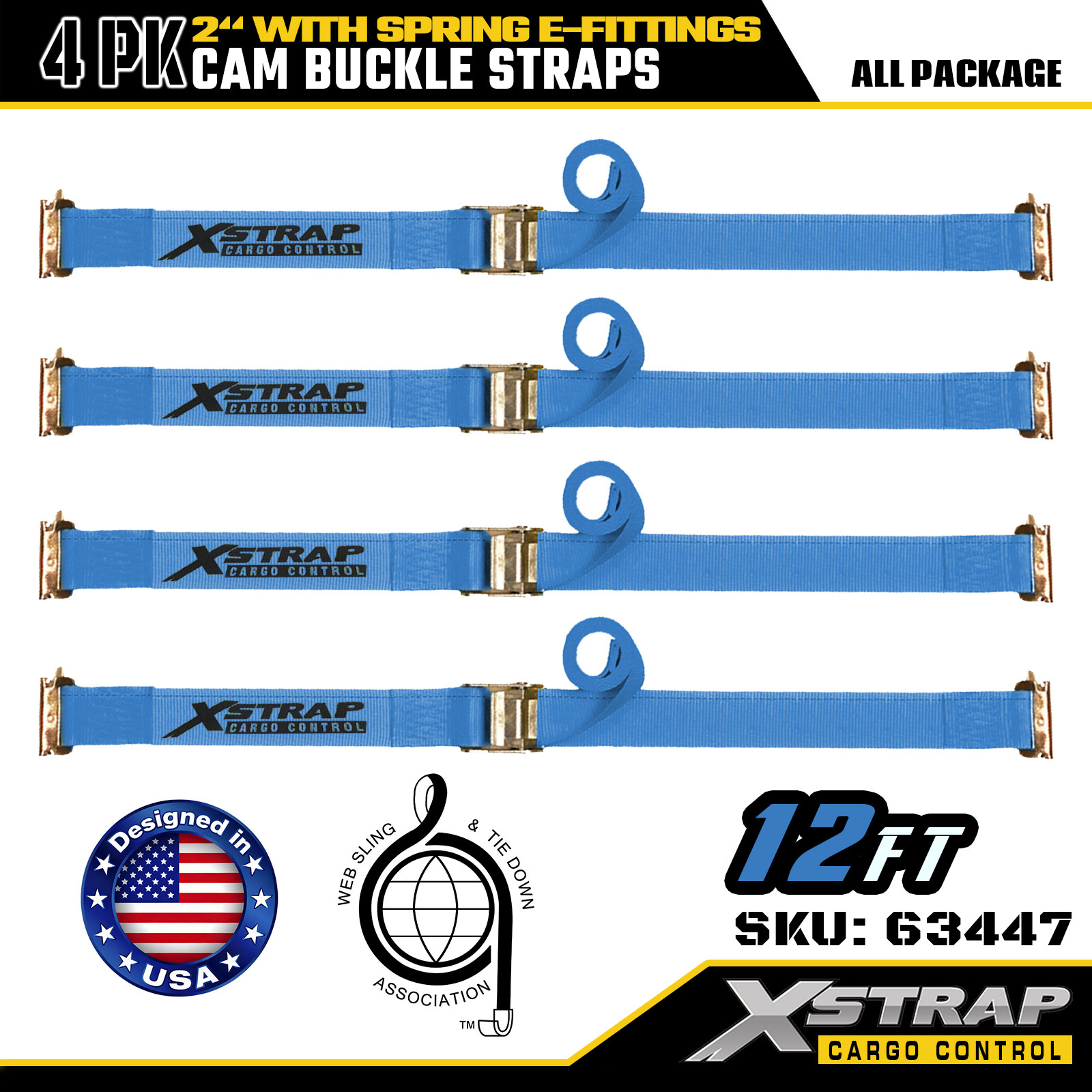 Xstrap 63447 4 Pack 2" x 12' modré ráčnové popruhy s pružinovými E-fitinky a F háky, 733 lb SWL & 332 lb mez pevnosti pro kontrolu nákladu, přesun a přepravu