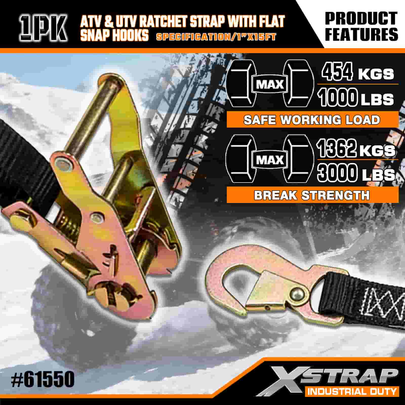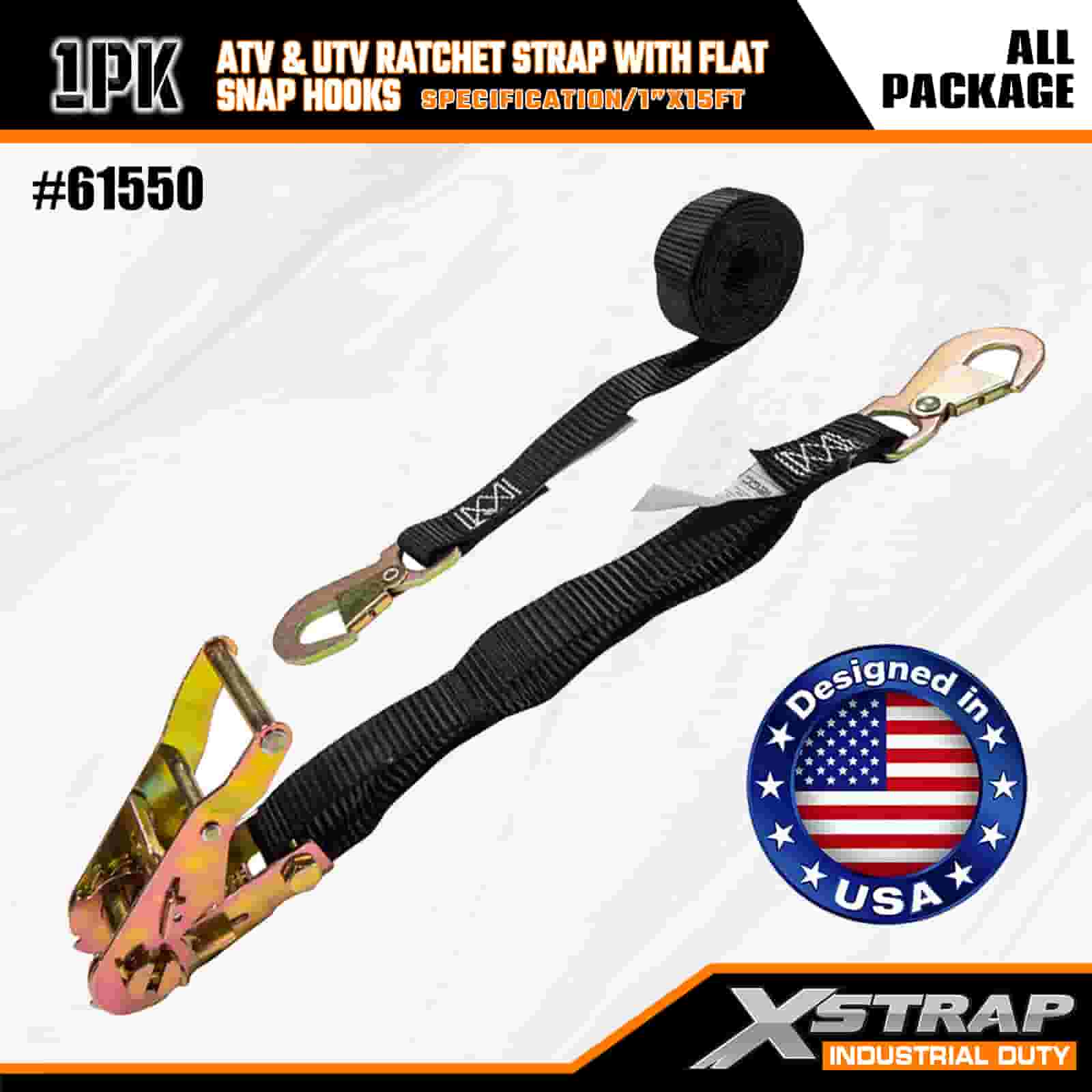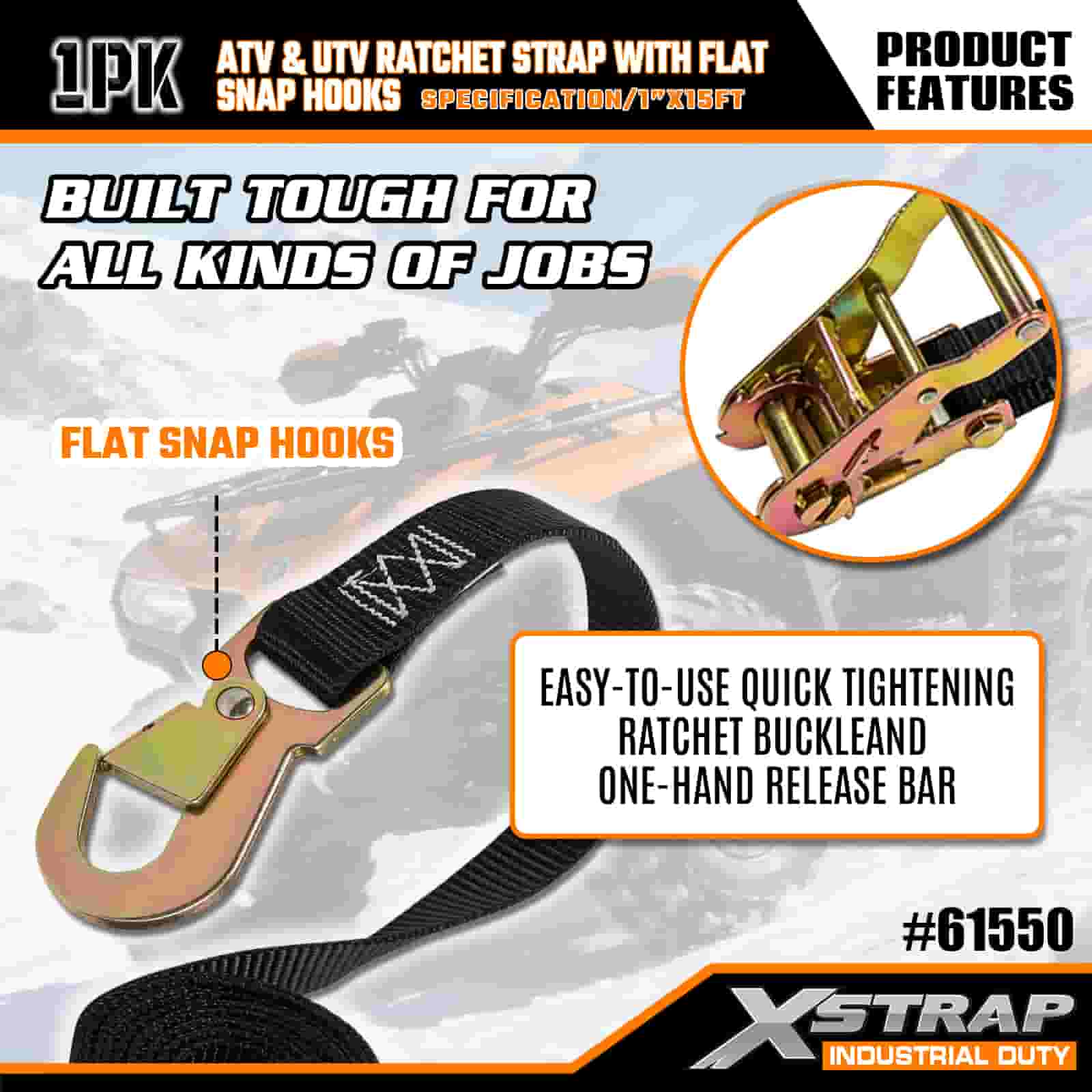 Řemínek s ráčnou na ATV a AUV Xstrap s plochými karabinami, 1” x 15' polyesterový popruh s ráčnou, popruhy pro upevnění nákladu s kapacitou 1 000 liber s plochým uzávěrem pro přívěs, lyžařský člun s plochým lůžkem, malé auto, těžké vybavení.
