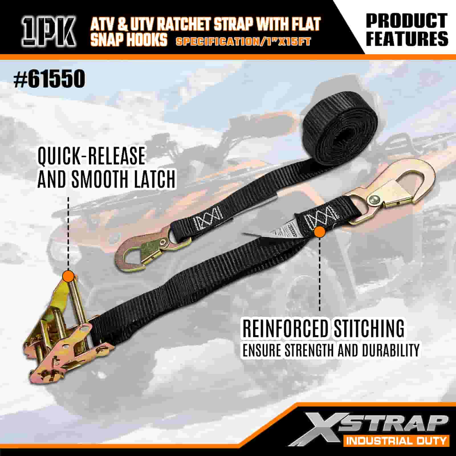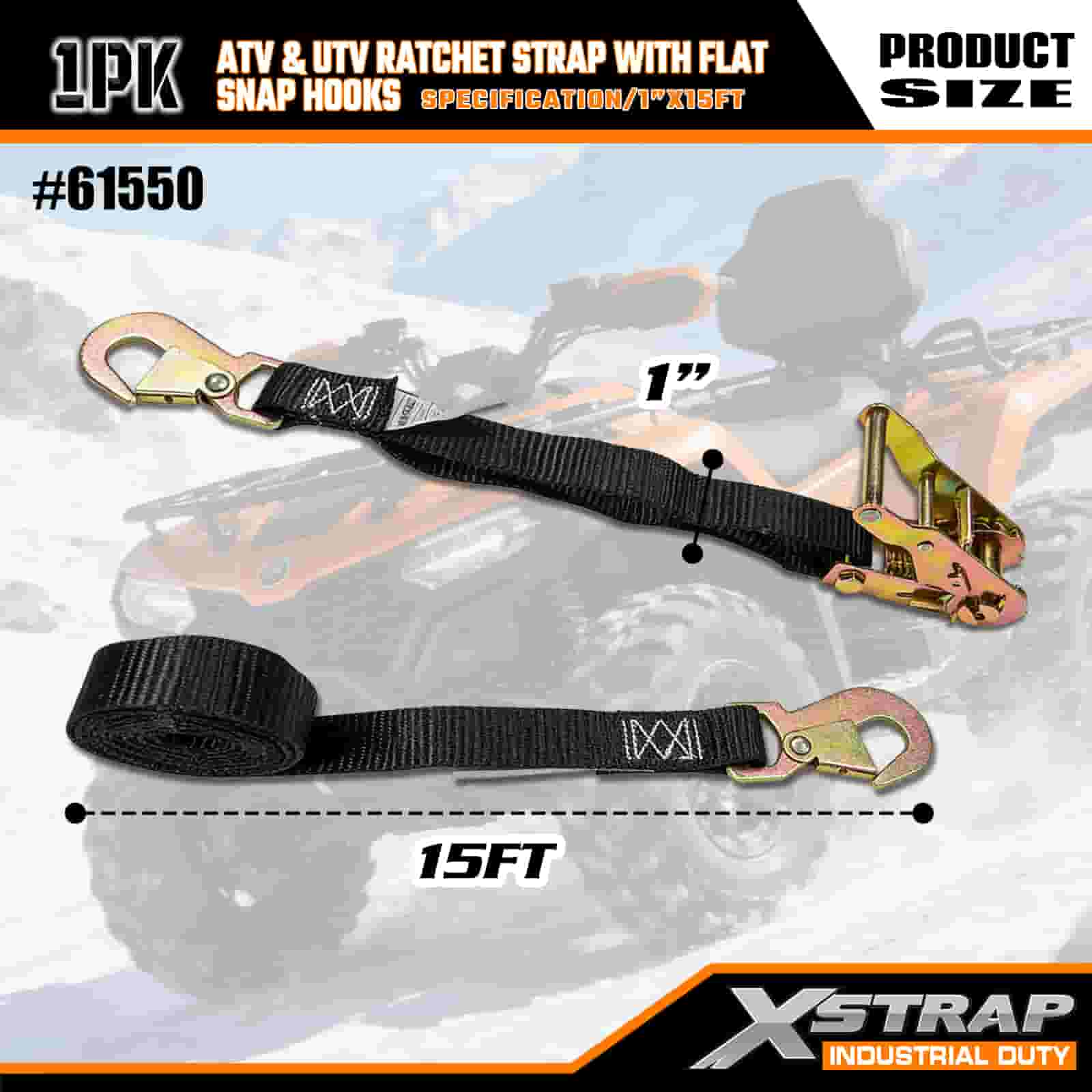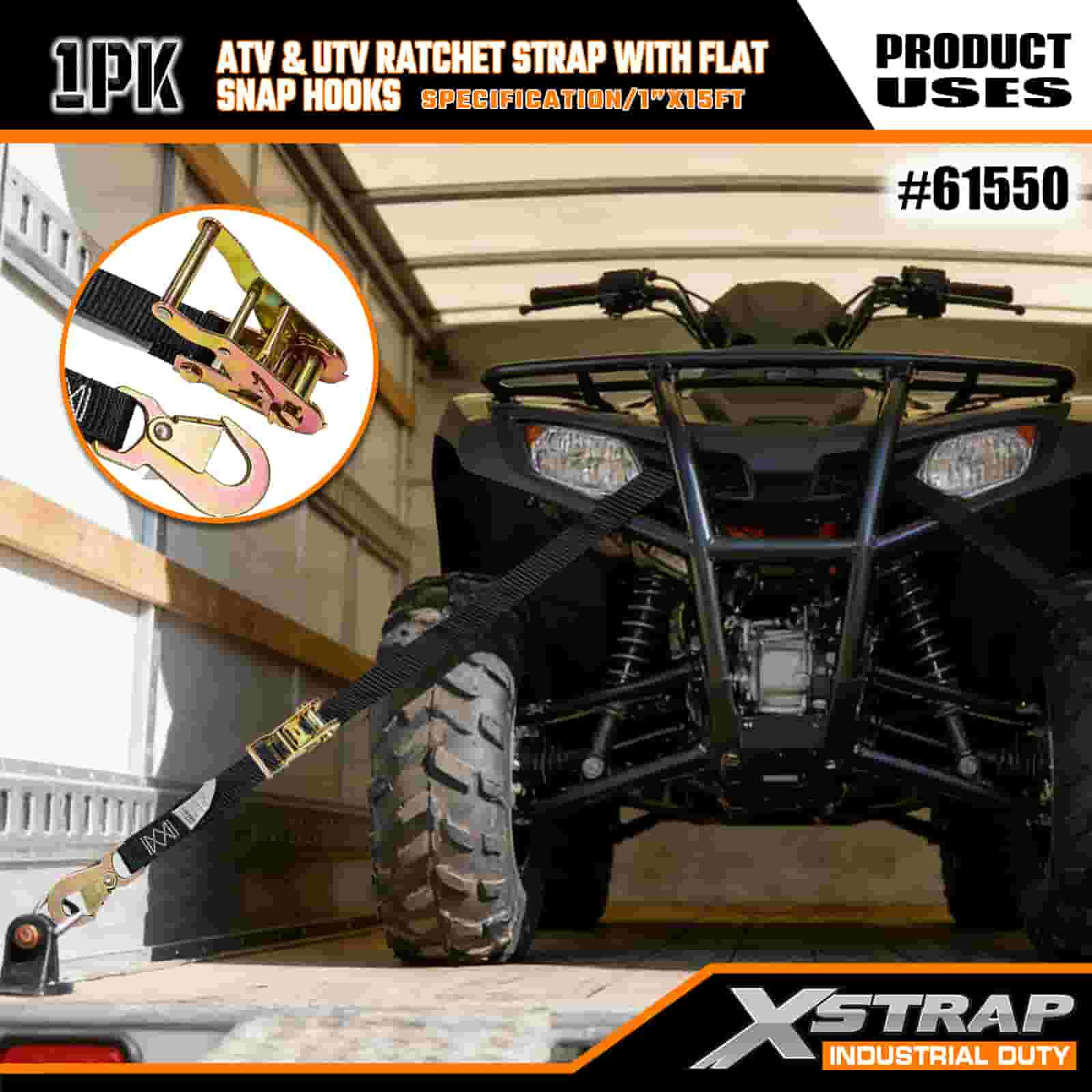Řemínek s ráčnou na ATV a AUV Xstrap s plochými karabinami, 1” x 15' polyesterový popruh s ráčnou, popruhy pro upevnění nákladu s kapacitou 1 000 liber s plochým uzávěrem pro přívěs, lyžařský člun s plochým lůžkem, malé auto, těžké vybavení.