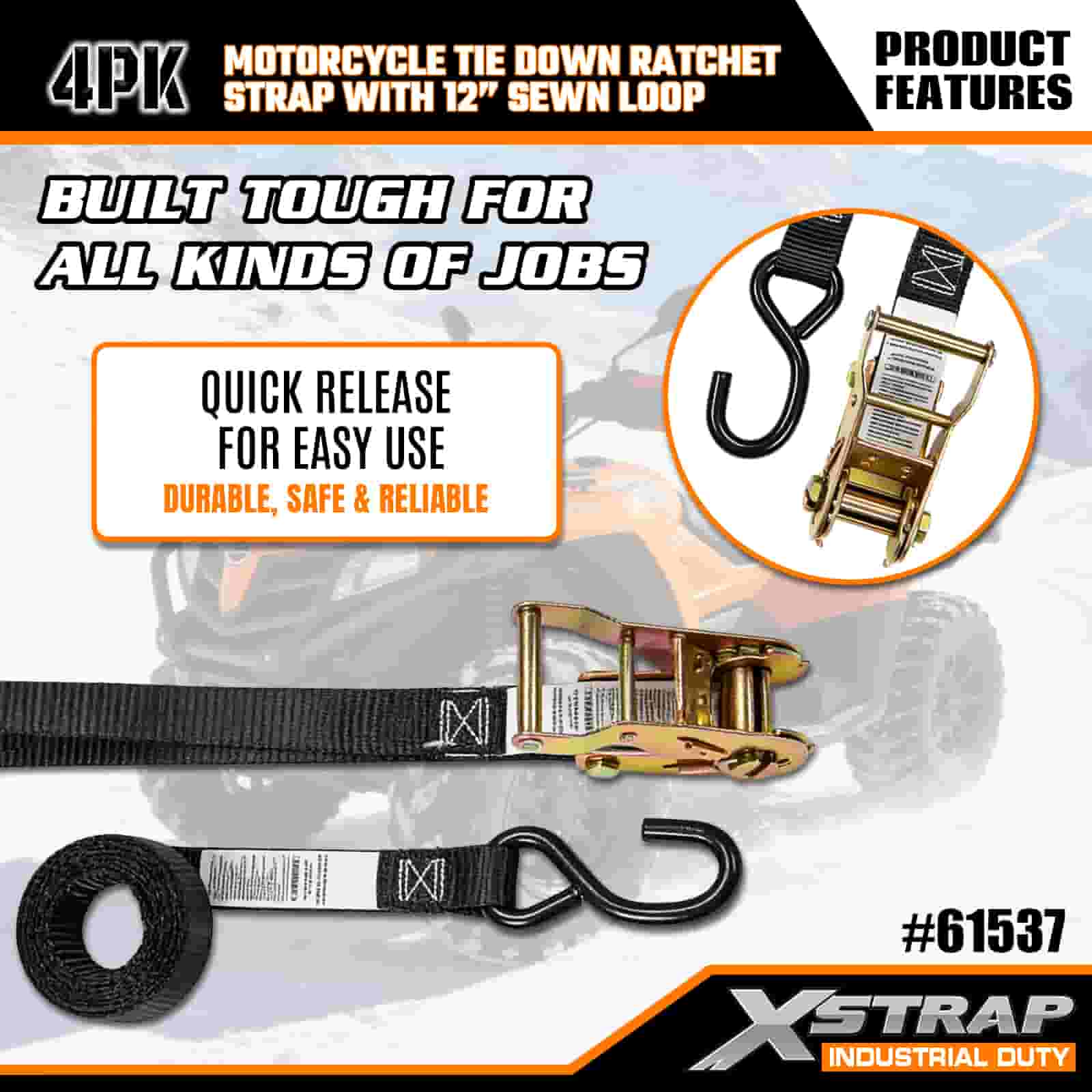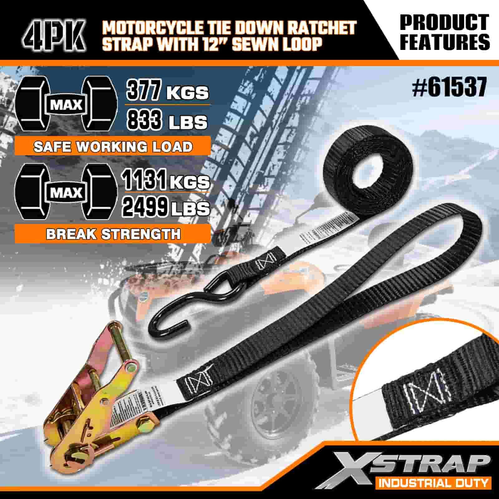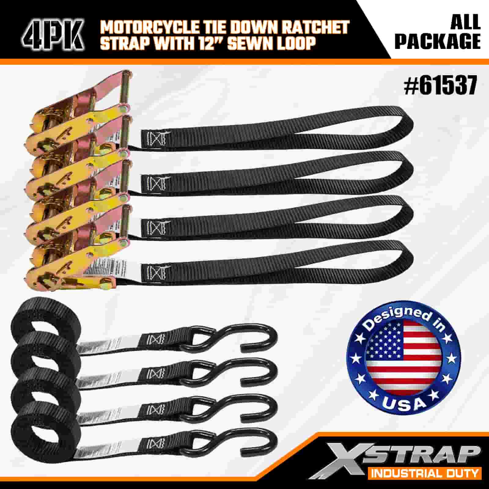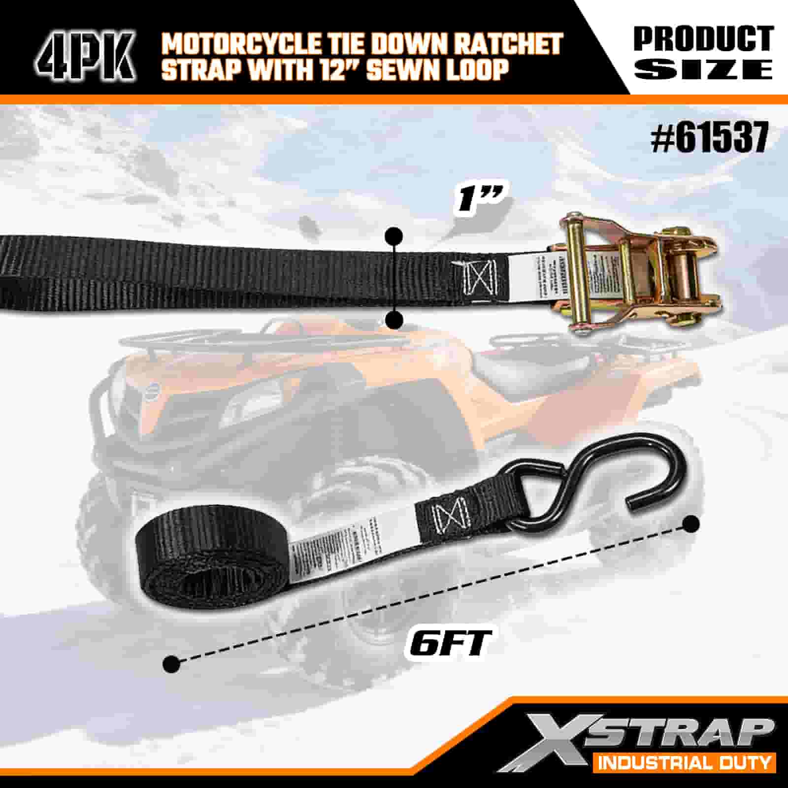 Xstrap 4PK Motocyklový upínací popruh s ráčnou s 12” našitou smyčkou, 1” x 6” polyesterový upínací popruh s ráčnovým popruhem, nosnost 833lbs popruhy pro upevnění nákladu s hákem S pro vážné profesionály k zajištění nákladního přívěsu, plochého přívěsu, malého auta, lyžařského člunu.