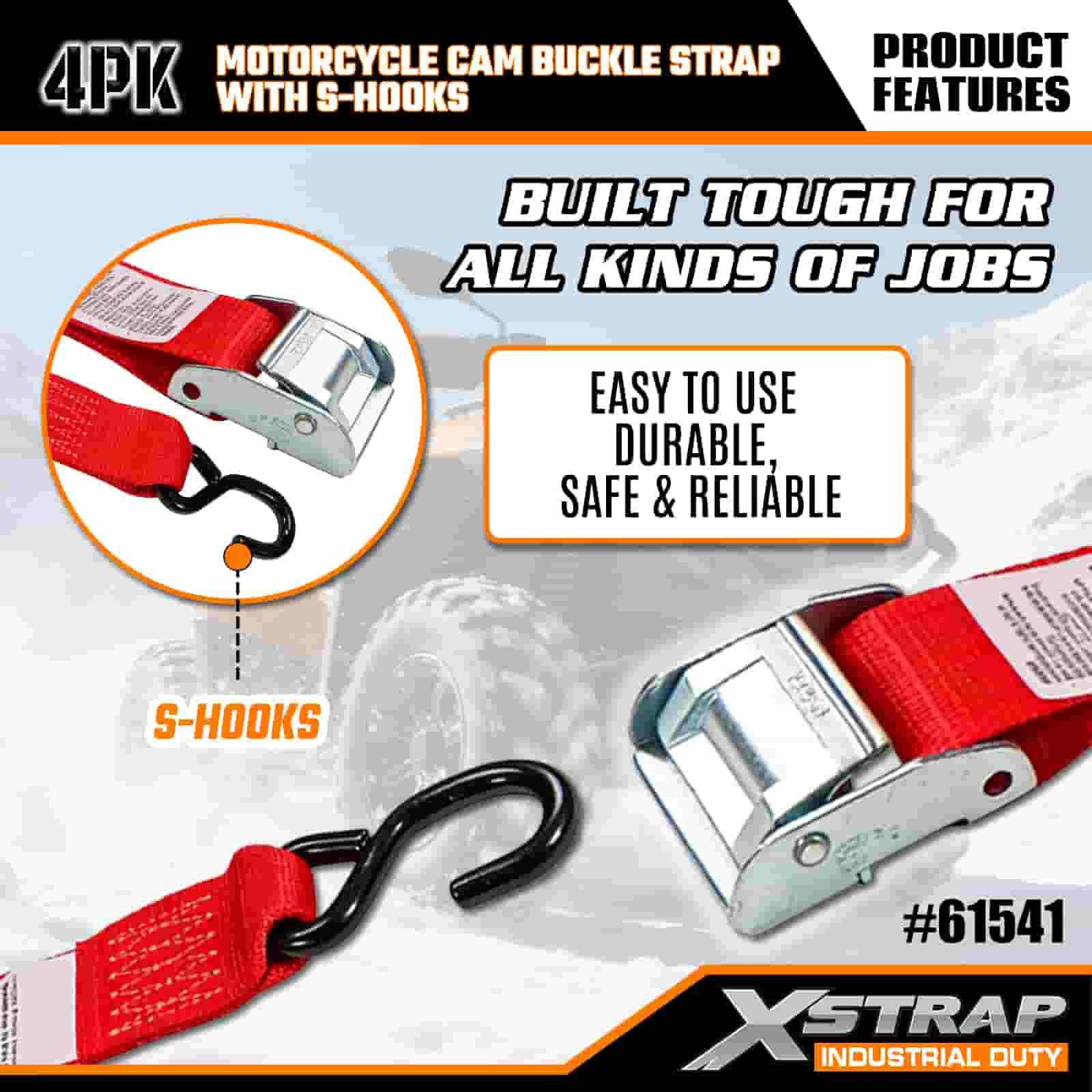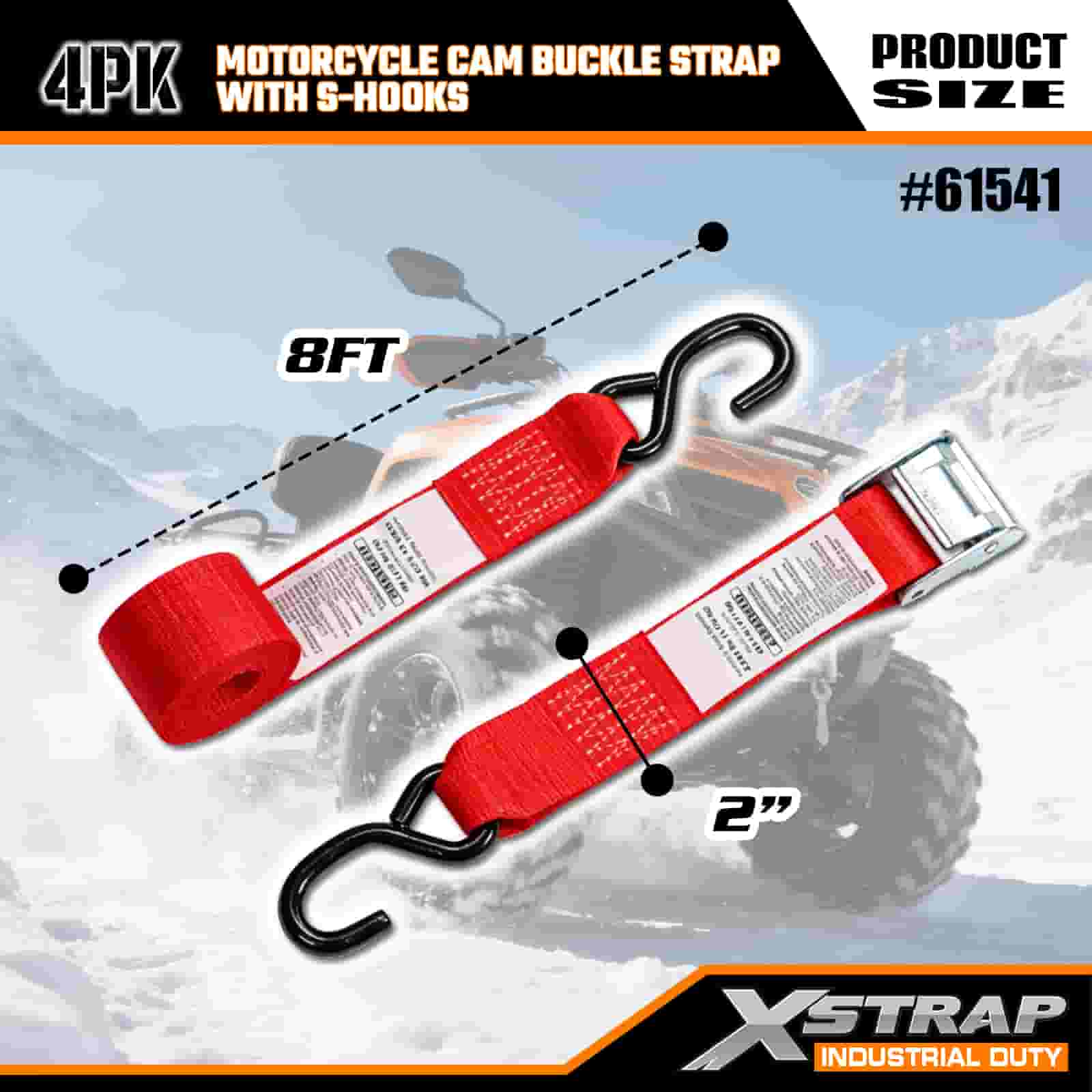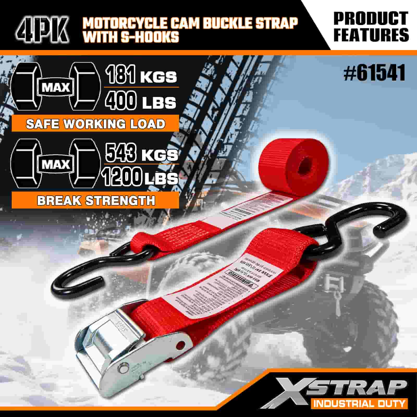 Xstrap 4PK Motocyklový přezkový popruh s hákem S, 2” x 8” polyesterový upínací popruh s ráčnovou přezkou, 400 lbs kapacitní popruhy pro upevnění nákladu s S hákem pro vážné profesionály k zajištění nákladního přívěsu, plochého přívěsu, lyžařského člunu, malého auta.