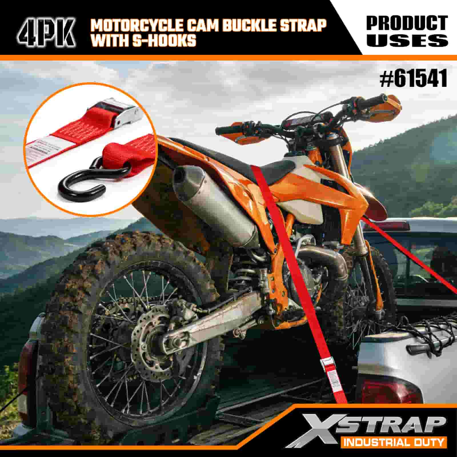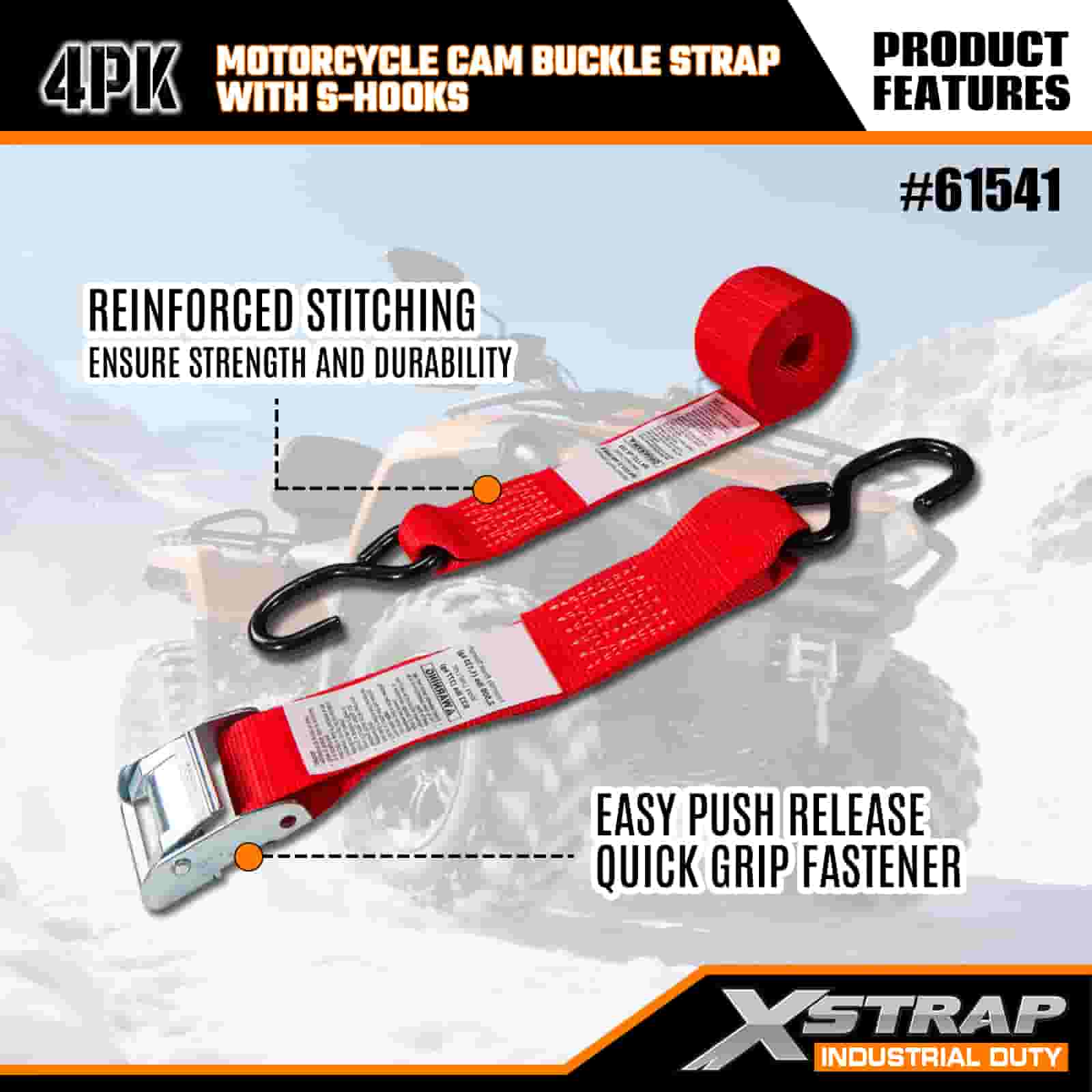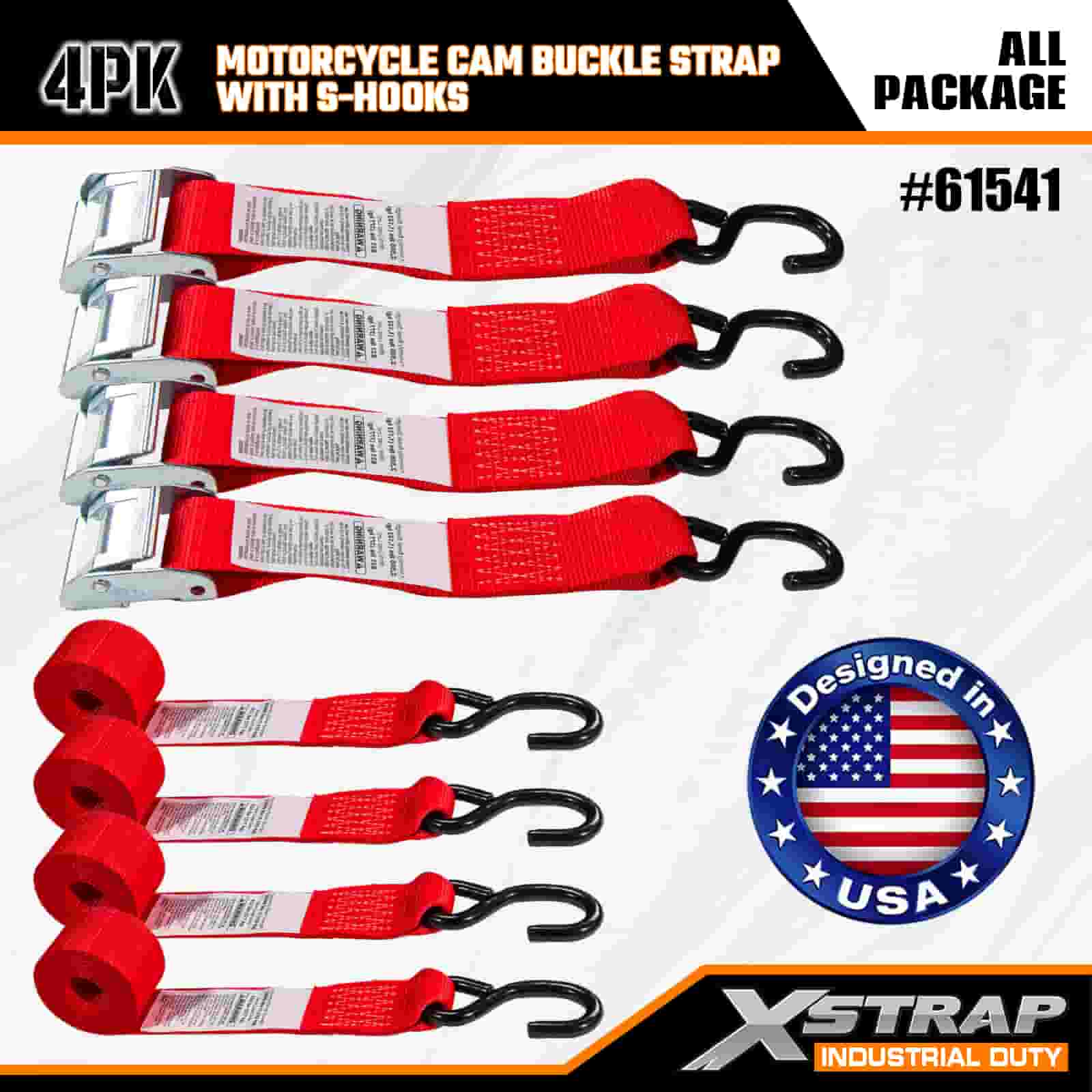 Xstrap 4PK Motocyklový přezkový popruh s hákem S, 2” x 8” polyesterový upínací popruh s ráčnovou přezkou, 400 lbs kapacitní popruhy pro upevnění nákladu s S hákem pro vážné profesionály k zajištění nákladního přívěsu, plochého přívěsu, lyžařského člunu, malého auta.