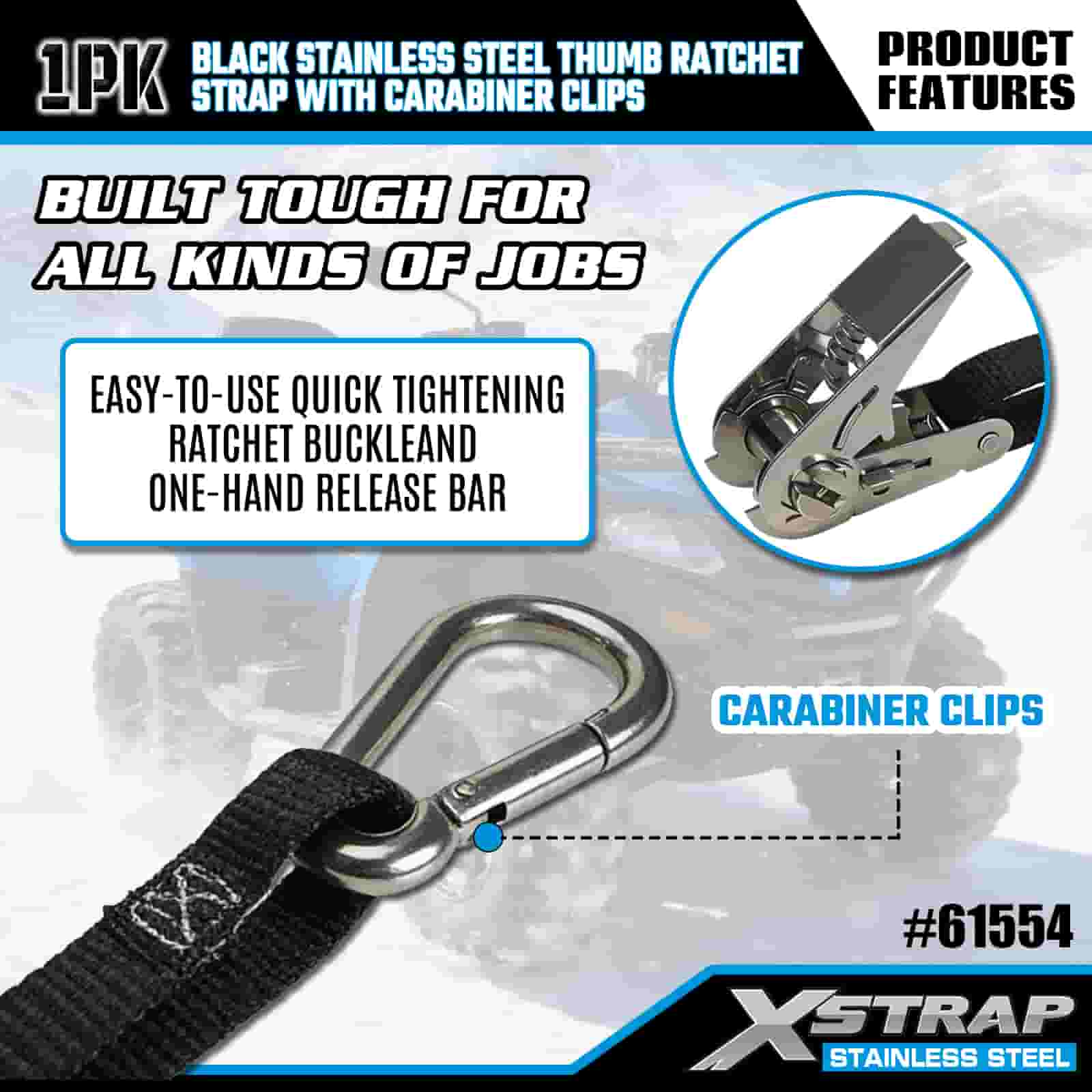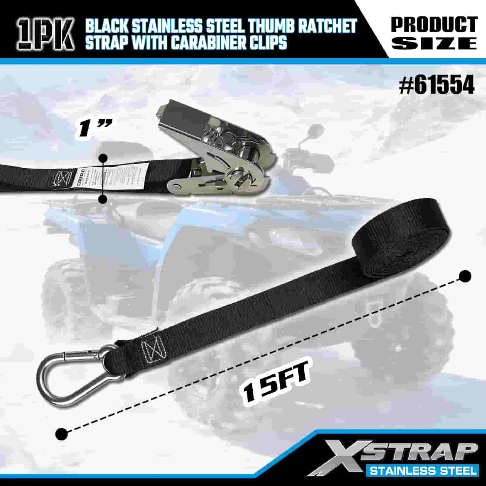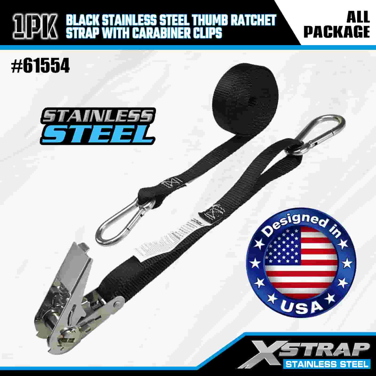 Xstrap Černá nerezová ráčna na palec s karabinovými sponami, 1” x 10” polyesterový popruh s ráčnou, popruhy pro zajištění nákladu s kapacitou 166 lbs s karabinami pro přívěs, plochý přívěs lyžařský člun, malé auto, těžký vůz.