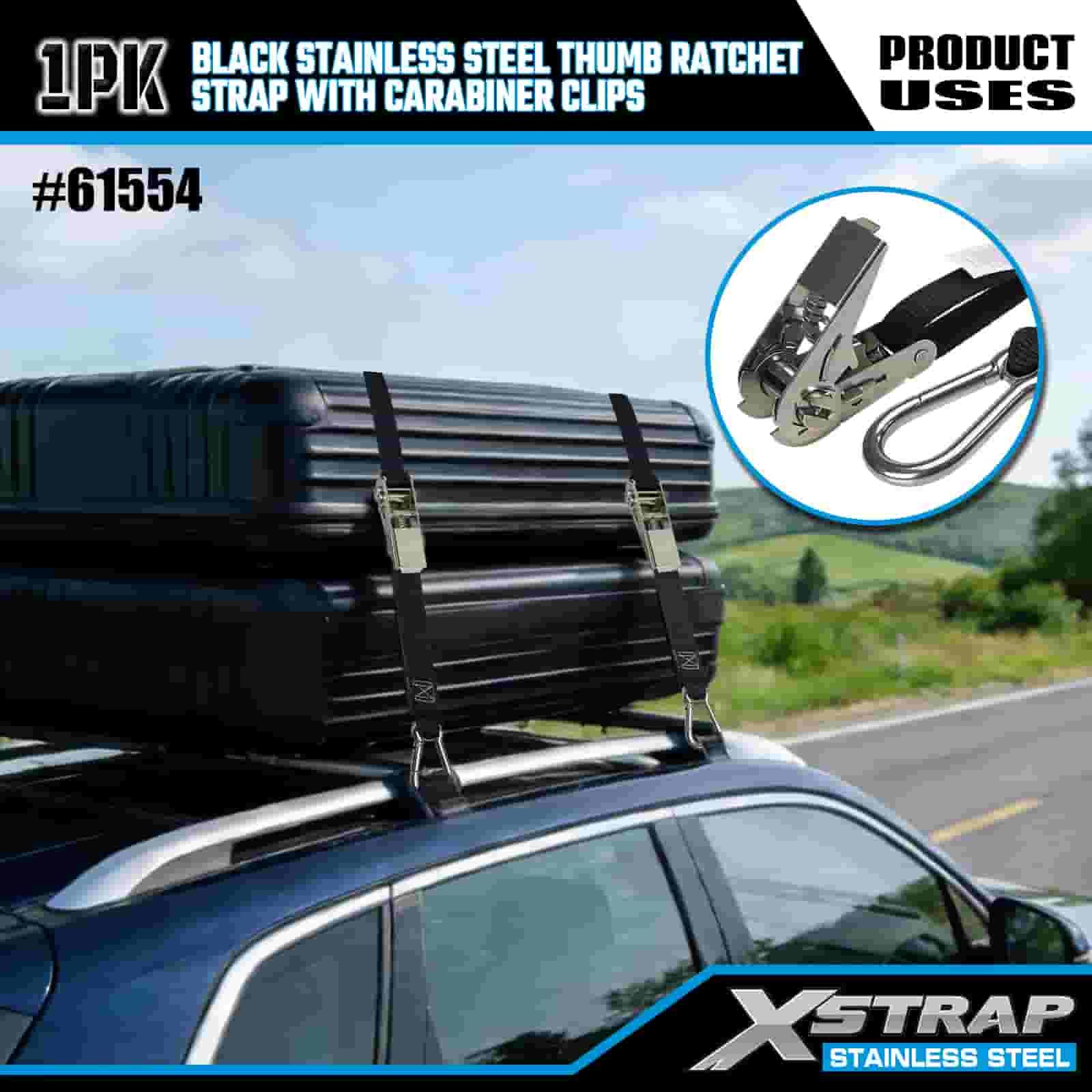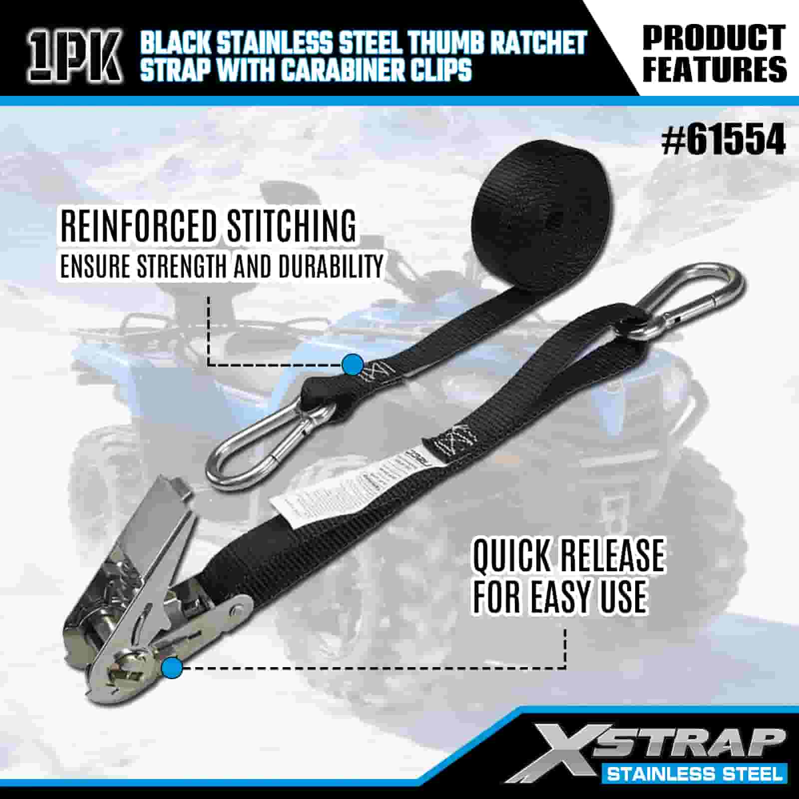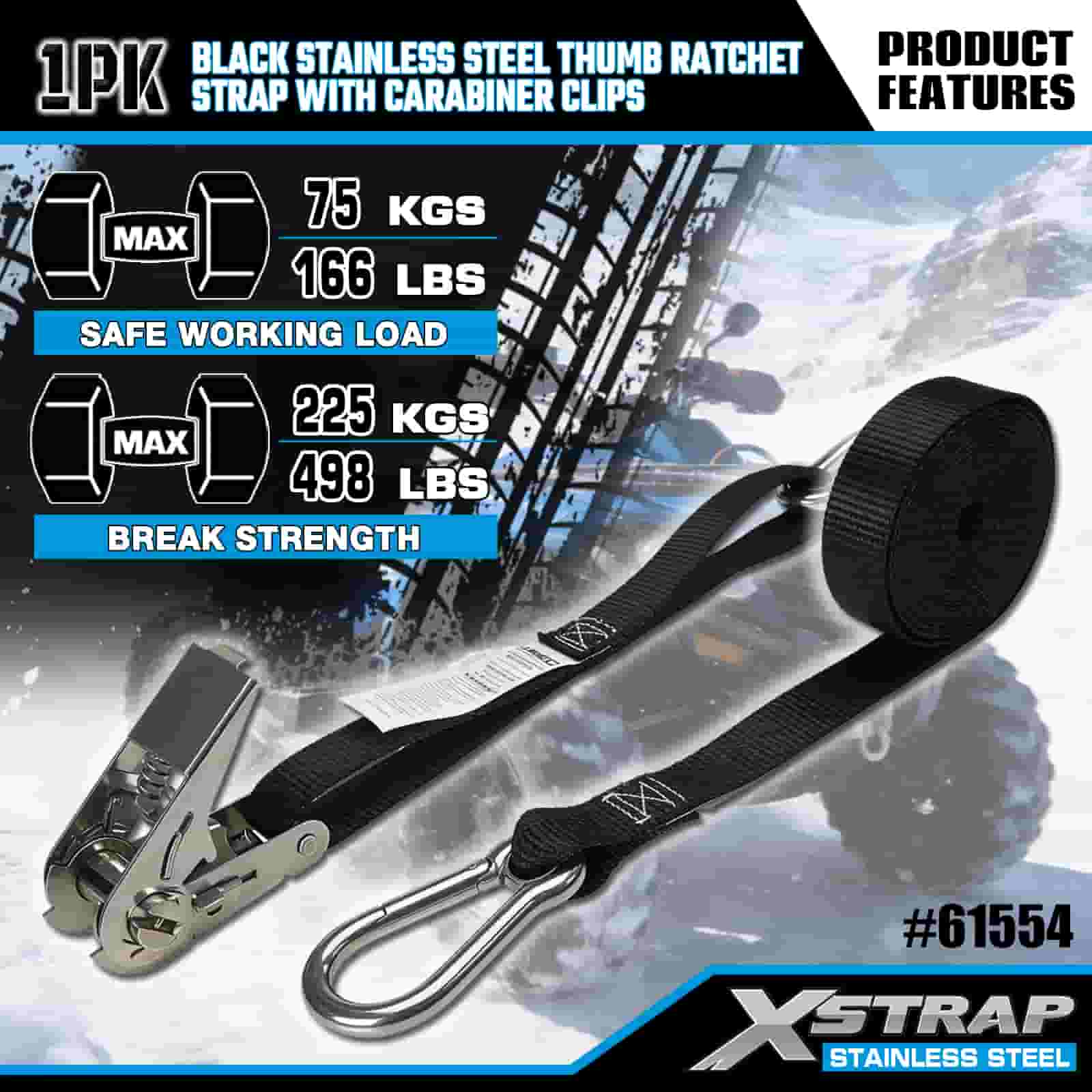 Xstrap Černá nerezová ráčna na palec s karabinovými sponami, 1” x 10” polyesterový popruh s ráčnou, popruhy pro zajištění nákladu s kapacitou 166 lbs s karabinami pro přívěs, plochý přívěs lyžařský člun, malé auto, těžký vůz.