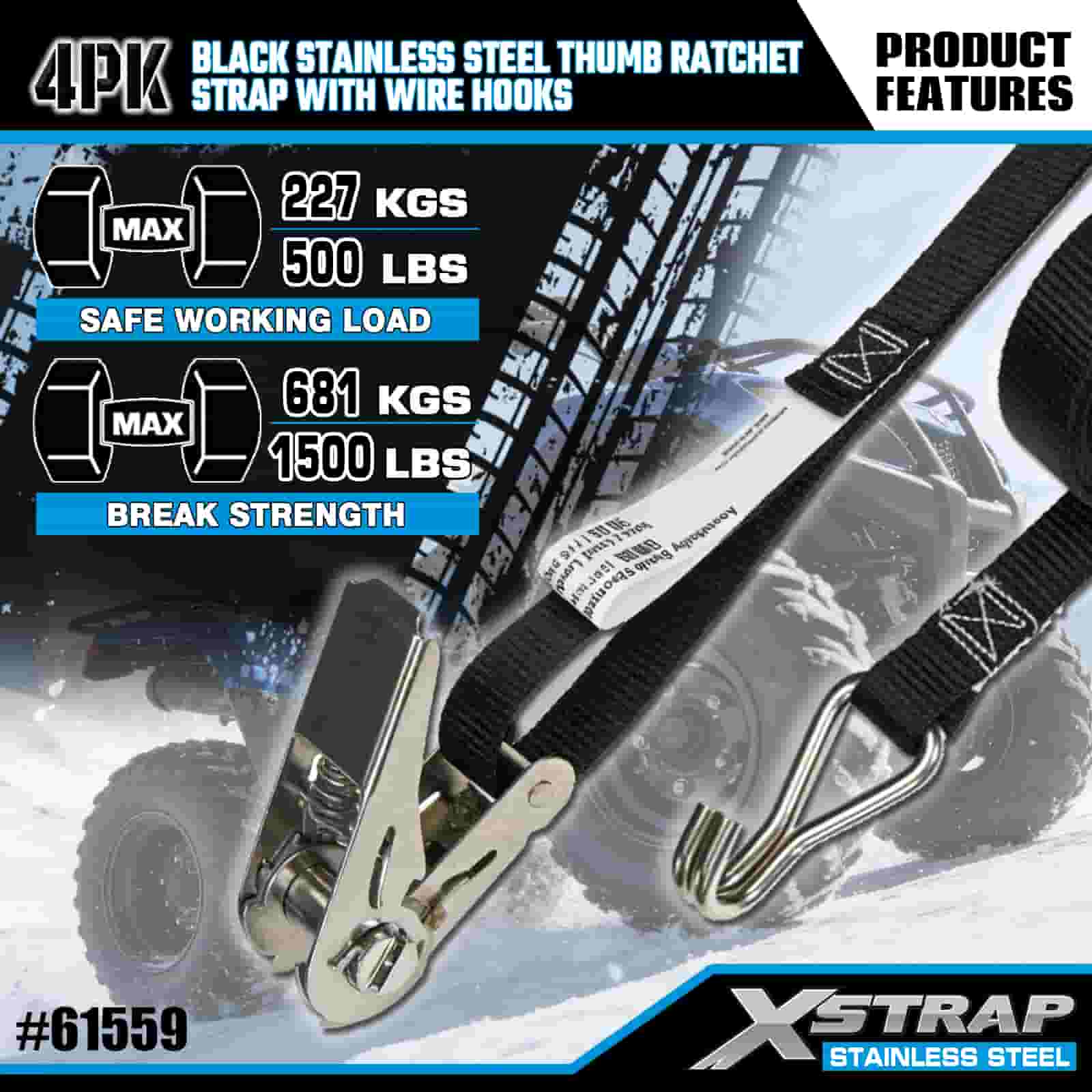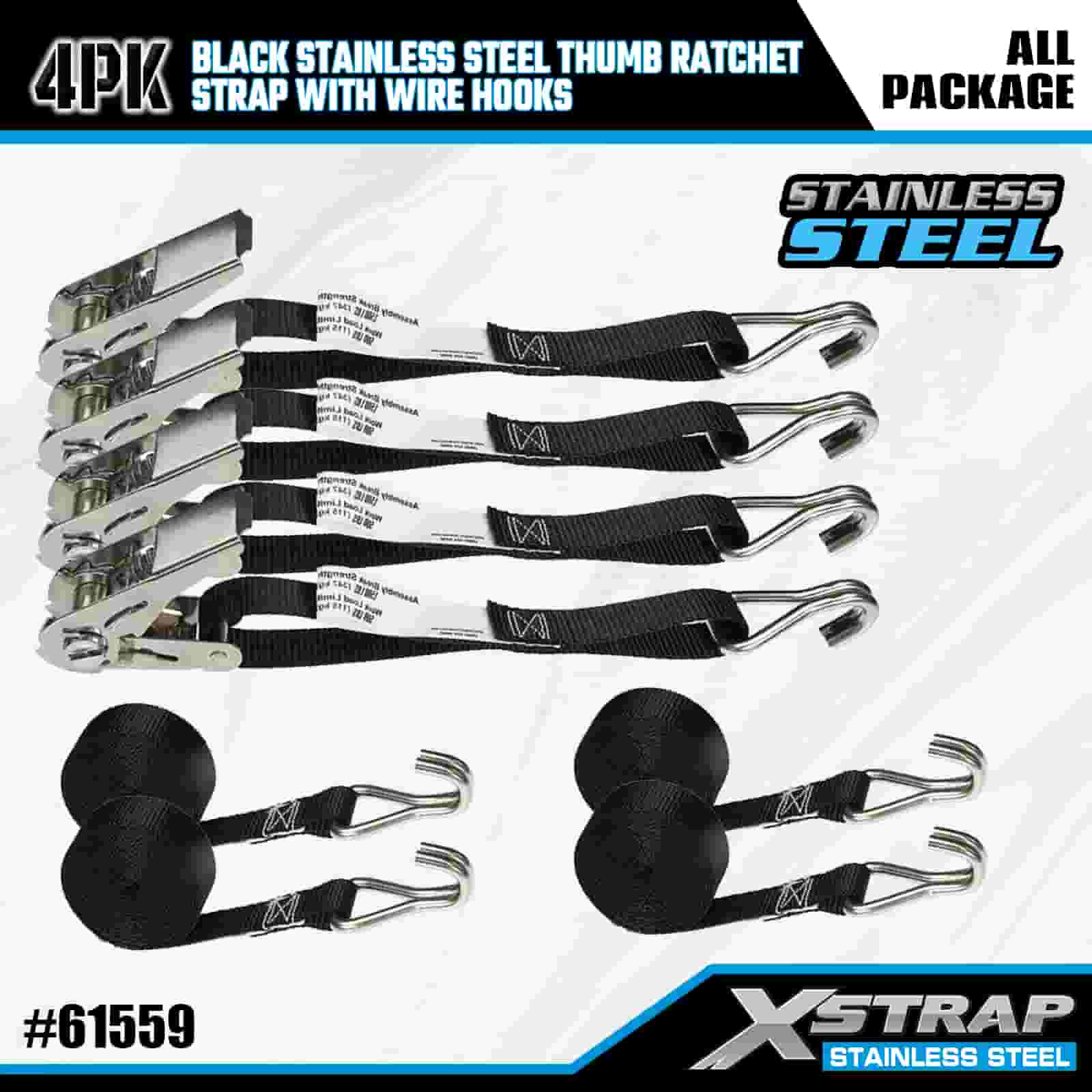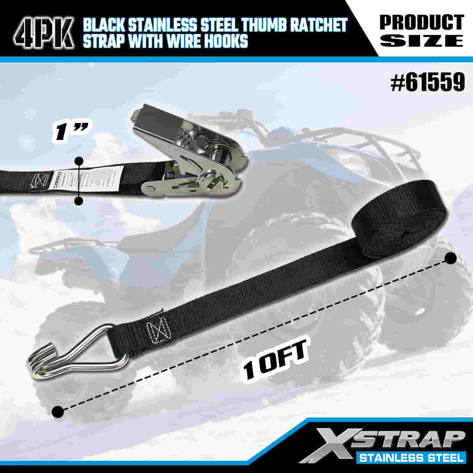 Xstrap 4PK Černá ráčna na palec z nerezové oceli s drátěnými háky, 1” x 10’ polyesterový upínací pásek s ráčnou, 500 lbs kapacitní popruhy pro upevnění nákladu s drátěnými háky pro přívěs, lyžařský člun s plochým lůžkem, malé auto, těžké vybavení.