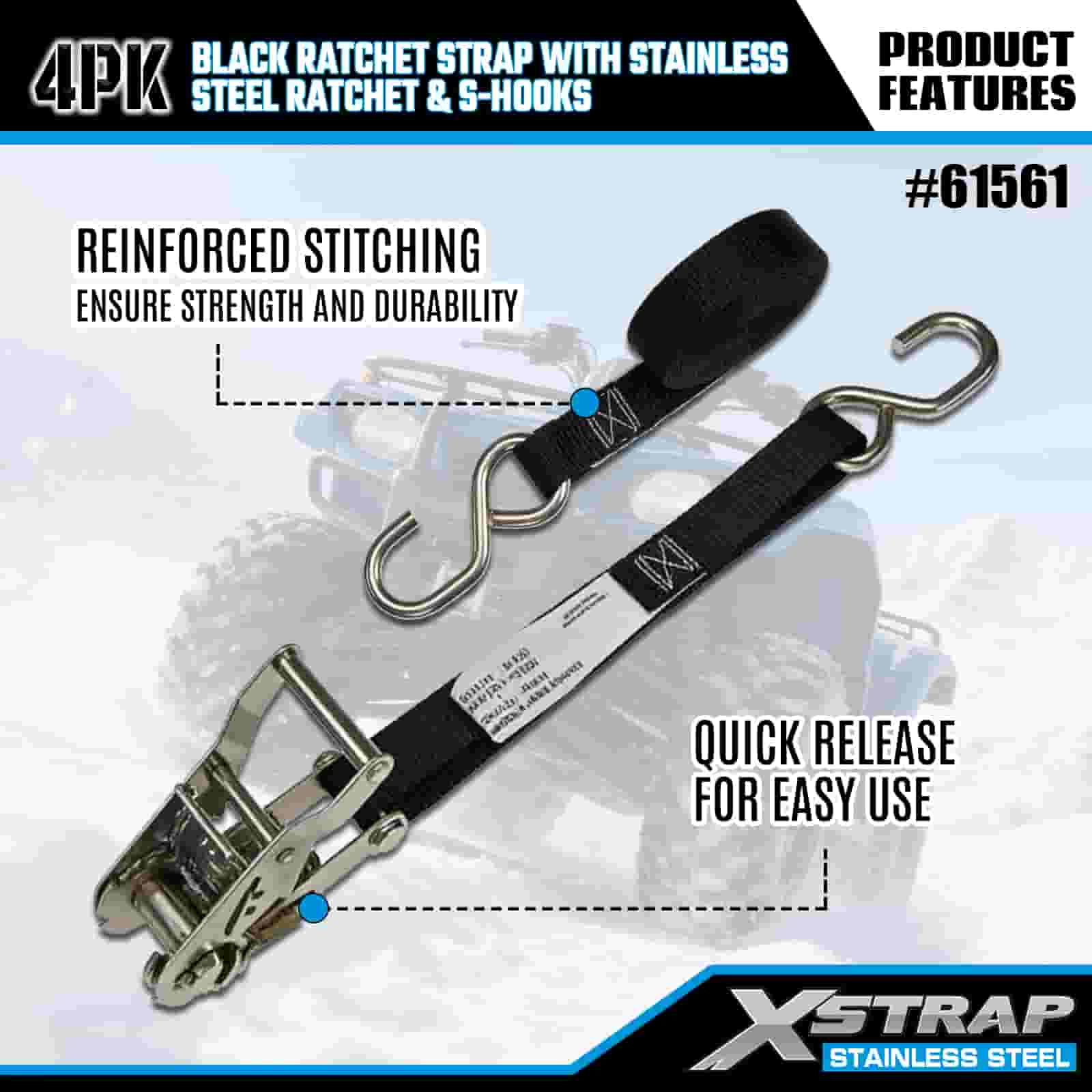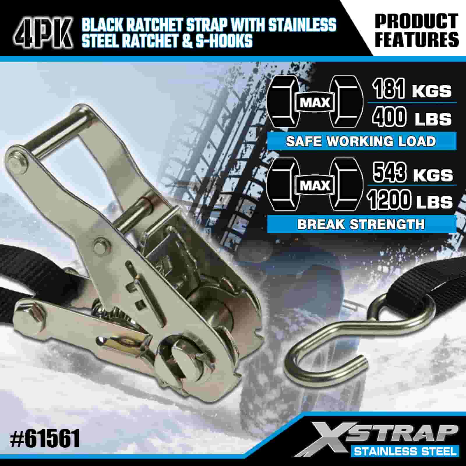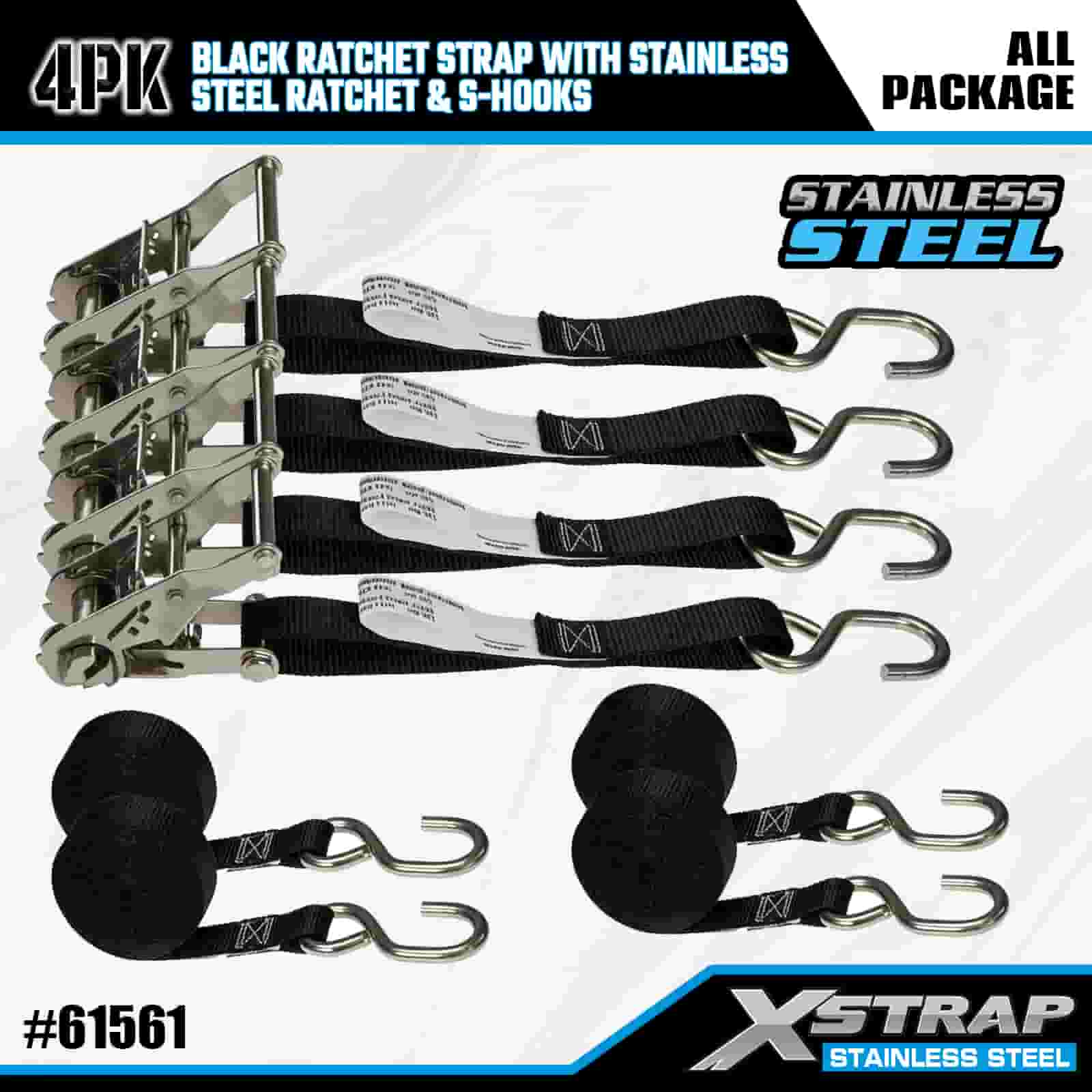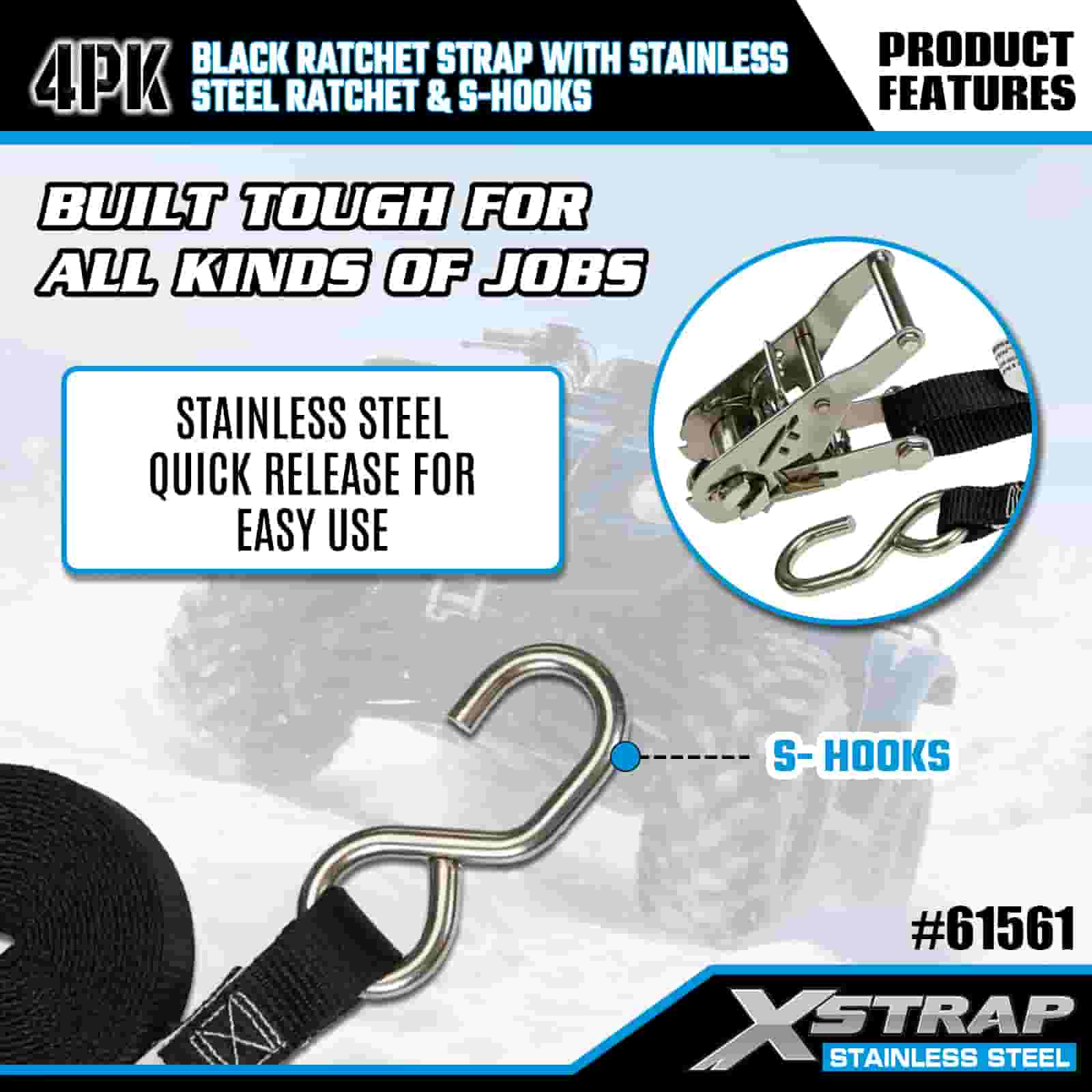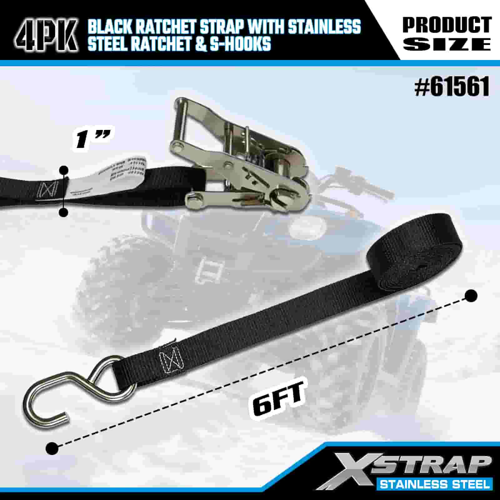 Xstrap 4PK černý ráčnový popruh s ráčnou z nerezové oceli a S háčky, 1" x 6" polyesterový upínací popruh ráčnový popruh, 400 lbs kapacitní popruhy pro upevnění nákladu s háčky S pro přívěs, plochý přívěs lyžařský člun, malé auto, těžké vybavení.