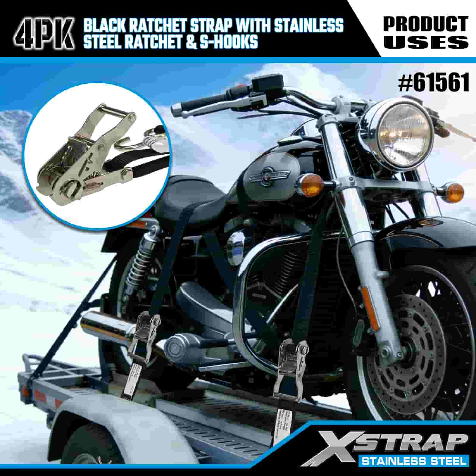 - Kompaktní pohonná jednotka, vytvořená pro přepravu motocyklů a čtyřkolek: Tato 4 sada ráčnových popruhů, navržená speciálně pro zajištění motocyklů a čtyřkolek na přívěsech, poskytuje spolehlivé držení bez velkého objemu. 20 let zkušeností společnosti XStrap v oblasti kontroly nákladu zajišťuje, že vaše jízda zůstane na místě, a to i na hrbolatých horských silnicích.