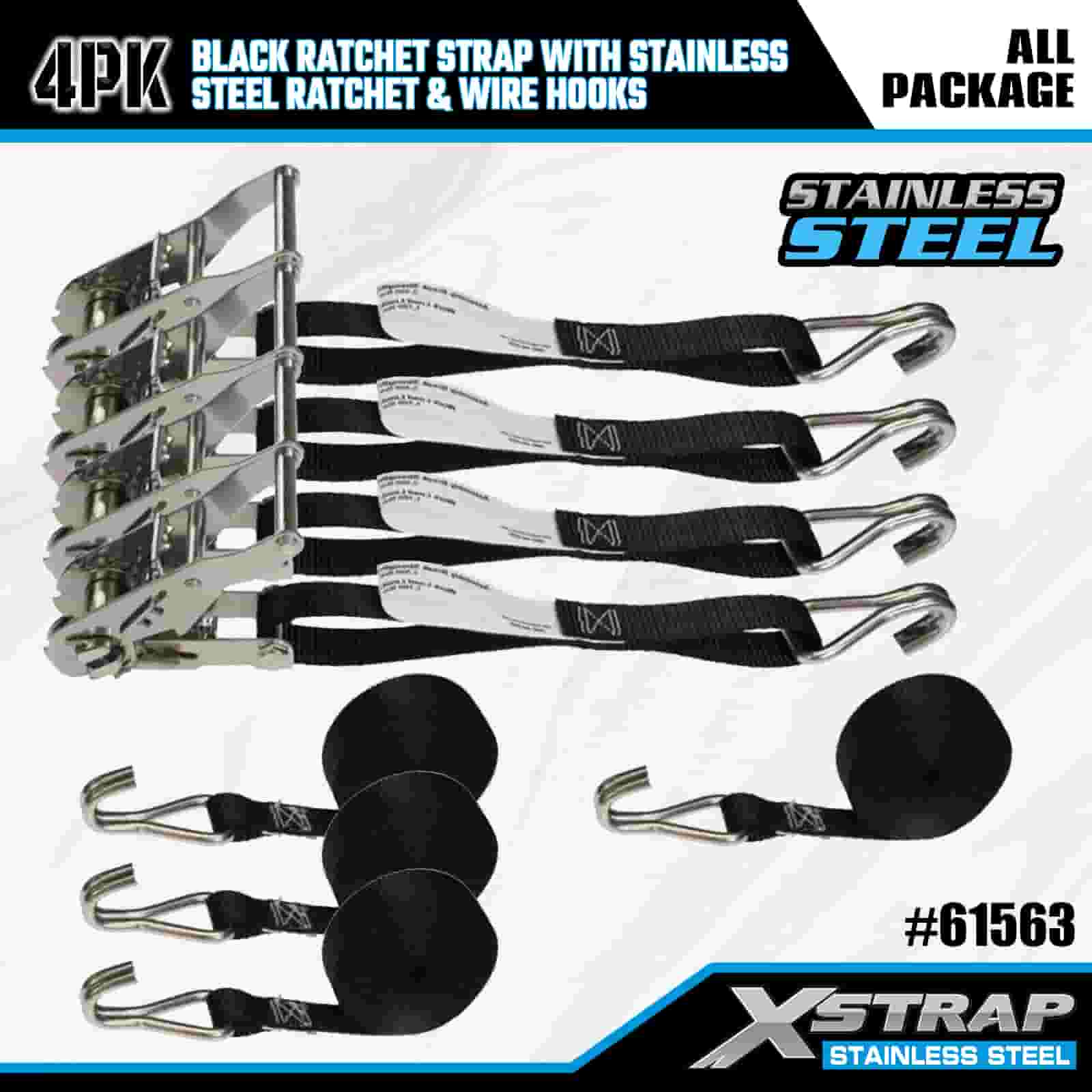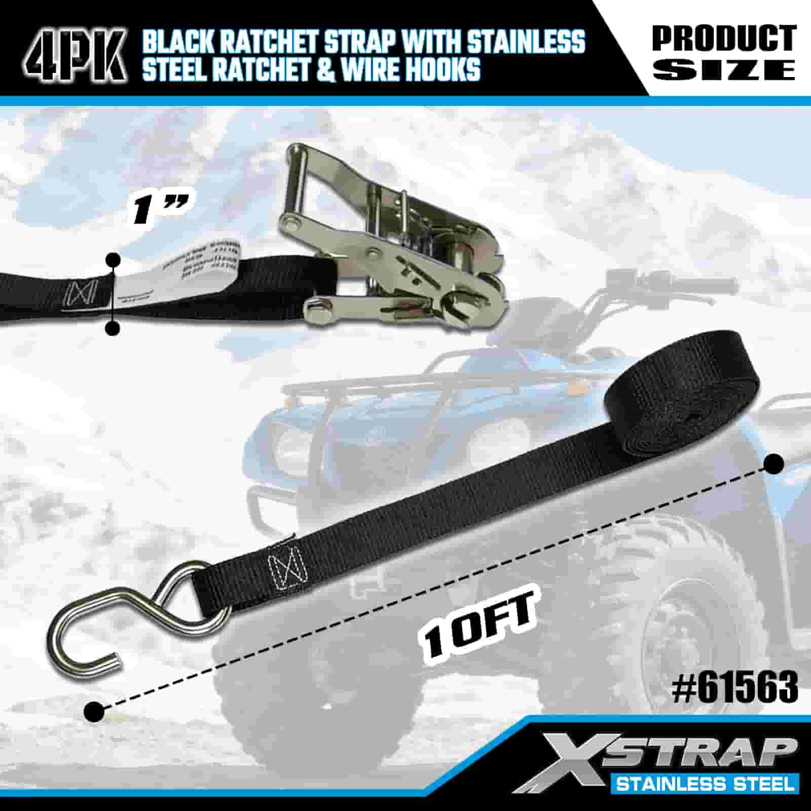 Xstrap 4PK černý ráčnový popruh s ráčnou z nerezové oceli a drátěnými háky, 1” x 10’ polyesterový upínací popruh ráčnový popruh, 1000 lbs kapacitní popruhy pro upevnění nákladu s drátěnými háky pro přívěs, plochý přívěs lyžařský člun, malé auto, těžké vybavení.