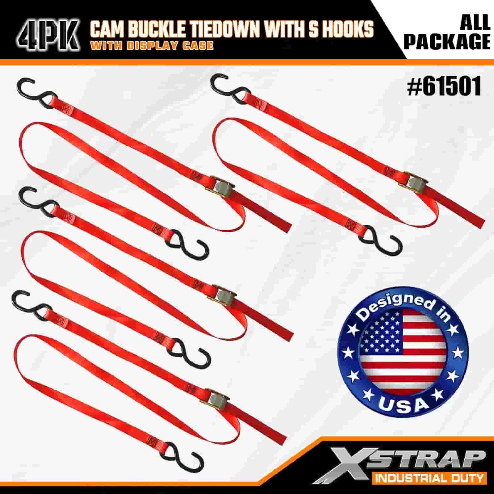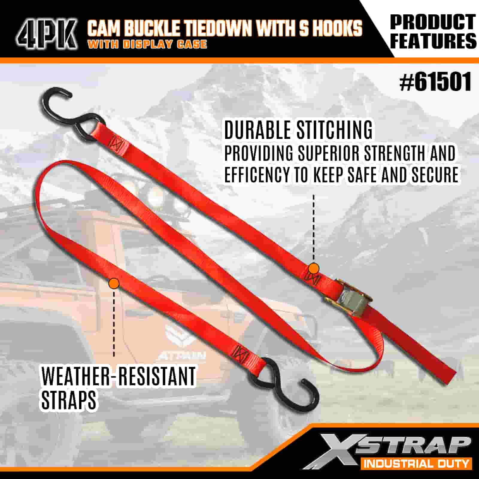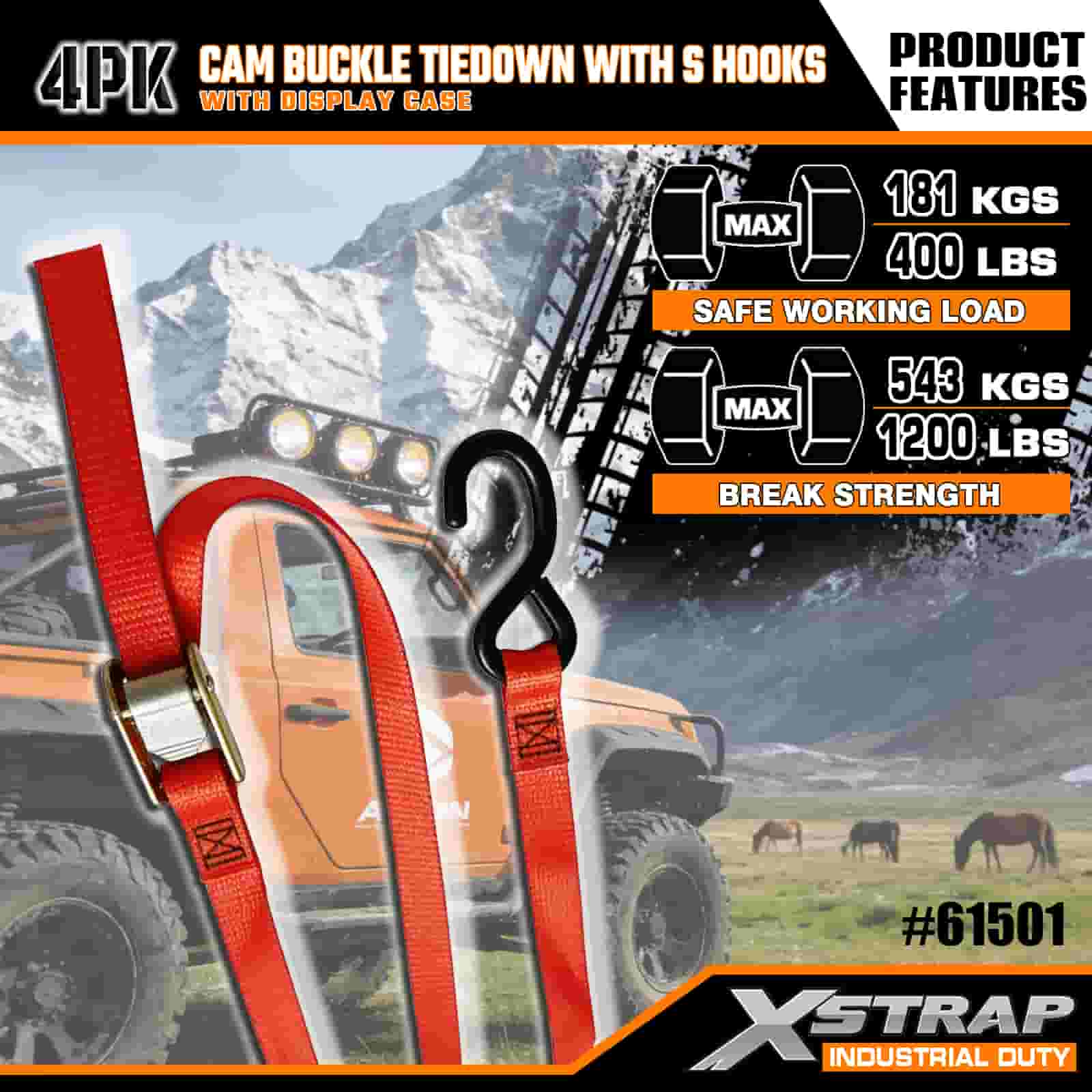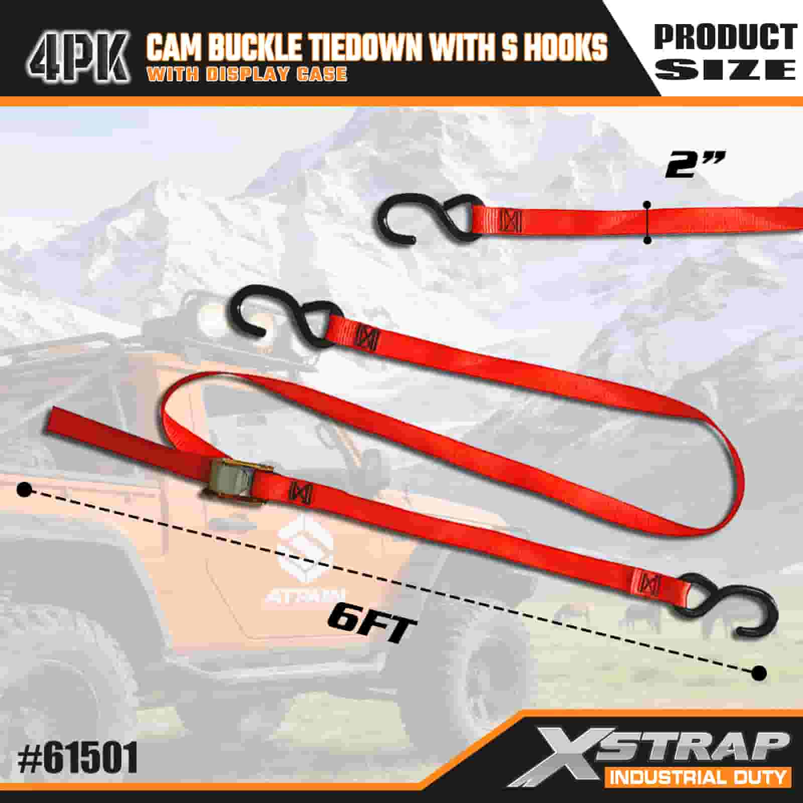 Xstrap 4 Pack Cam Buckle Upevňovací popruhy s S háčky, 2" x 6" Polyesterový upínací popruh s Cam přezkou, 400 lbs Nosnost 400 lbs Upevňovací popruhy nákladu s S háčky pro vážné profesionály k zajištění nákladního přívěsu, plochého přívěsu, lyžařského člunu, malého auta.