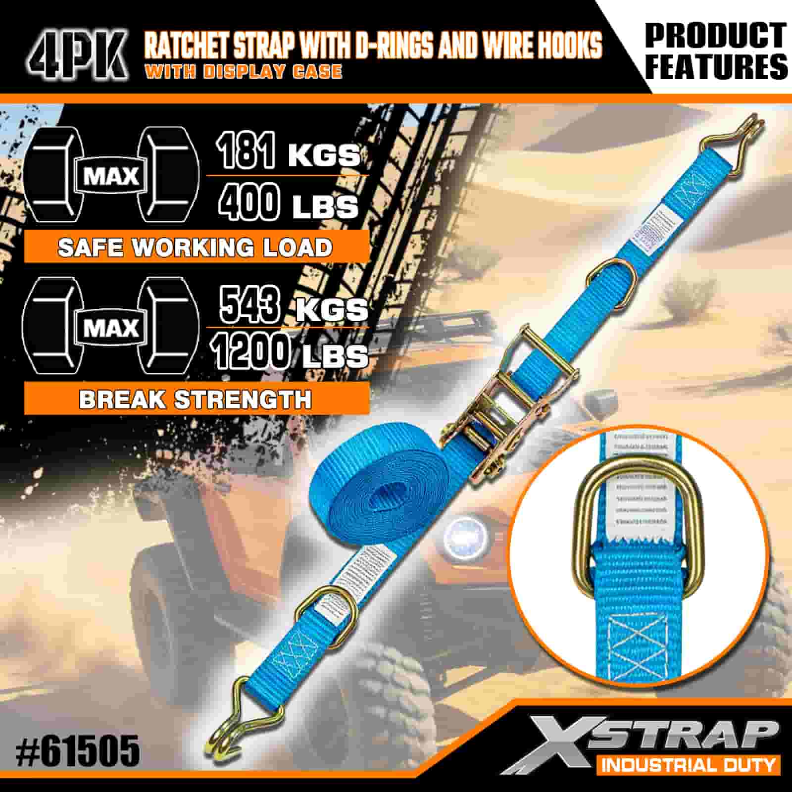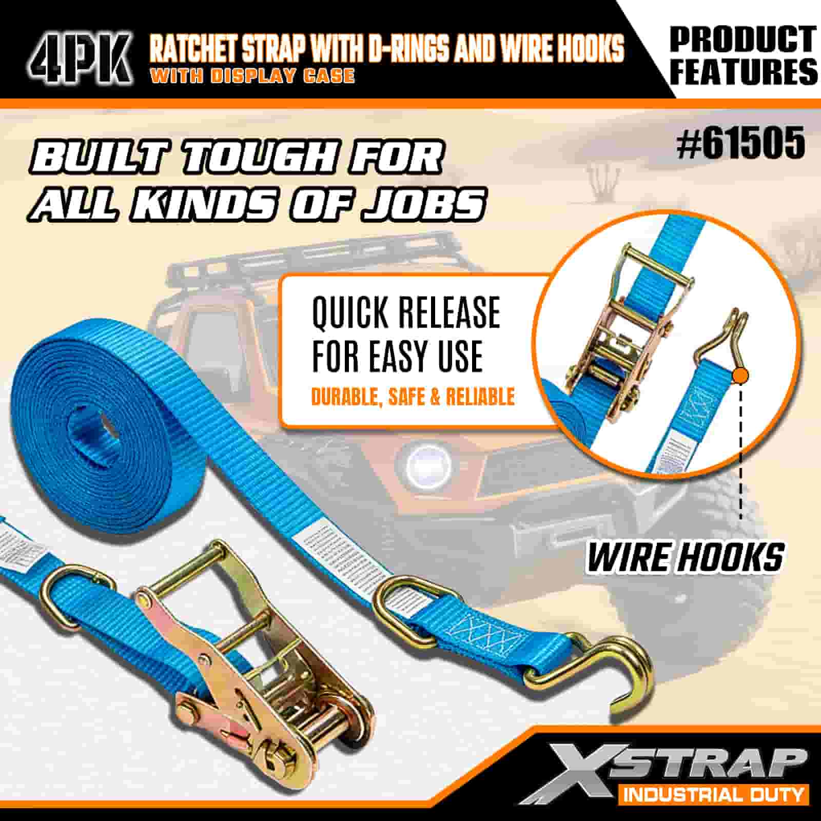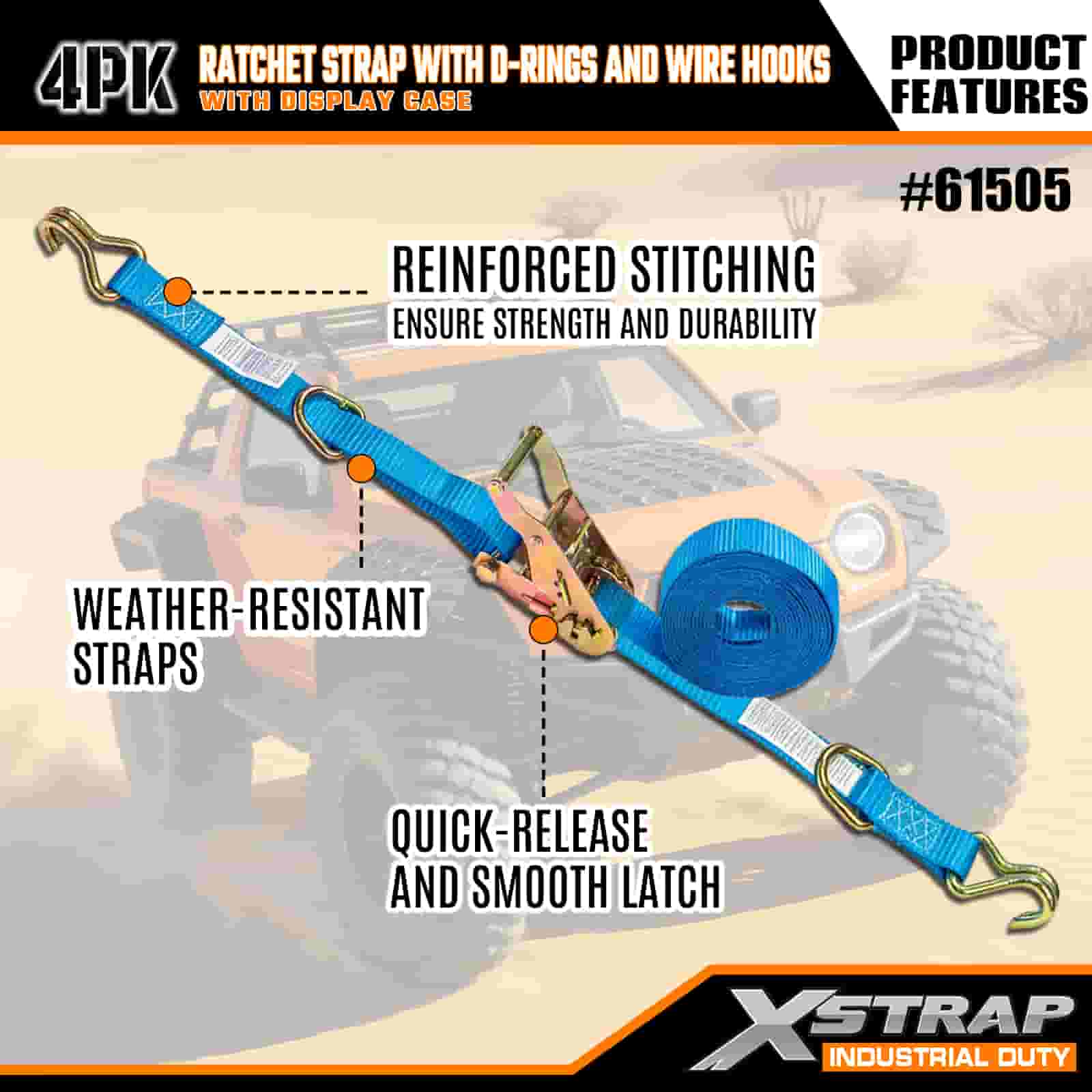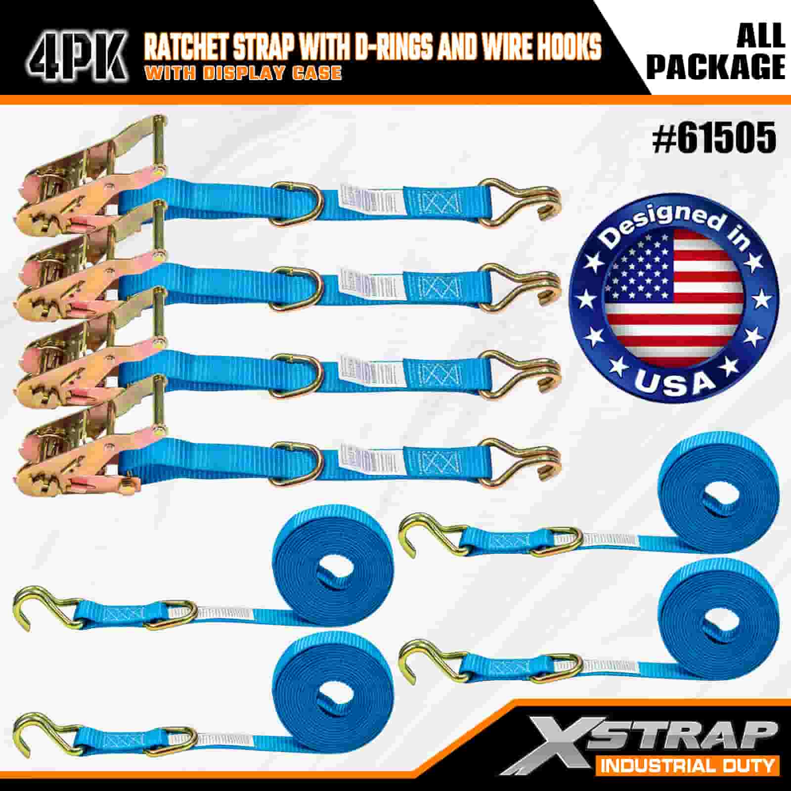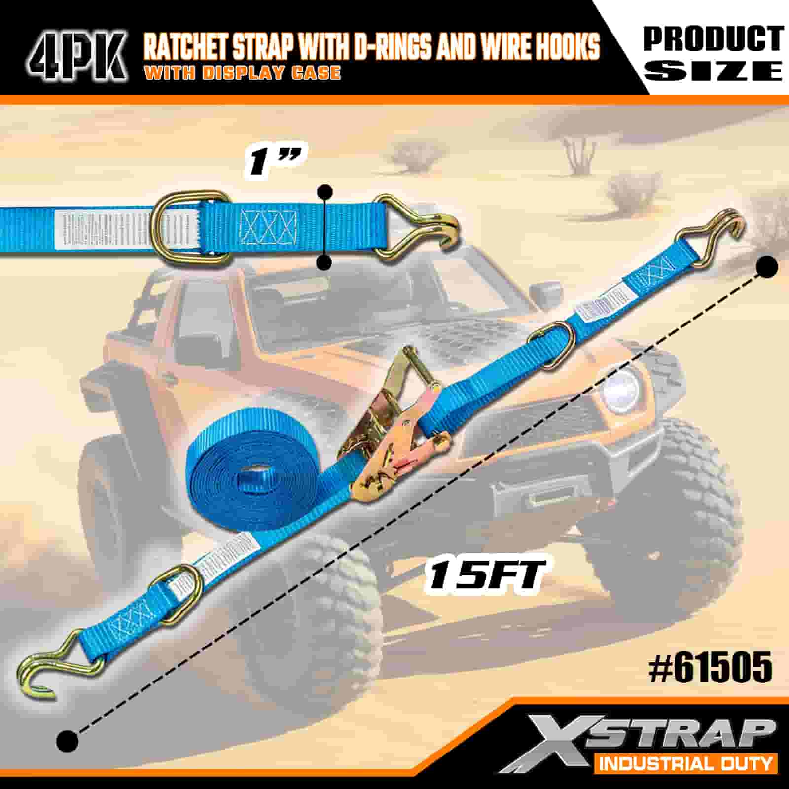 Xstrap 4 Pack Cam spona s D-kroužkem a drátěnými háčky, 1” x 15” polyesterový upínací pásek s ráčnou, 400 lbs Kapacita 400 lbs popruhy pro upevnění nákladu s drátěnými háčky pro vážné profesionály k zajištění nákladního přívěsu, plochého přívěsu, lyžařského člunu, malého auta.