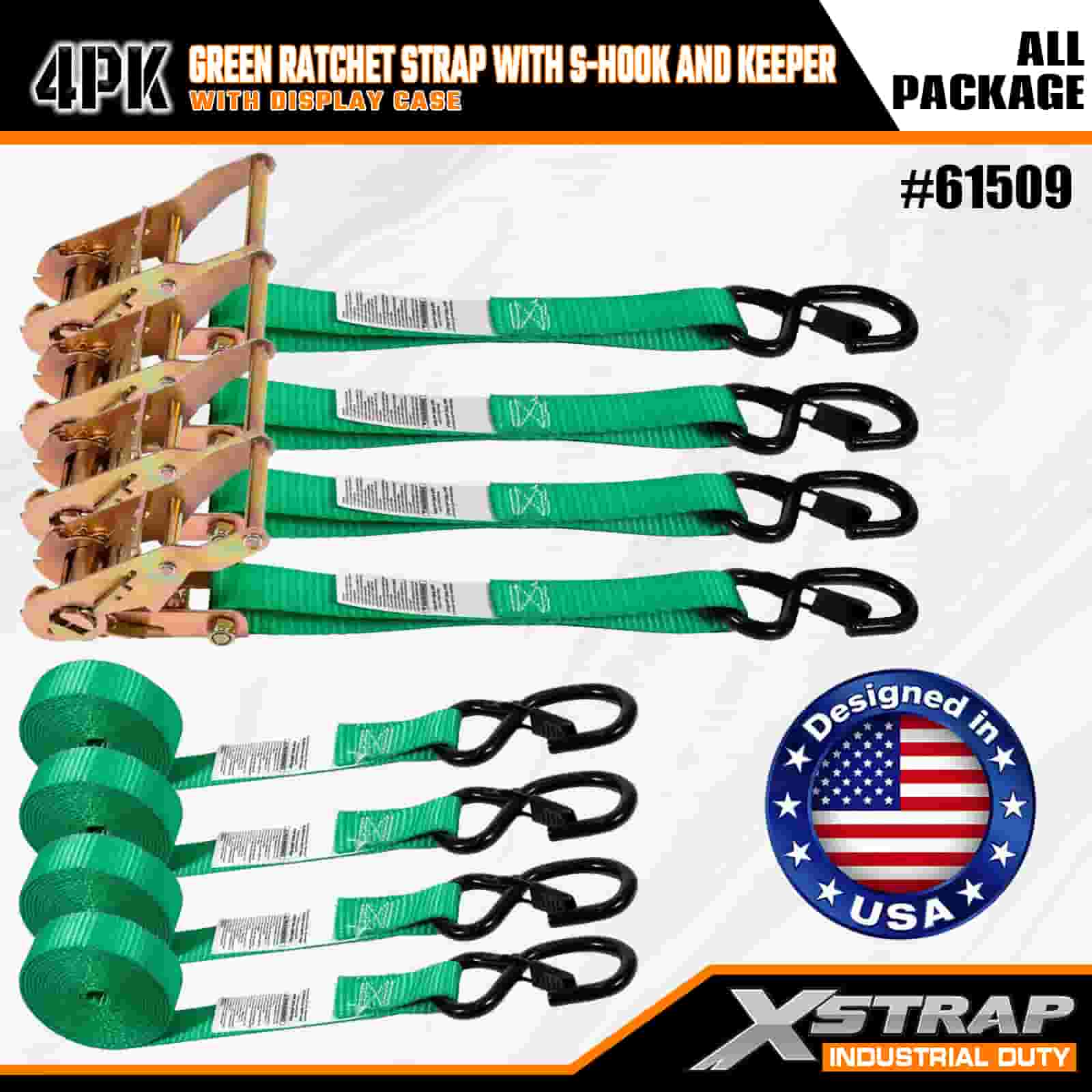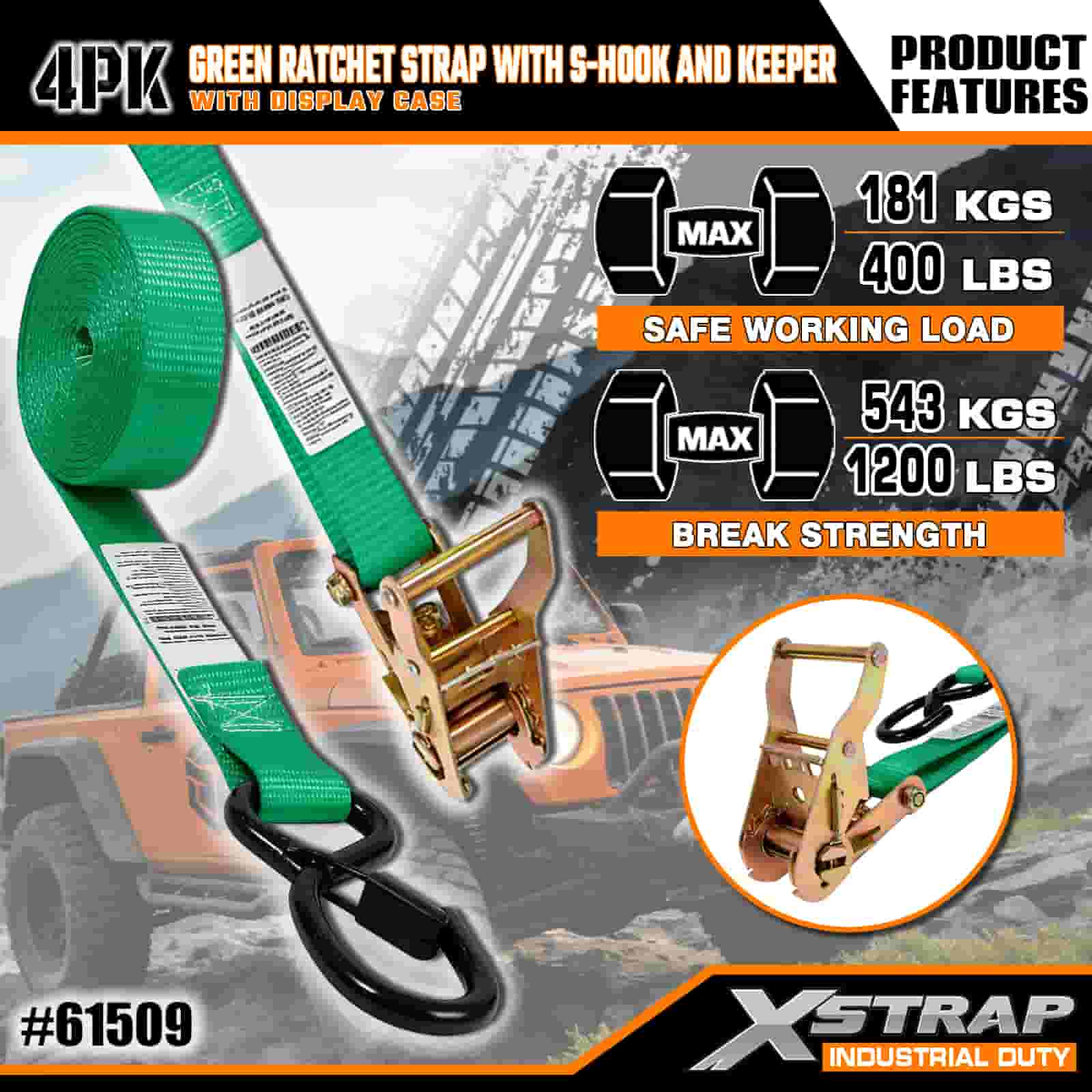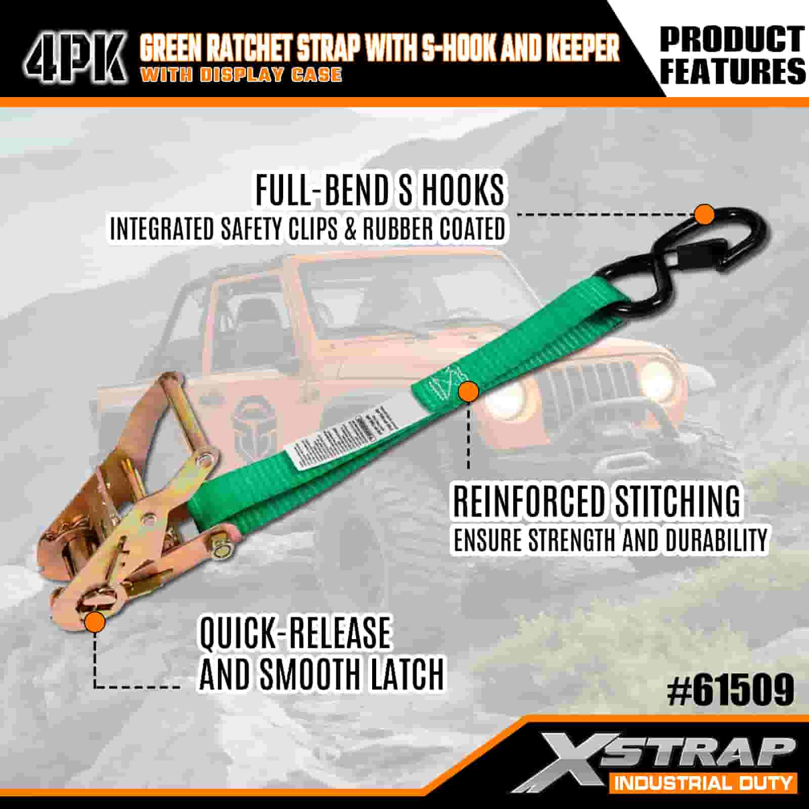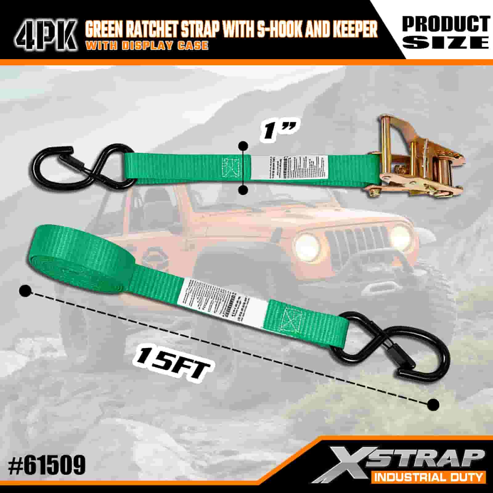 Xstrap 4 balení ráčnového popruhu s bezpečnostními S háčky, 1" x 15" polyesterový upínací popruh stahovací ráčnový popruh, nosnost 400 liber, upevňovací popruhy pro uchycení nákladu s bezpečnostními S háčky pro vážné profesionály k zajištění nákladního přívěsu, plochého přívěsu, lyžařského člunu, malého auta.