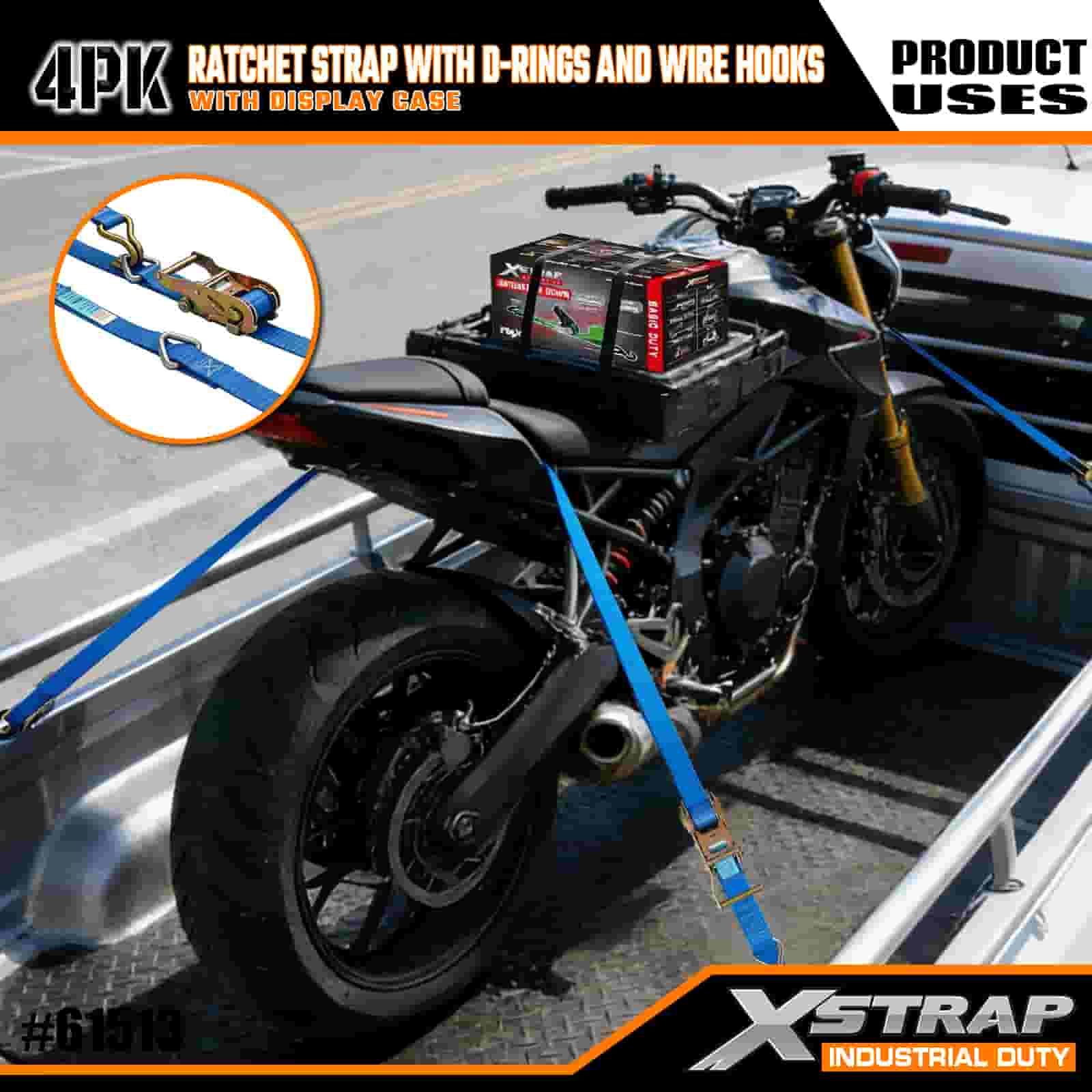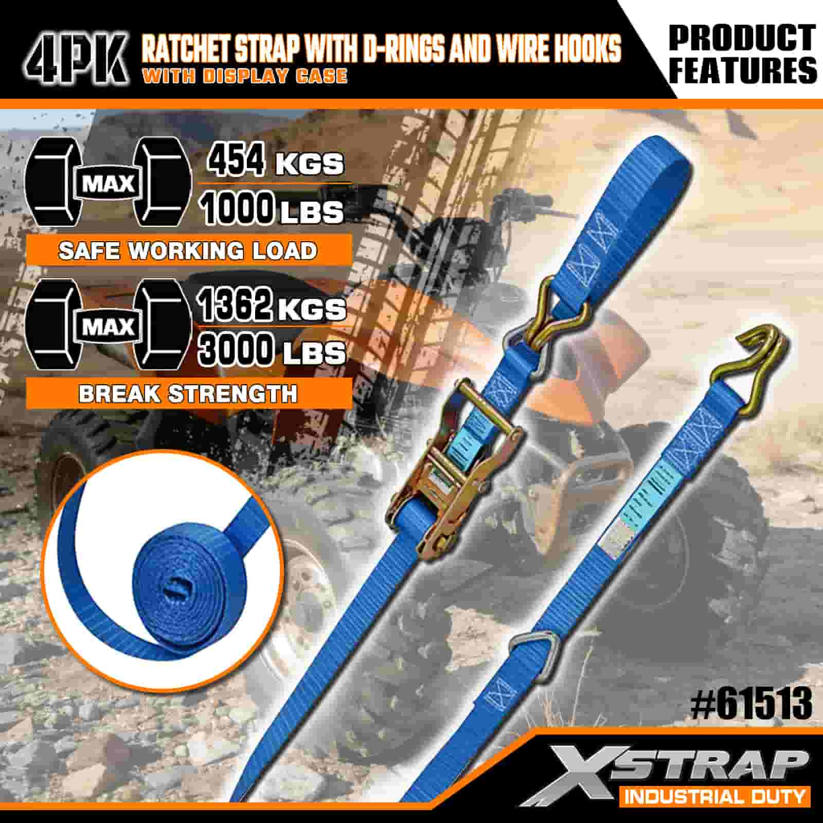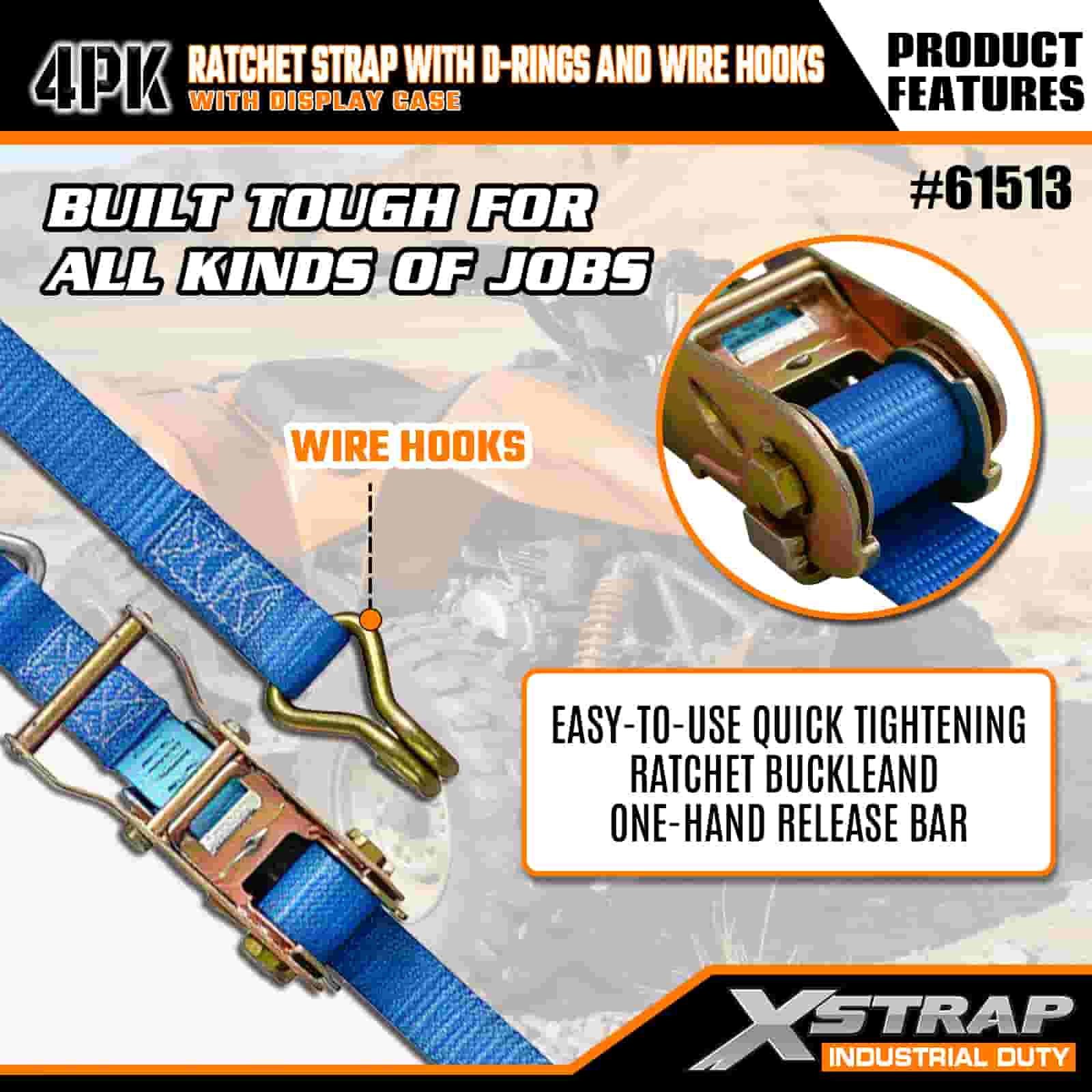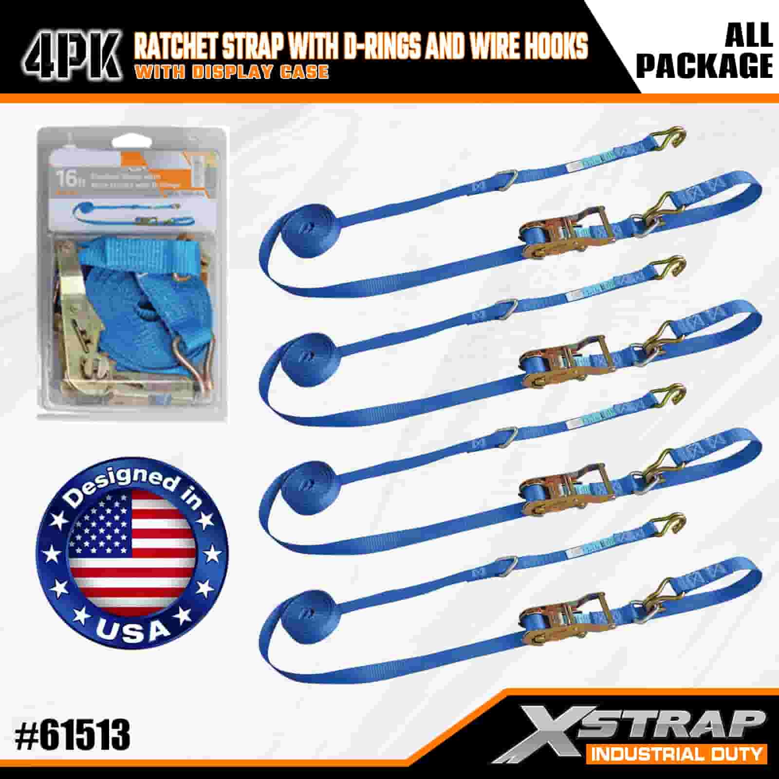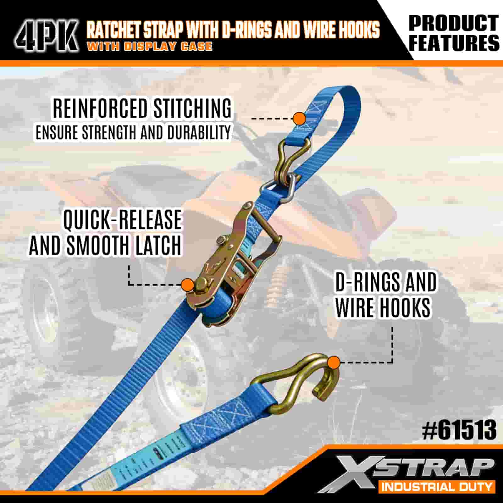 Xstrap 4 balení ráčnového popruhu s D kroužky a drátěnými háčky, 1" x 16" polyesterový upínací popruh stahovací ráčnový popruh, kapacita 1000 liber Upevňovací popruhy pro náklad s drátěnými háčky pro vážné profesionály k zajištění nákladního přívěsu, plochého přívěsu, lyžařského člunu, malého auta.