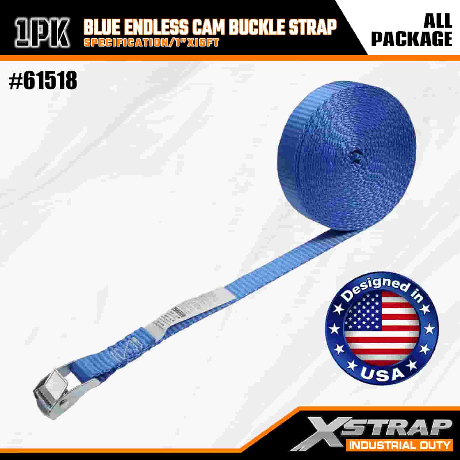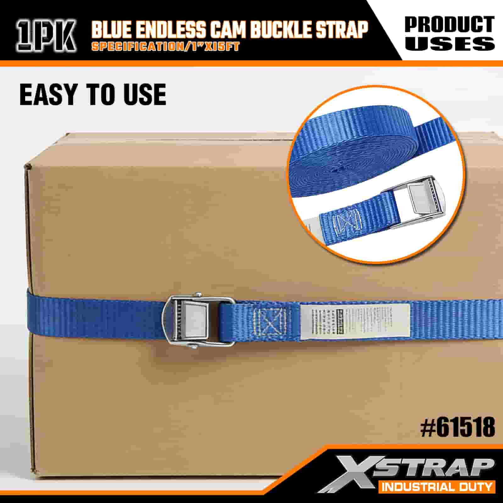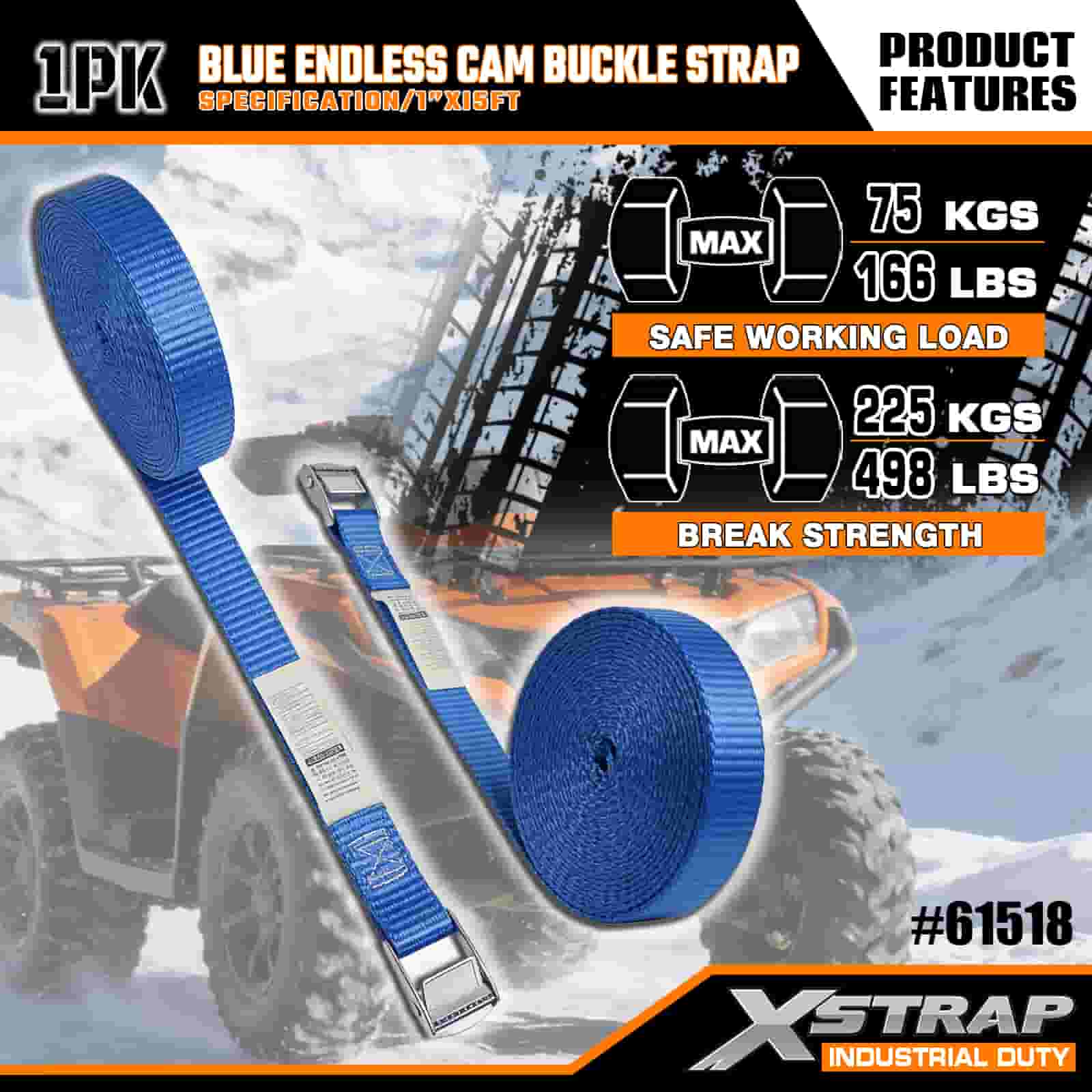 Xstrap Modrá Endless Cam Buckle Strap, 1” x 15' polyesterový upínací popruh s ráčnou, 166 lbs kapacitní popruhy pro upevnění nákladu pro seriózní profesionály k zajištění nákladního přívěsu, plochého přívěsu, lyžařského člunu, malého auta.