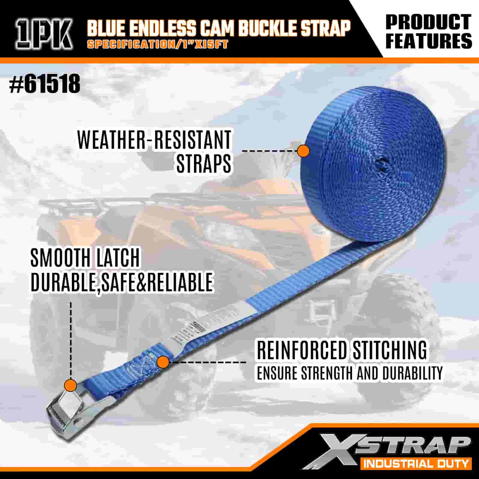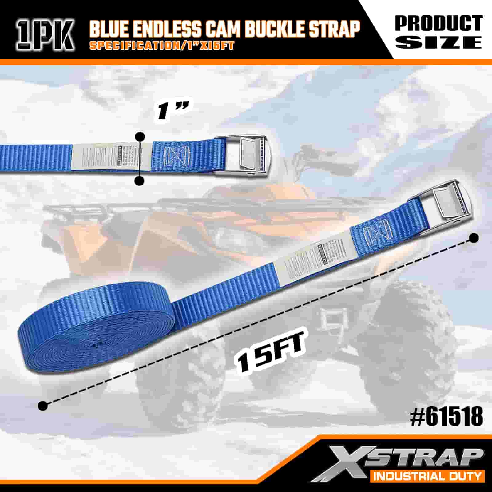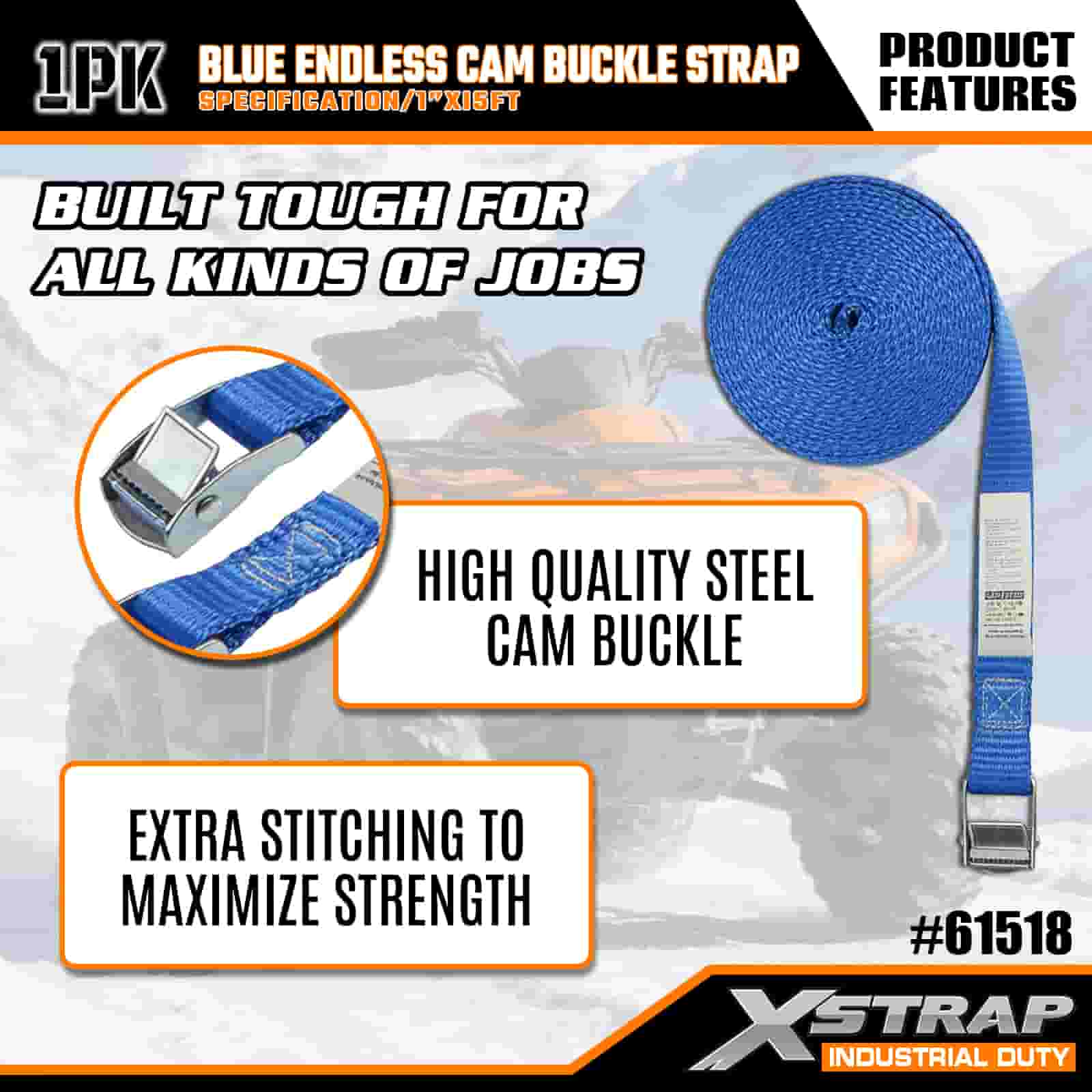 Xstrap Modrá Endless Cam Buckle Strap, 1” x 15' polyesterový upínací popruh s ráčnou, 166 lbs kapacitní popruhy pro upevnění nákladu pro seriózní profesionály k zajištění nákladního přívěsu, plochého přívěsu, lyžařského člunu, malého auta.