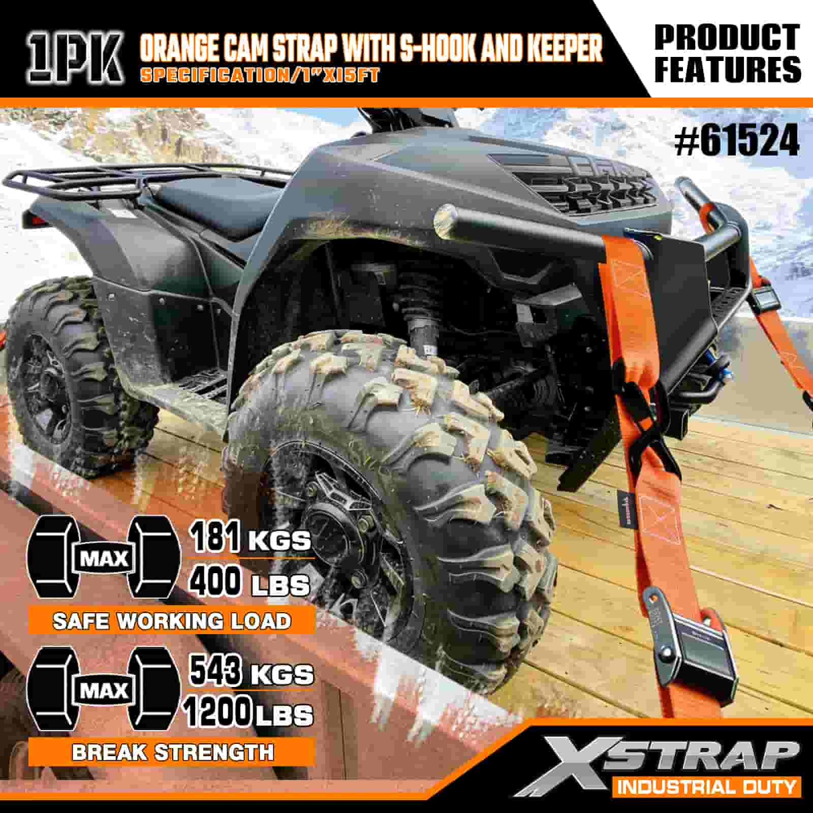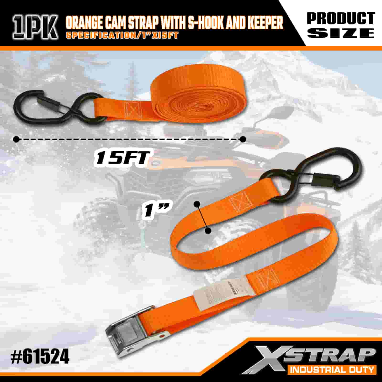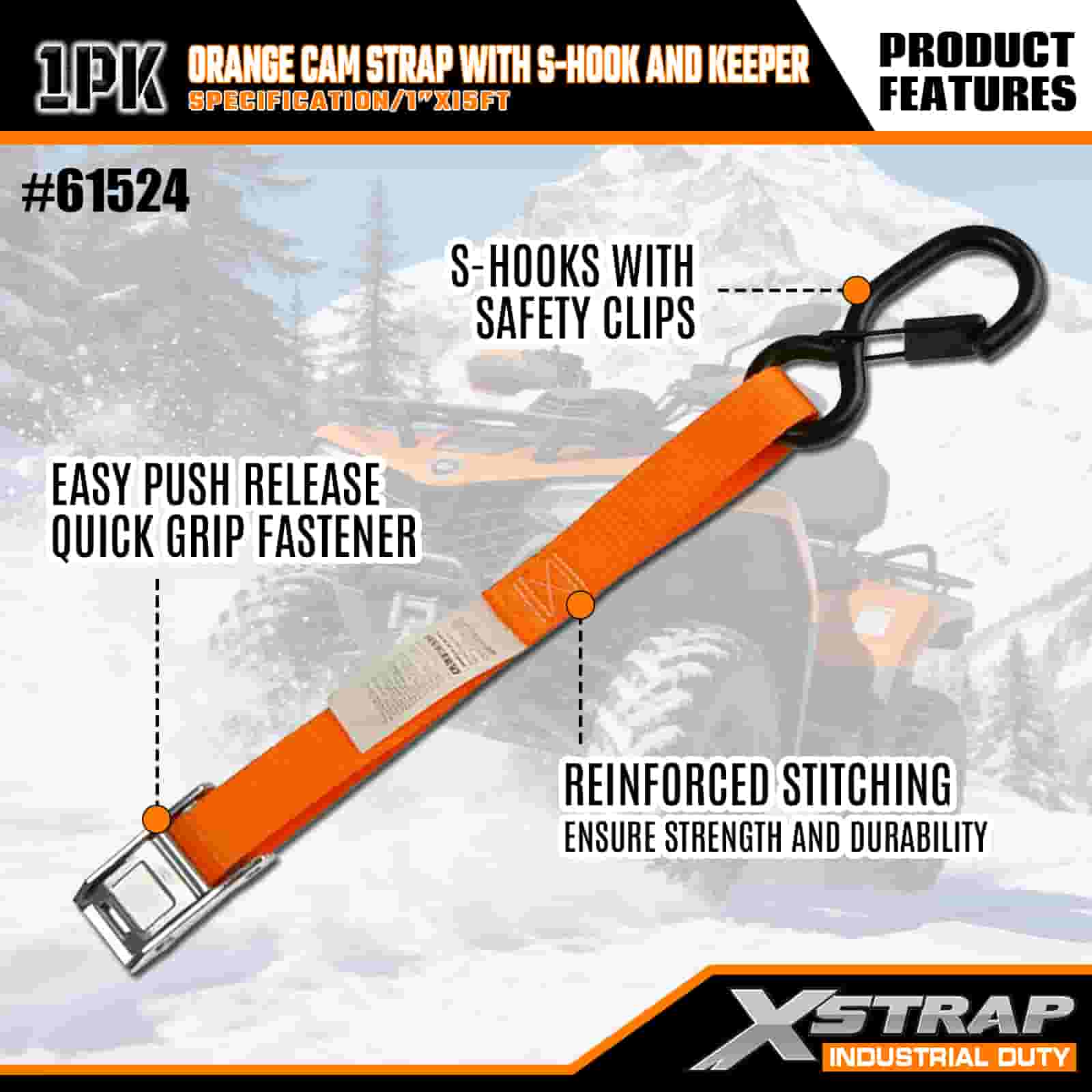 Xstrap Qrange Cam popruh s S-háčkem a držákem, 1" x 15" polyesterový upínací popruh s ráčnovým popruhem, 400 liber kapacitní popruhy pro upevnění nákladu s bezpečnostními S háčky pro vážné profesionály k zajištění nákladního přívěsu, plochého přívěsu, lyžařského člunu, malého auta.