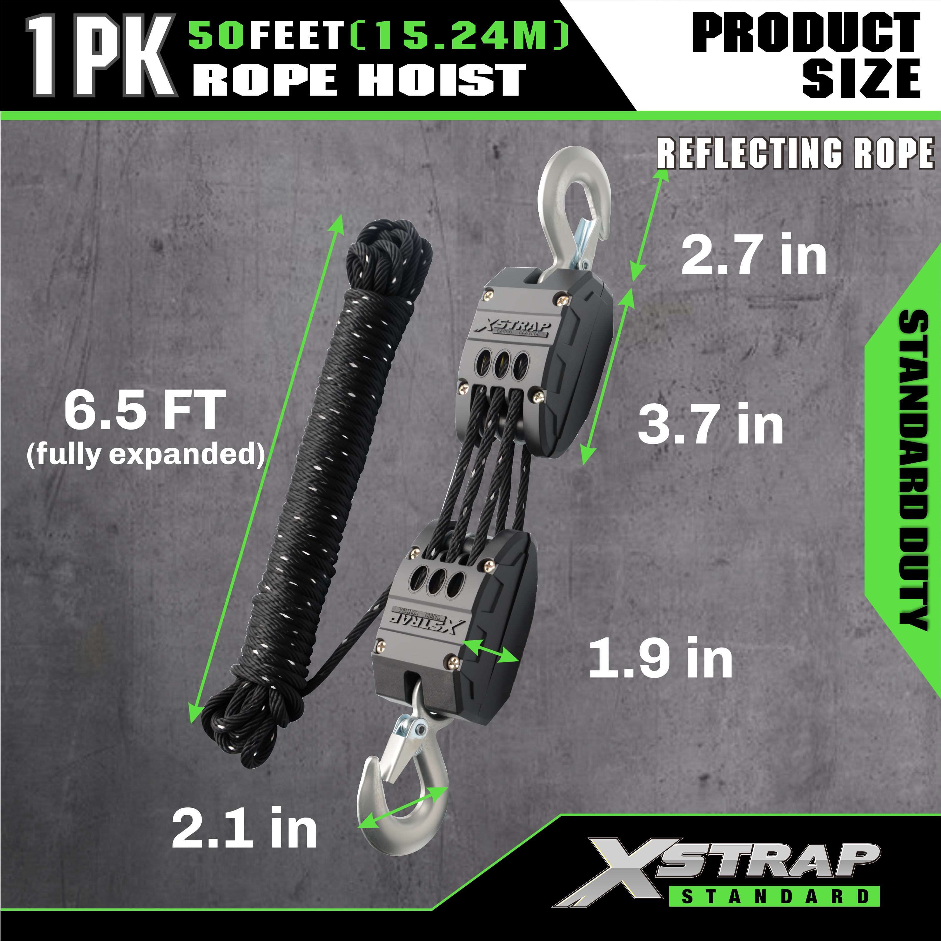 Jedná se o XSTRAP STANDARD Reflexní kladkostroj pro těžké zatížení 2 000 LB. Je navržen s 50 stopovým blokem kol a systémem nářadí. A v této sadě jsou také 2pk 18 palcové měkké smyčky a 1 pár pracovních rukavic.