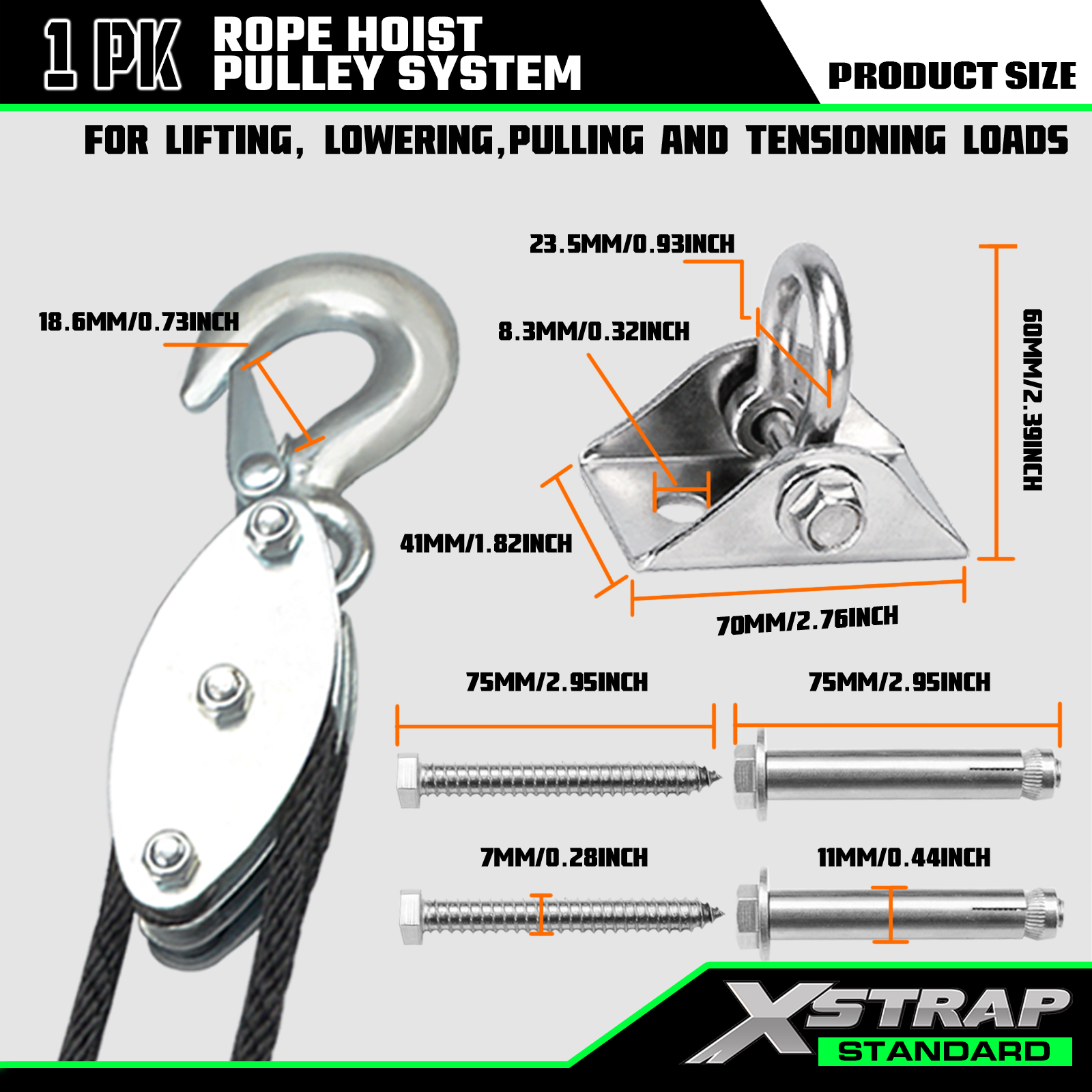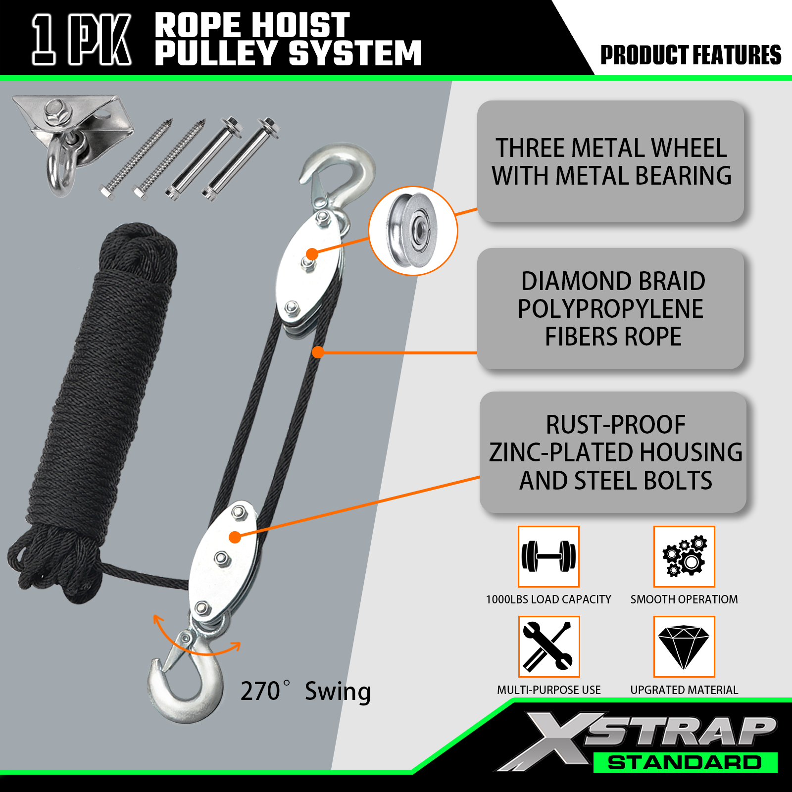- Vysoká nosnost: bezpečné pracovní zatížení je 1000 liber a pevnost v přetržení je 2000 liber. Lanový kladkostroj může pomoci zvedat těžké i lehké předměty současně. Není třeba se obávat poškození vlivem nadměrné zátěže.