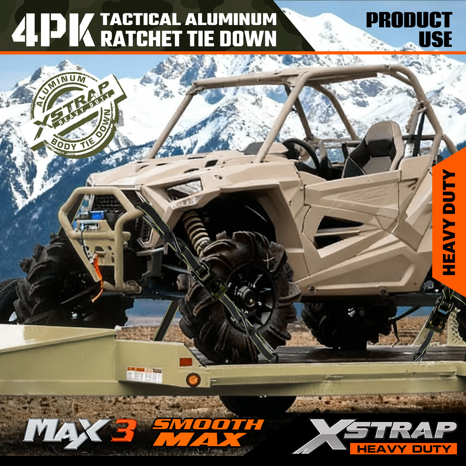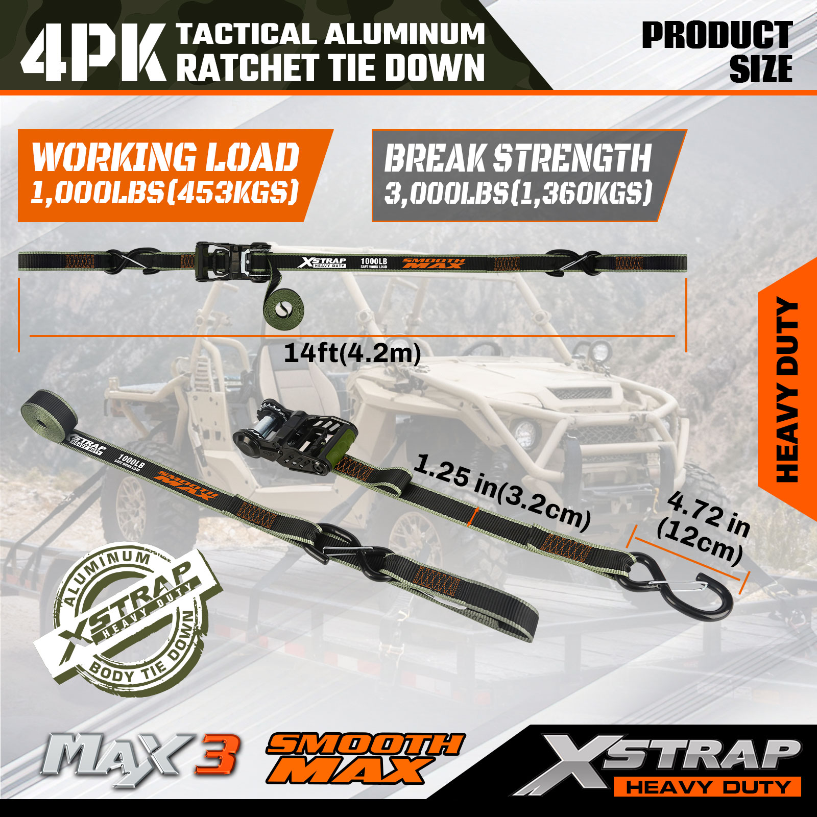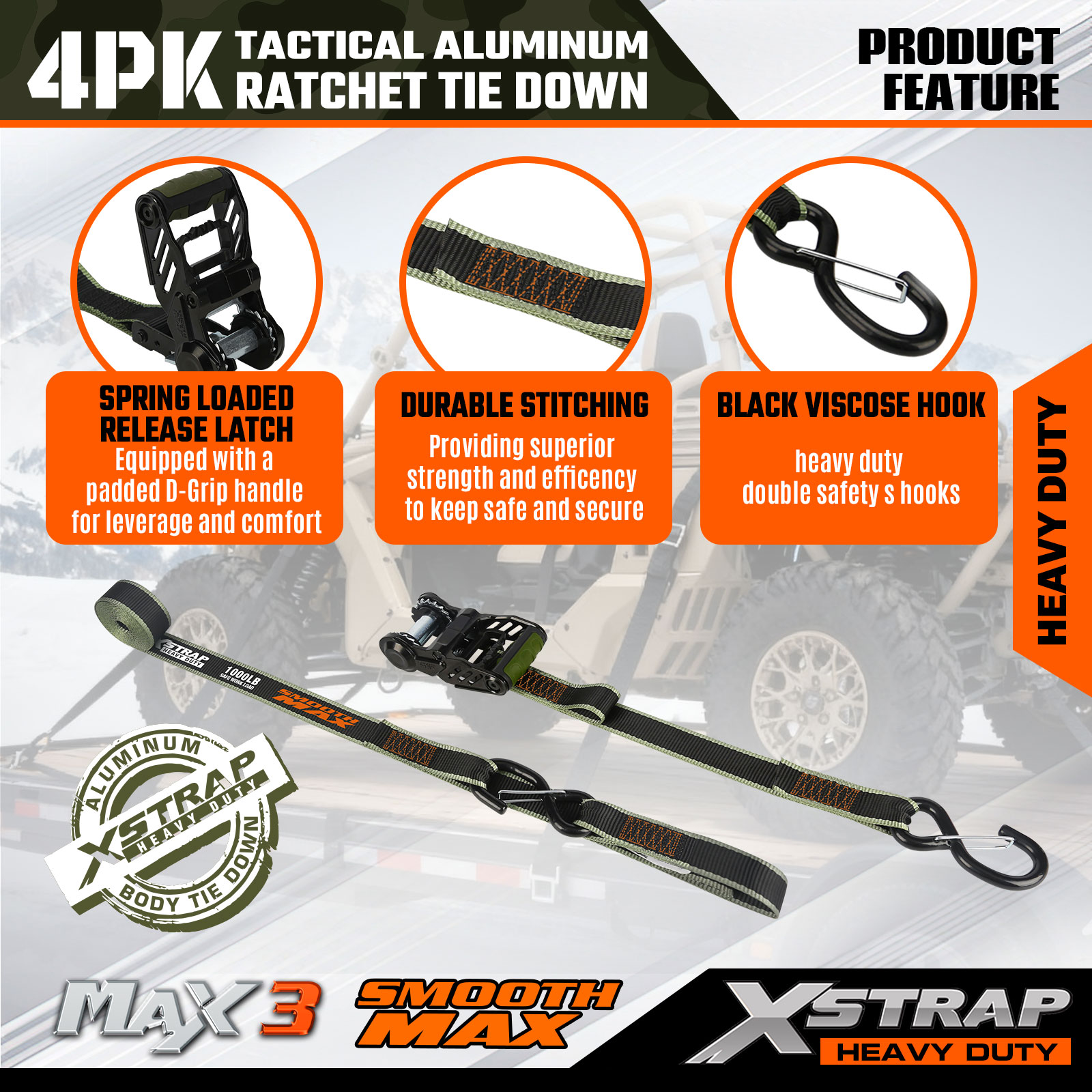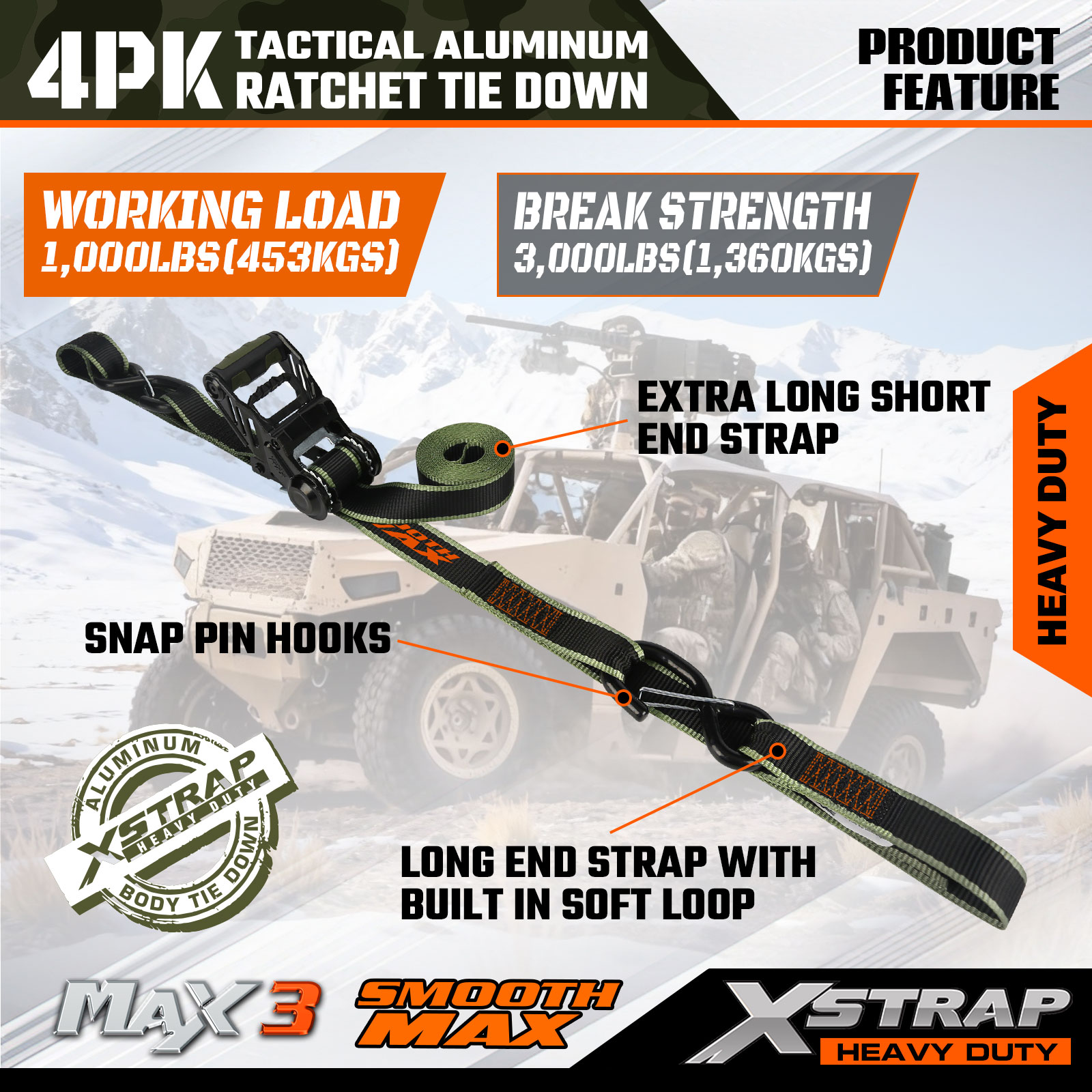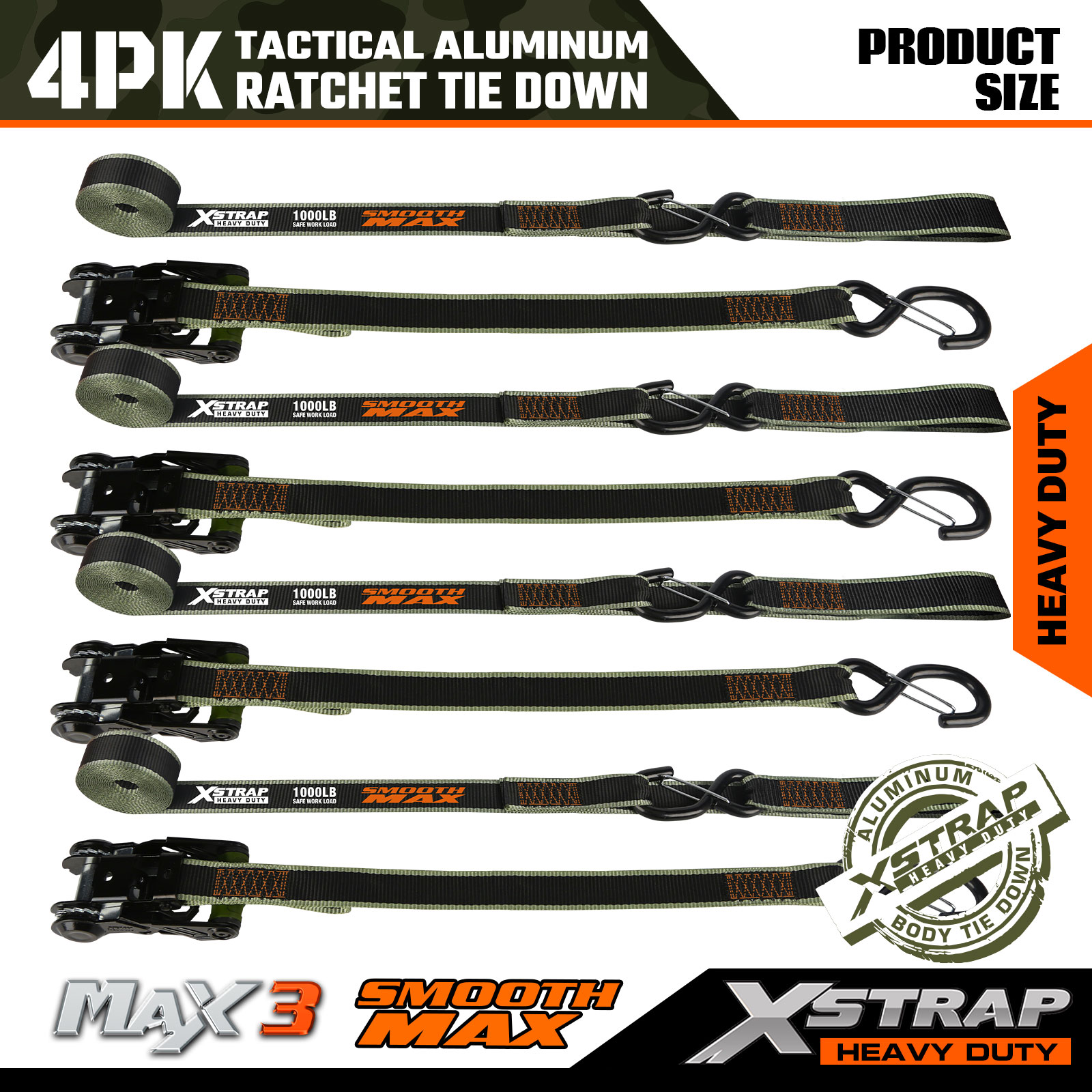 Tactical Ratchet Tie Downs Xstrap jsou pevnější a snáze se používají než standardní ráčnové vázací pásky. Konstrukce měkké smyčky může pomoci zajistit náklad bez poškození laku nebo chromu. Diamantová vroubkovaná rukojeť umožňuje lepší uchopení a pryžové nárazníky podél ráčny chrání váš náklad před poškrábáním. Řemínek se vyznačuje přesným převodem díky 16 zubům podél ozubeného kola ráčny.