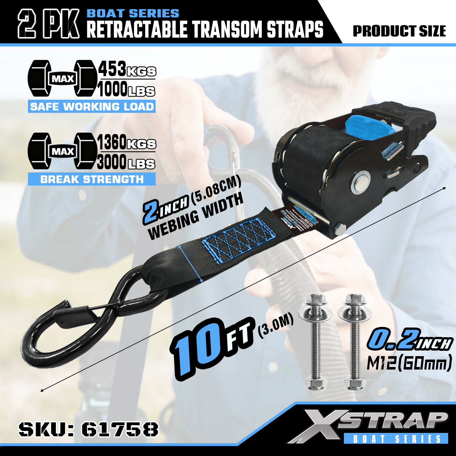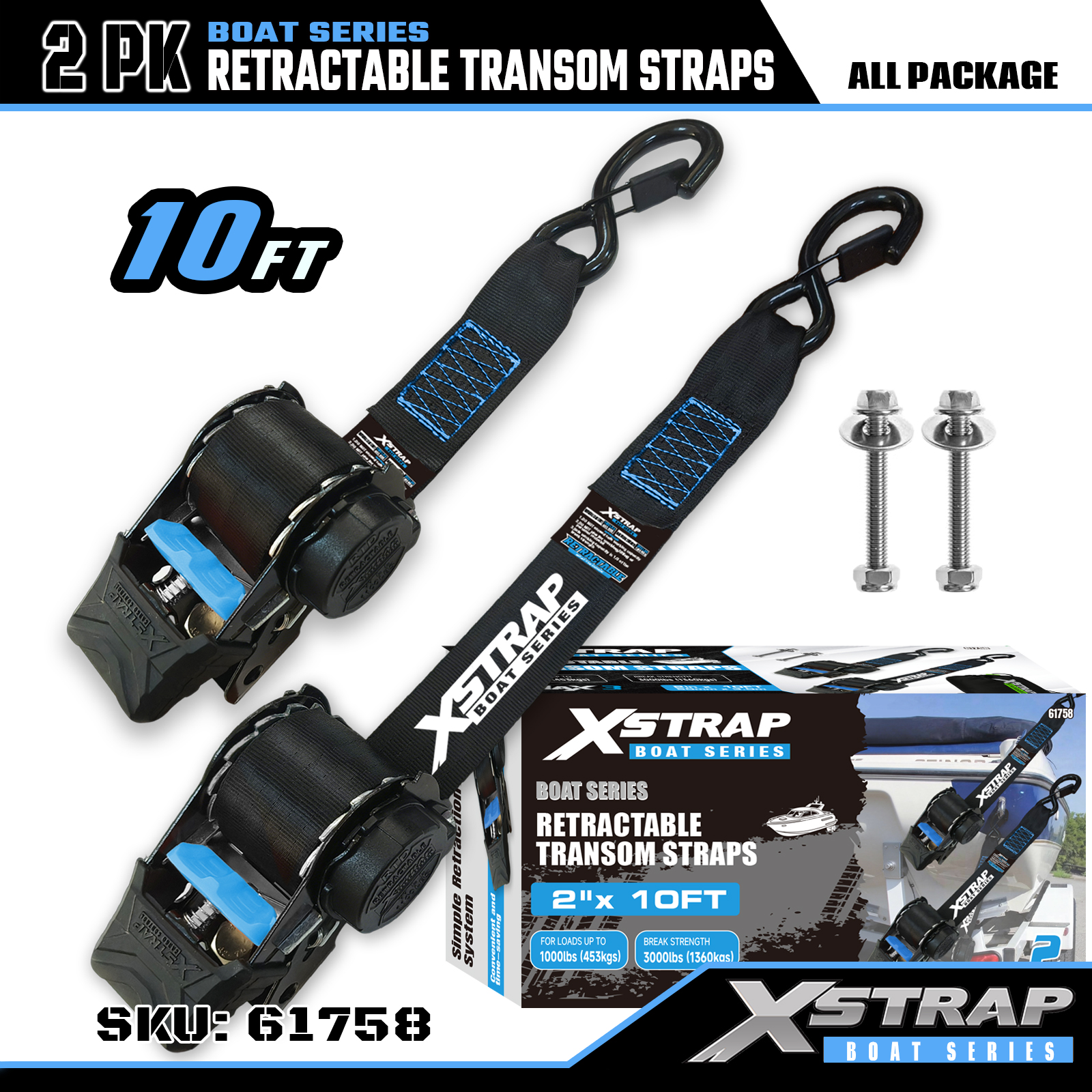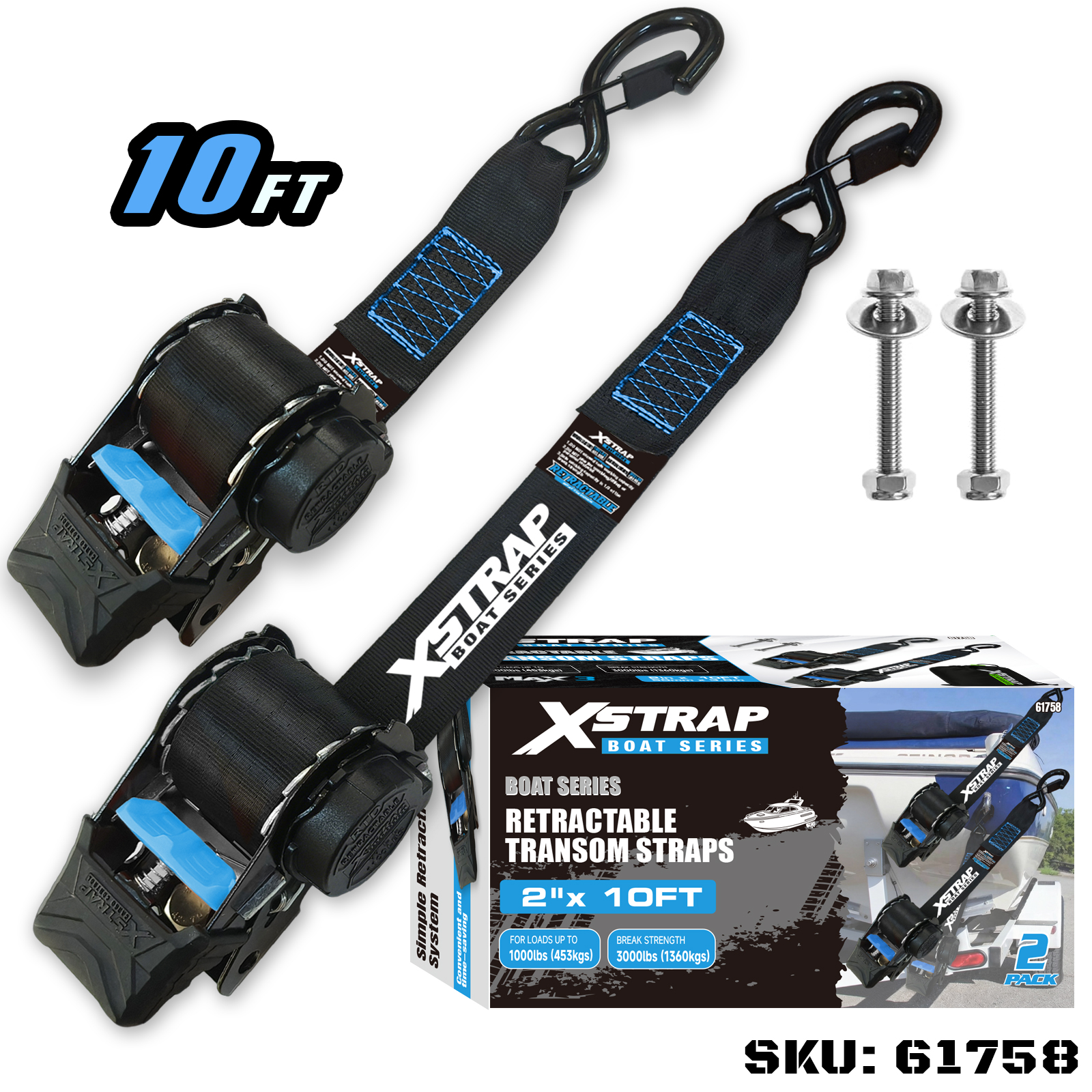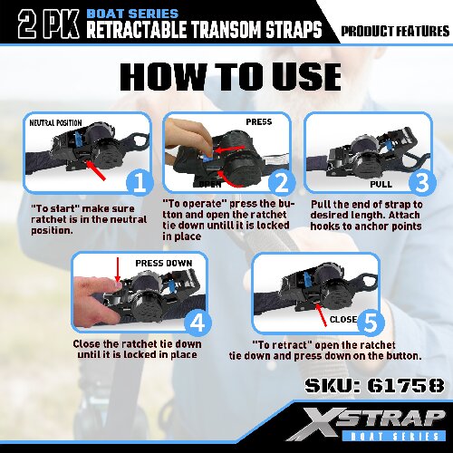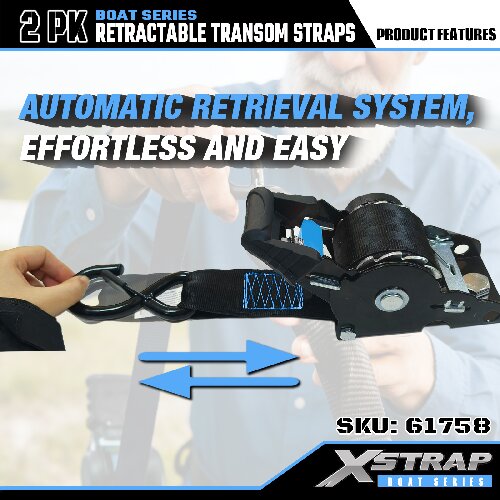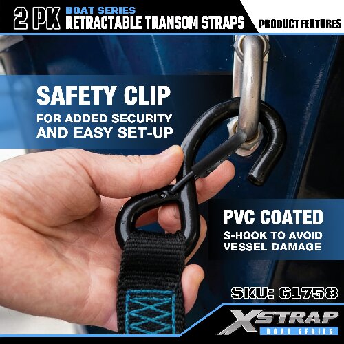 Jedná se o zatahovací popruhy Xstrap s bezpečnostními S háčky. Bezpečné pracovní zatížení je 1 000 liber a pevnost v lomu je 3 000 liber.