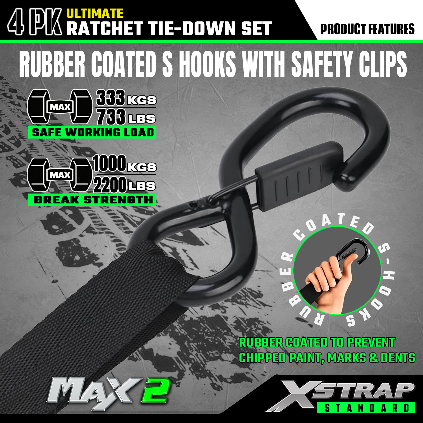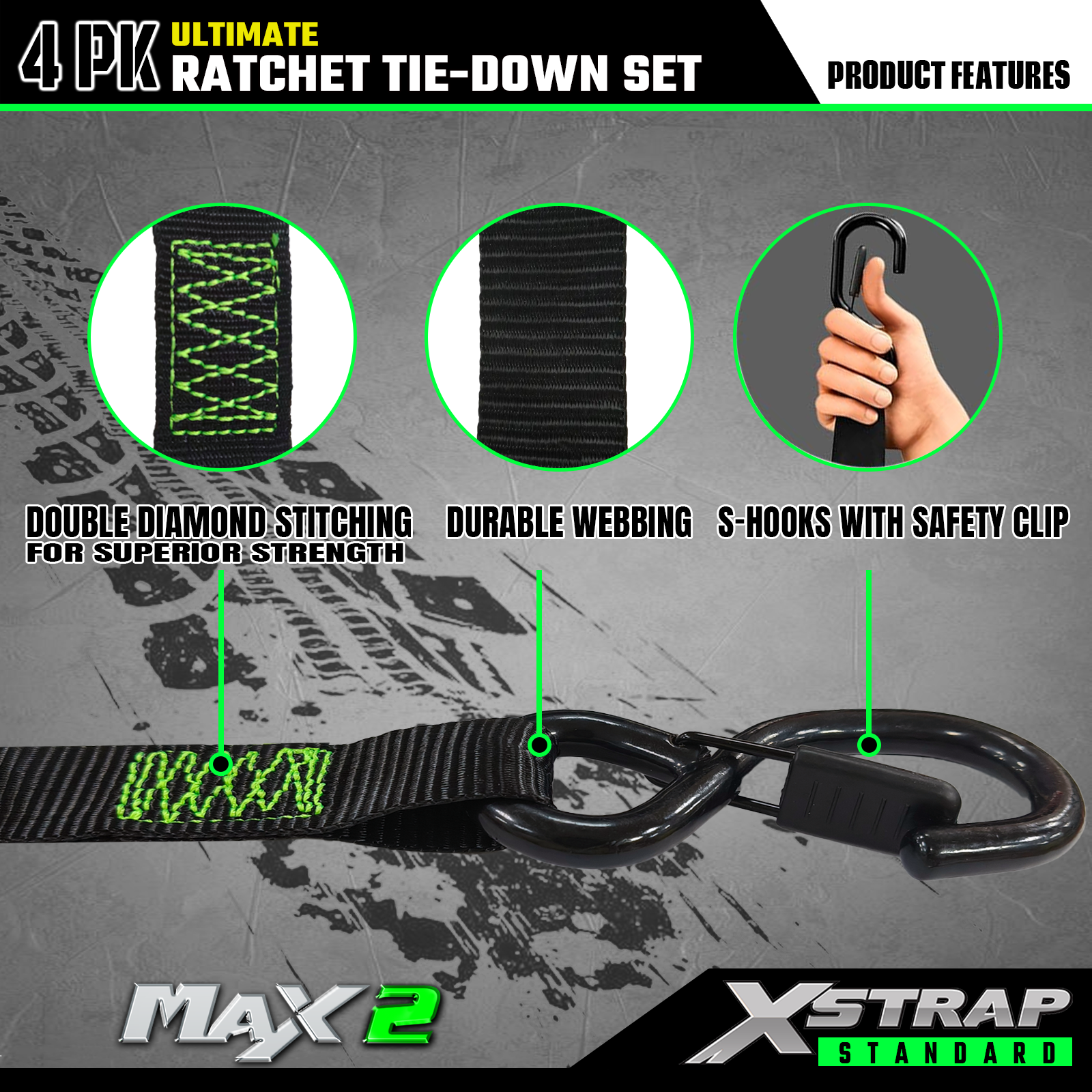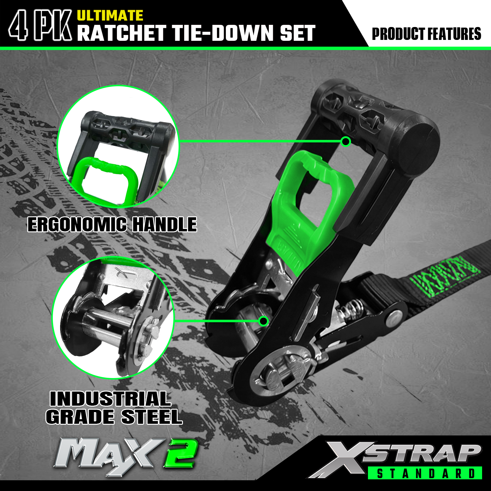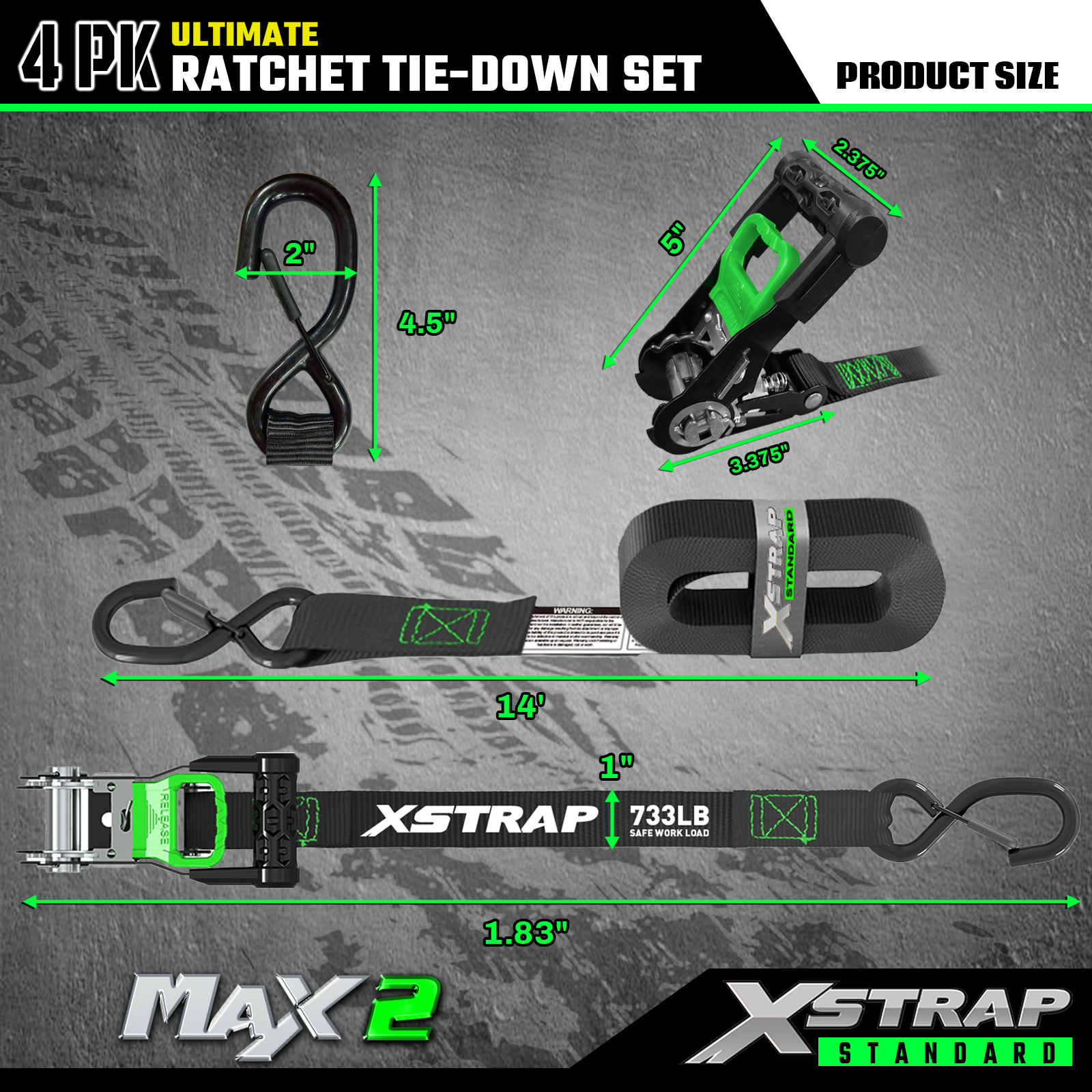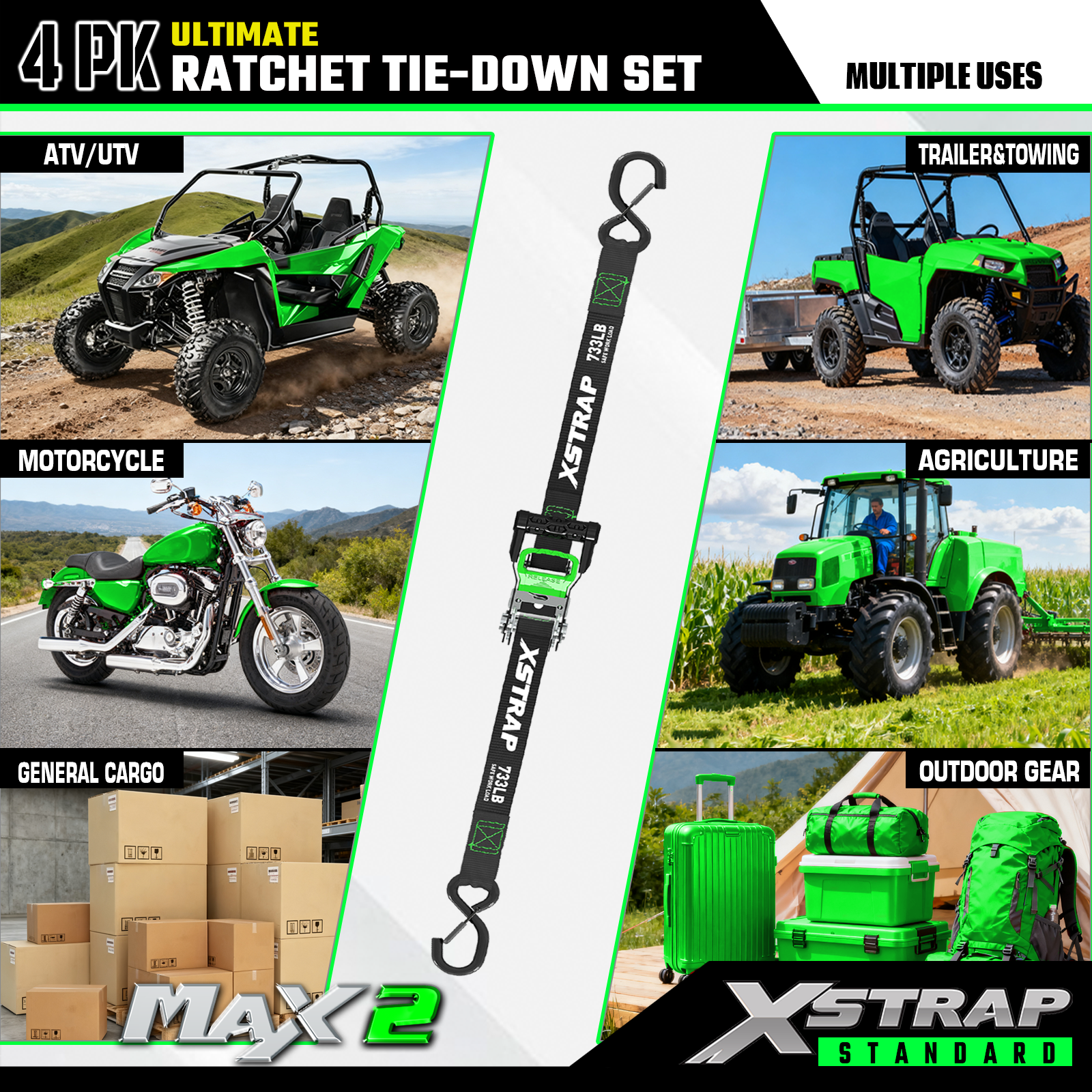 - Spolehlivá přeprava: 4ks ráčnové upínací popruhy nabízí 733 lb SWL a 2 200 lb BS. Dokáže zajistit bezpečnou přepravu motocyklů, spotřebičů a zahradního vybavení