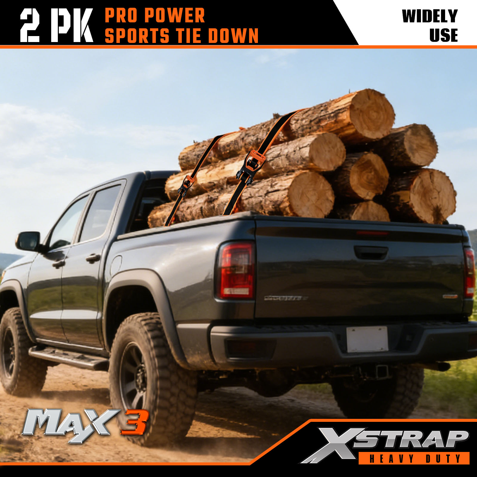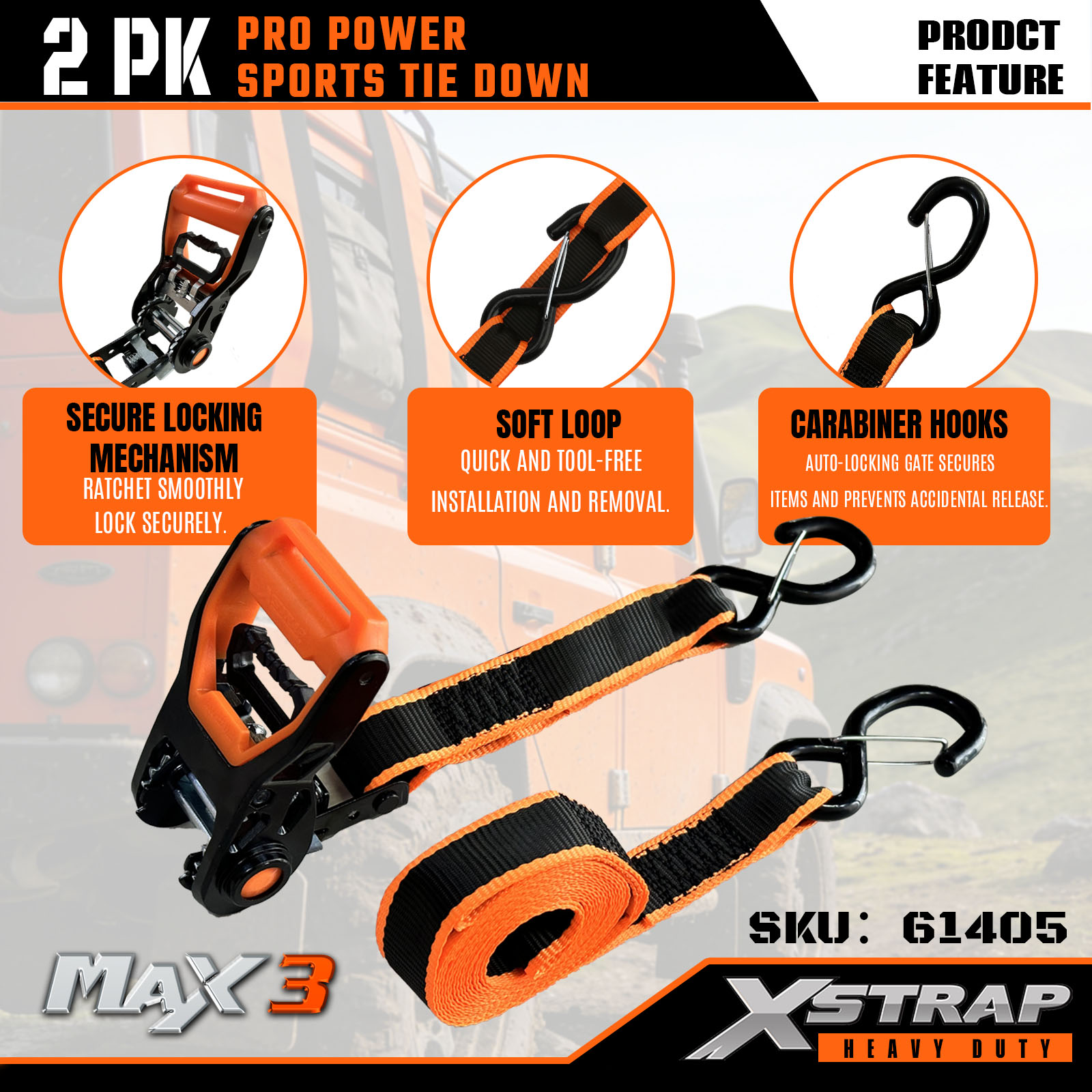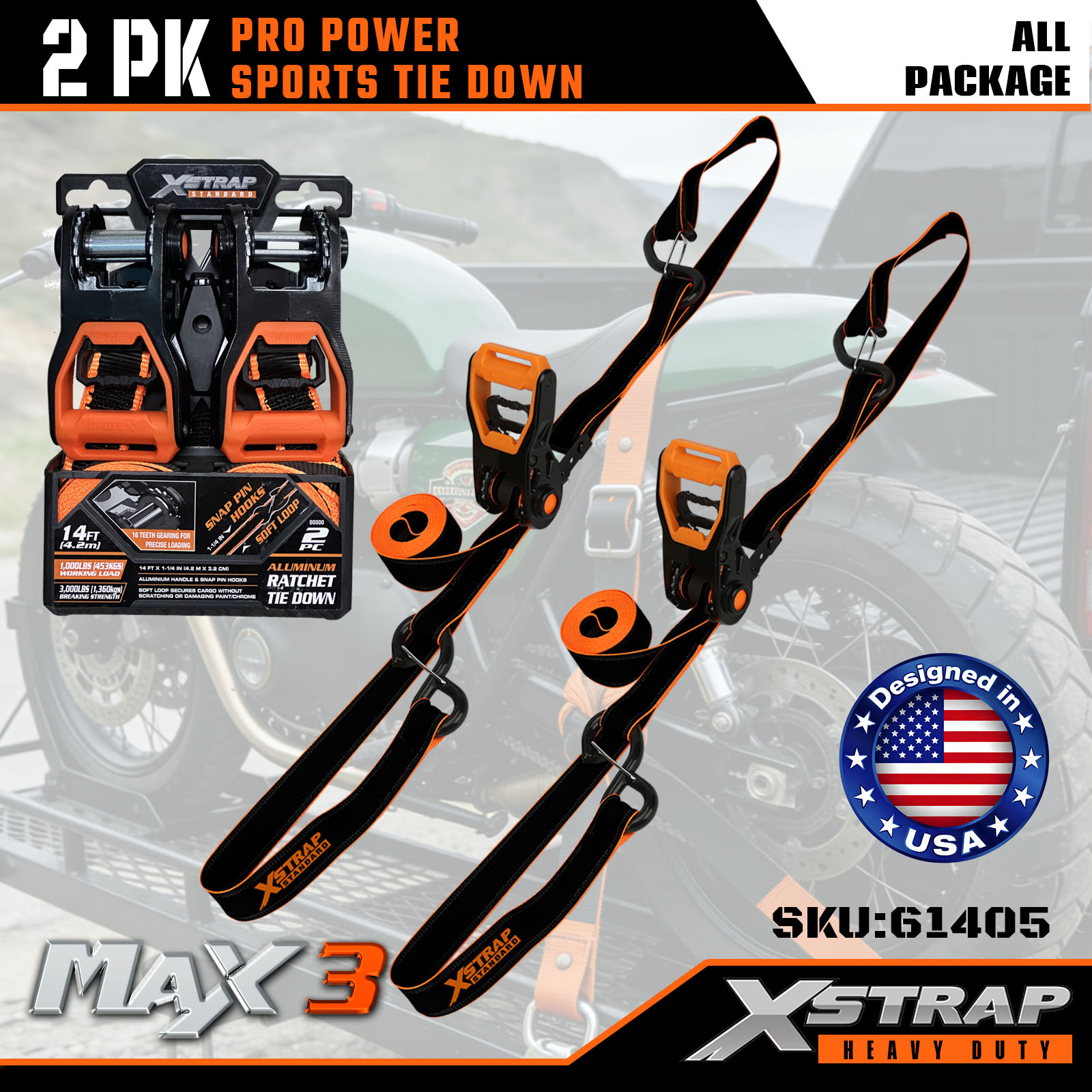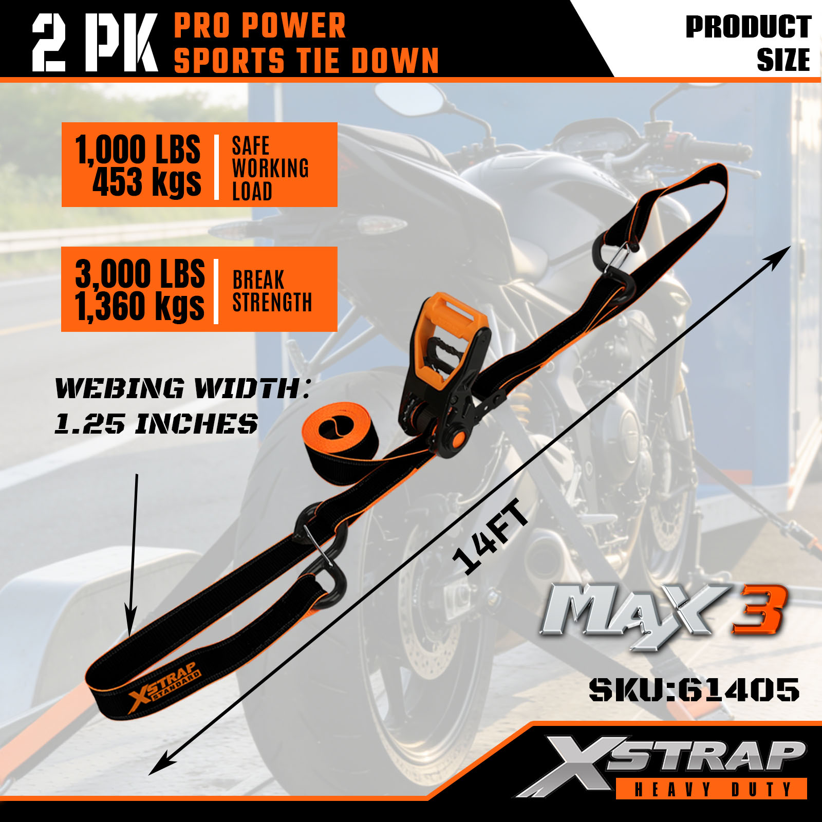 Xstrap 2 Pack PRO Power Sports upínací popruhy, 1-1/4” x 14' Polyesterový upínací popruh s ráčnou, popruhy pro upevnění nákladu s kapacitou 1 000 lb s karabinami pro nákladní automobily, SUV, motocykly s horním nosičem.