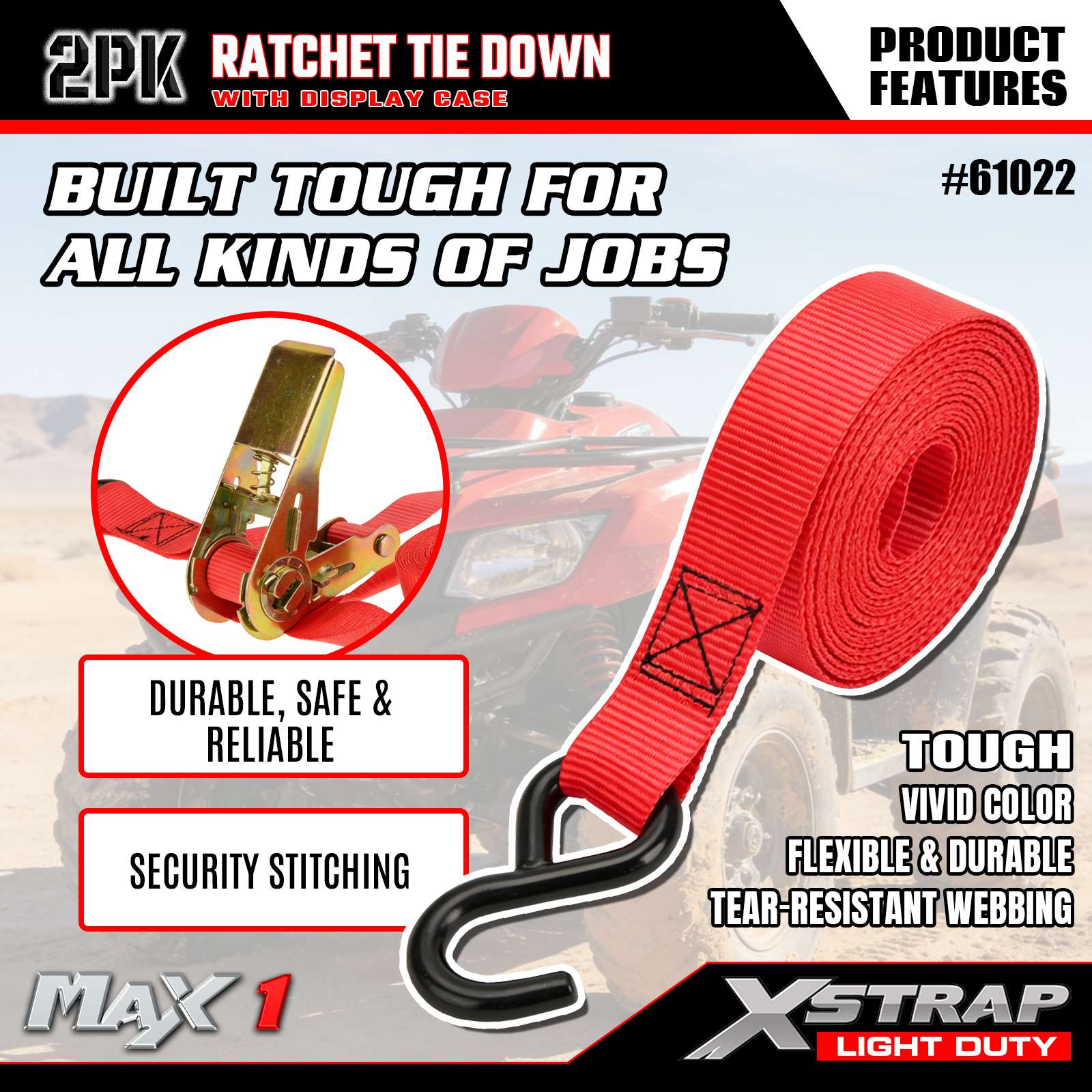 Upínací popruhy Xstrap 2PK s ráčnou jsou 1 x 10 stop, bezpečné pracovní zatížení je 300 liber a pevnost v přetržení je 900 liber.