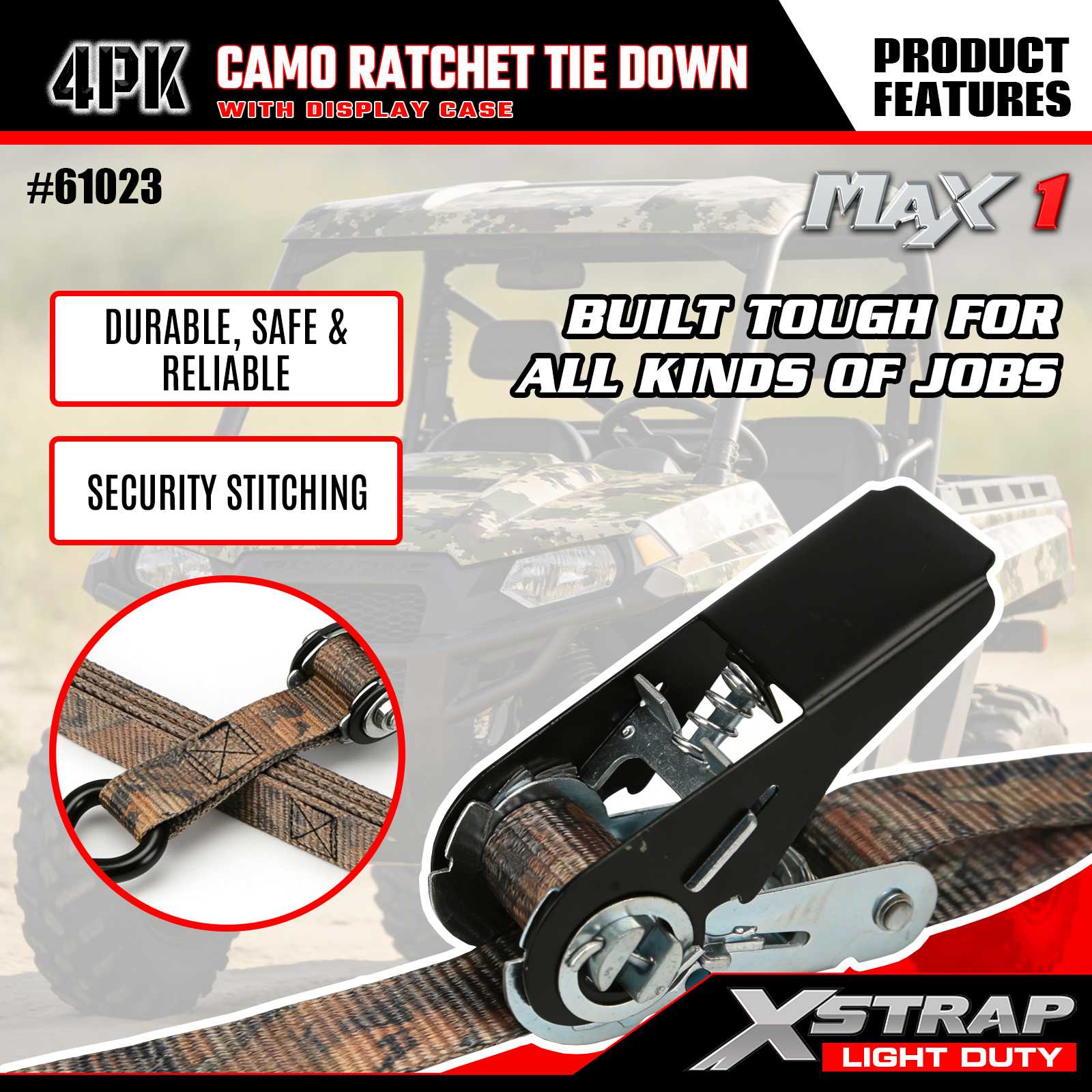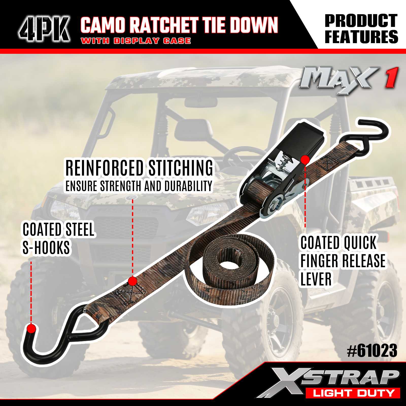 Upínací popruhy Xstrap 4PK CAMO s ráčnou jsou 1 x 10 stop, bezpečné pracovní zatížení je 300 liber a pevnost v přetržení je 900 liber.