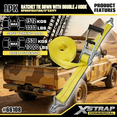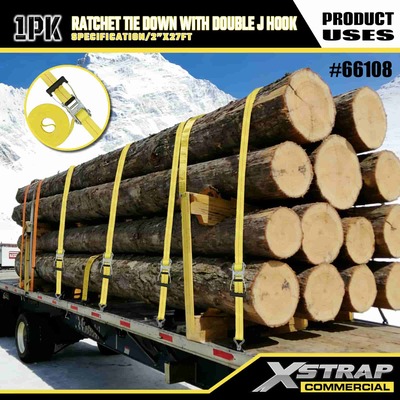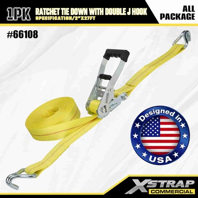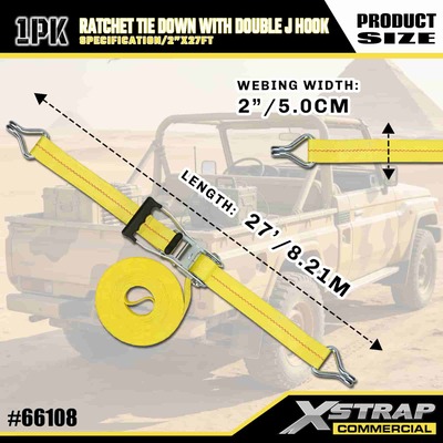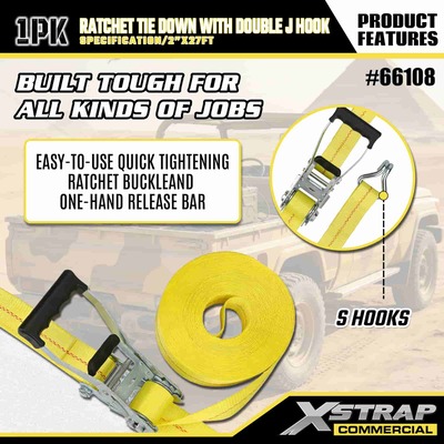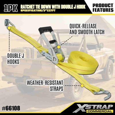 Xstrap Ratchet Uvazovací s dvojitými J háky, 2” x 27” Polyesterový upínací popruh Ráčcový popruh s kapacitou 3333 lbs kapacita přivazování nákladu s dvojitými J háky pro nákladní pickup, SUV, motocykly s horním nosičem.