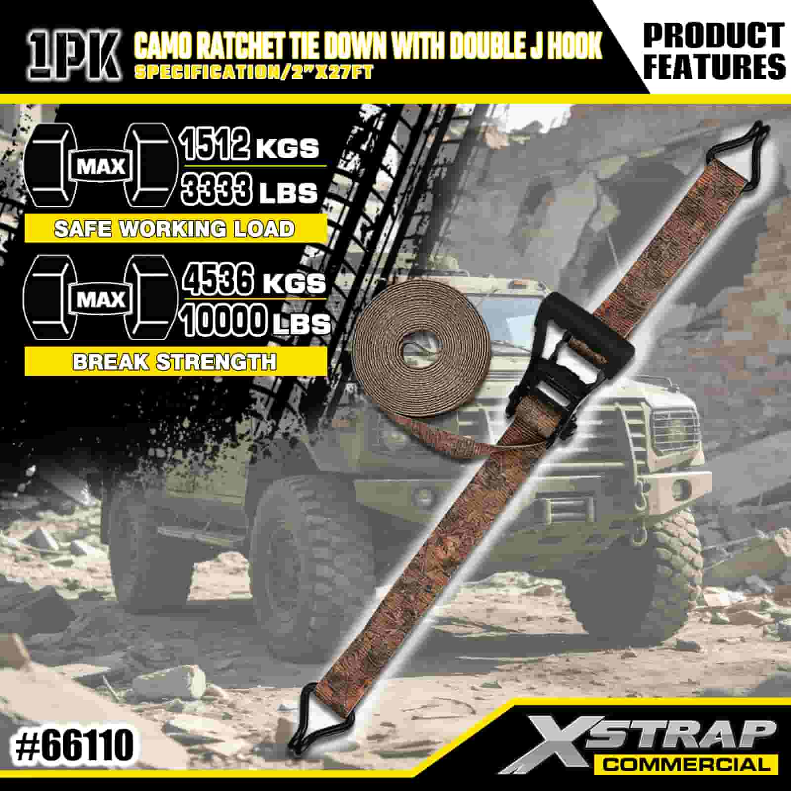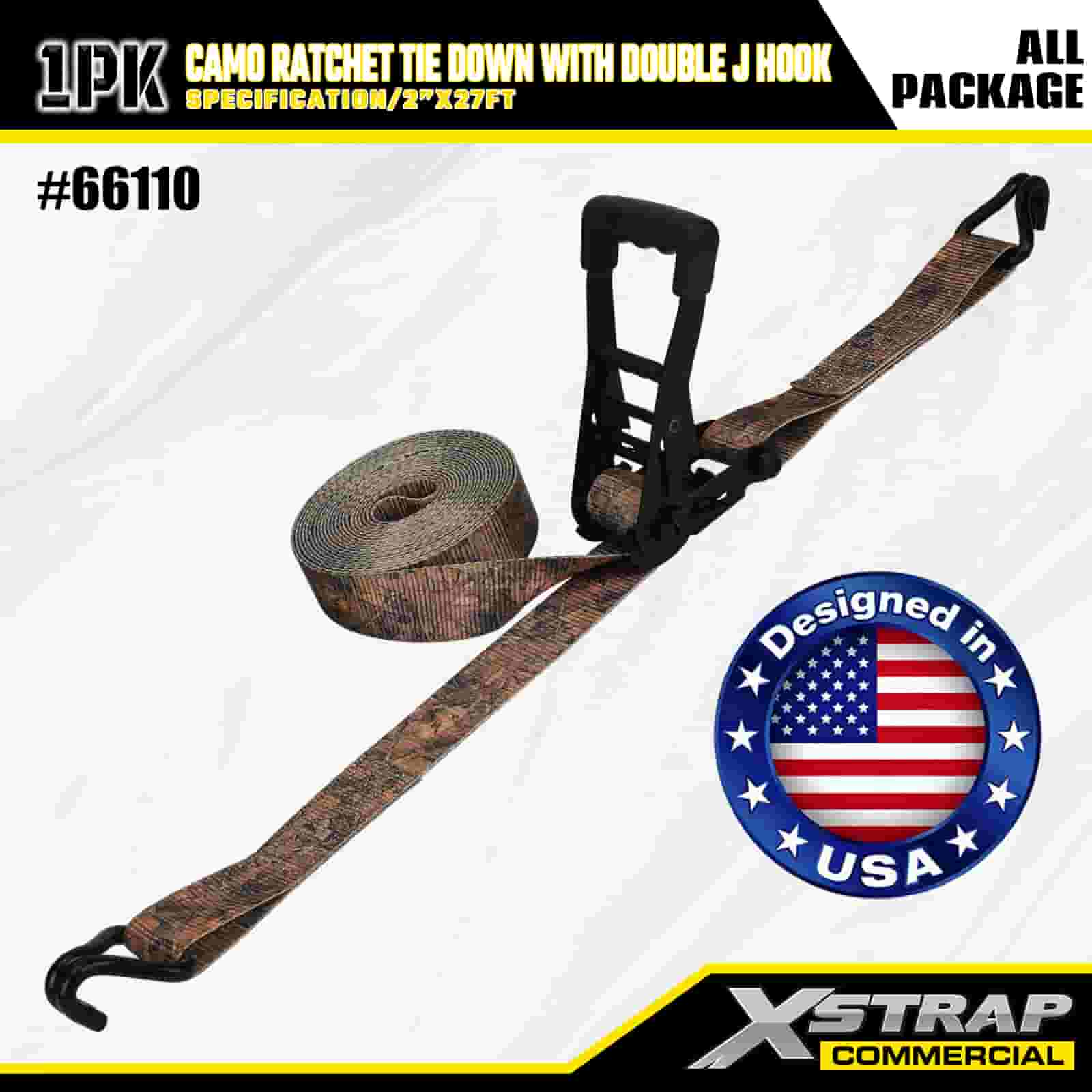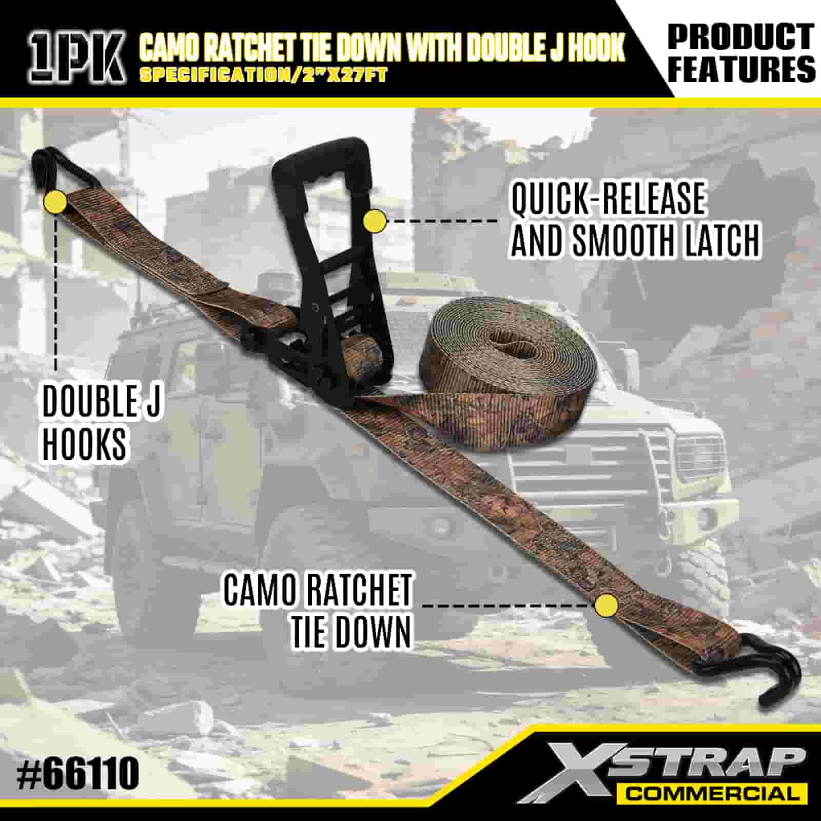 Xstrap CAMO Ratchet Uvazovací s dvojitými J háky , 2” x 27' Polyesterový upínací popruh Stahovací ráčnový popruh, Kapacita 3333 lbs Uvazovací popruhy pro zajištění nákladu s Dvojitými J háky pro pickup s řízením nákladu, SUV, motocykly s horním stojanem.