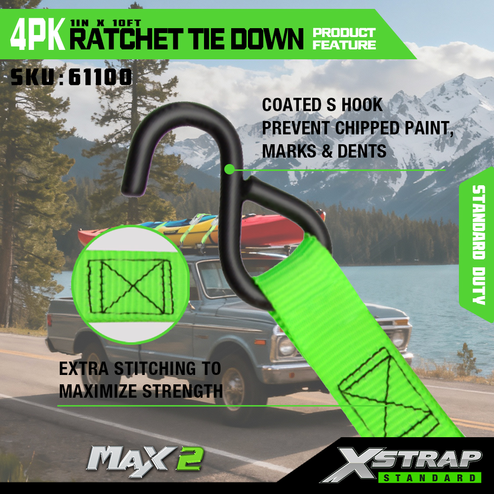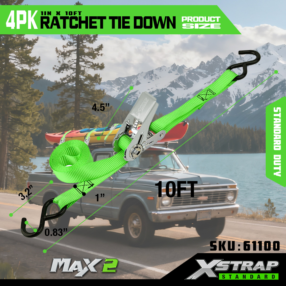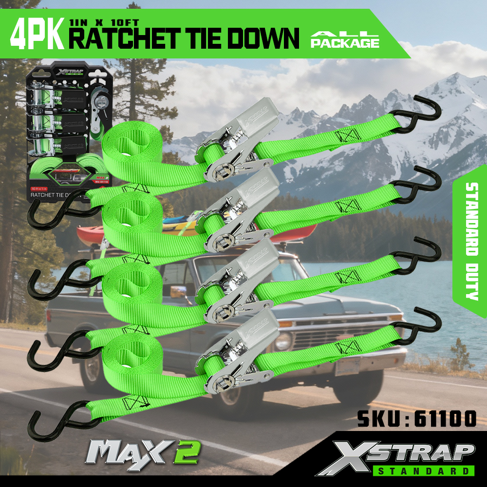 Xstrap 4 Pack Ratchet Tie Down, 1” x 15' Polyesterový upínací popruh stahovací ráčnový popruh, 500 lbs kapacitní popruhy pro upevnění nákladu s háky S pro pickup, lehký přívěsný motocykl, lehký rybářský člun, vodní skútr, sněžný skútr.