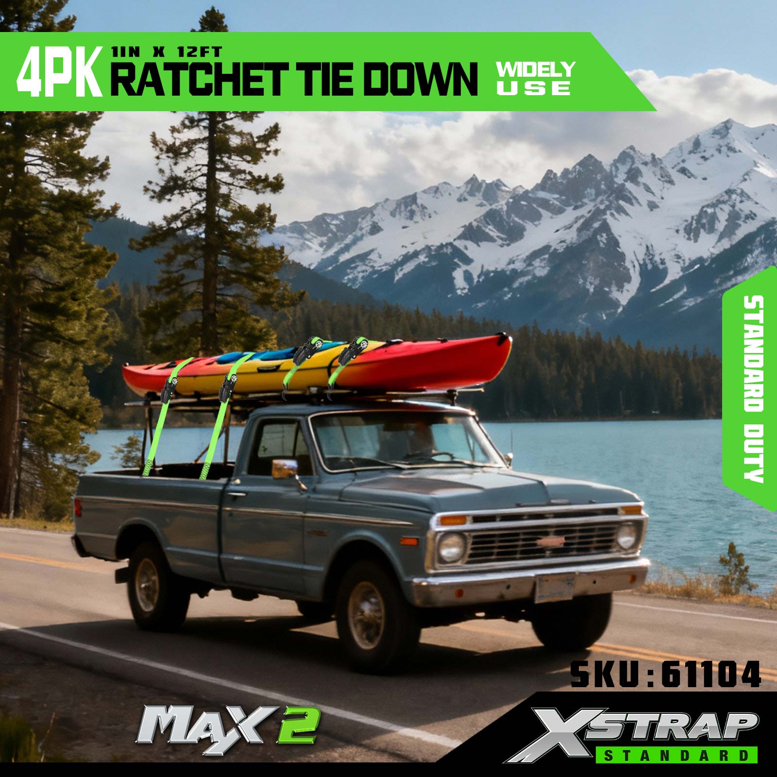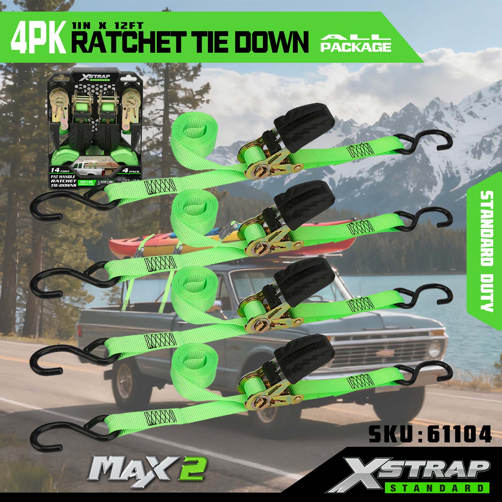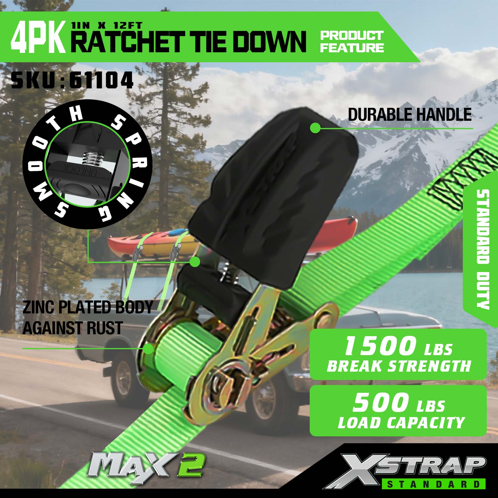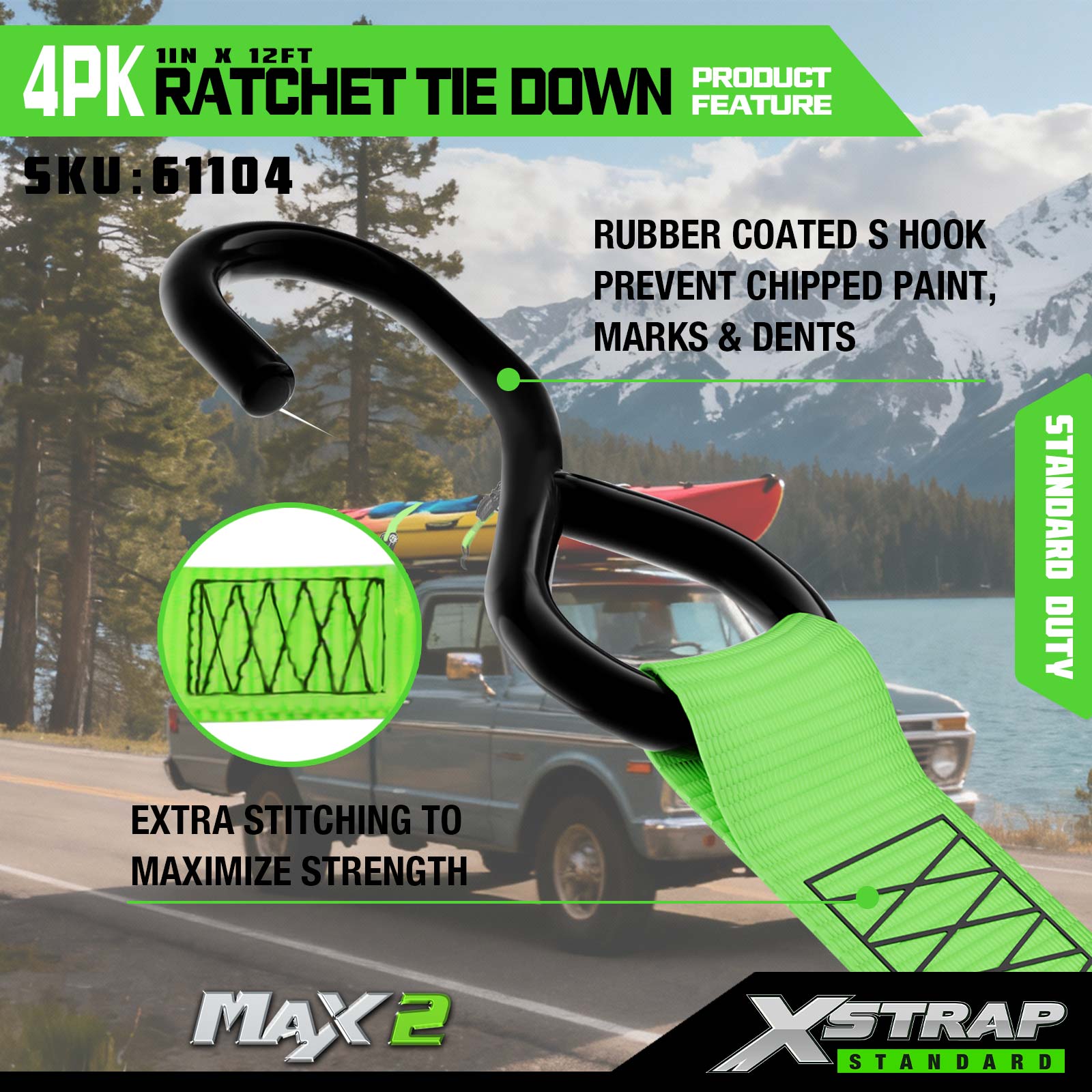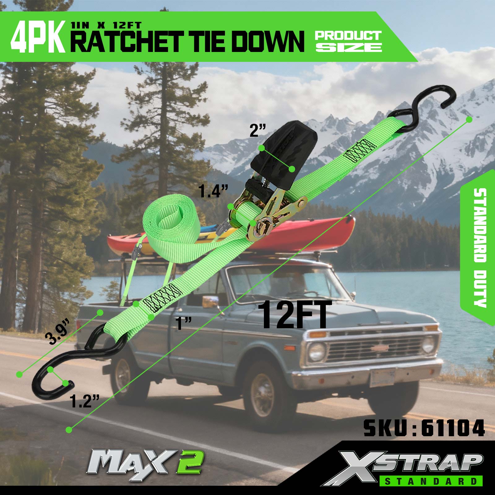 Xstrap 4 Pack Ratchet Tie Down, 1” x 12' polyesterový upínací popruh stahovací ráčnový popruh, 500 lbs kapacitní popruhy pro upevnění nákladu s háky S pro pickup, lehký přívěsný motocykl, lehký rybářský člun, vodní skútr, sněžný skútr.