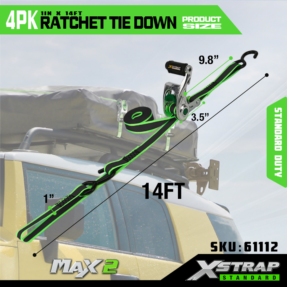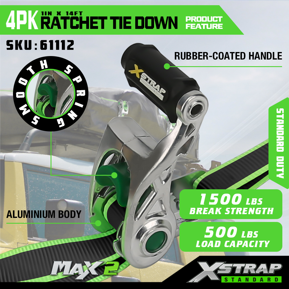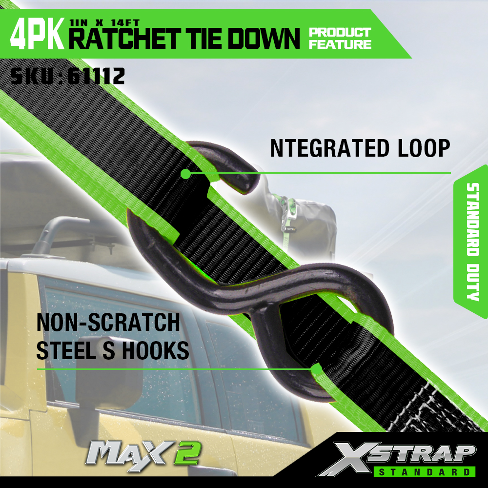 Xstrap 4 Pack upínací popruhy s otevřenou rukojetí, 1" x 14" Polyesterový popruh s ráčnou s měkkou smyčkou, 1500 lbs (500 lbs) Kapacita 1500 lbs (500 lbs) Upevňovací popruhy pro náklad s hliníkovou ráčnou a S háky pro nákladní ATV, nákladní auta